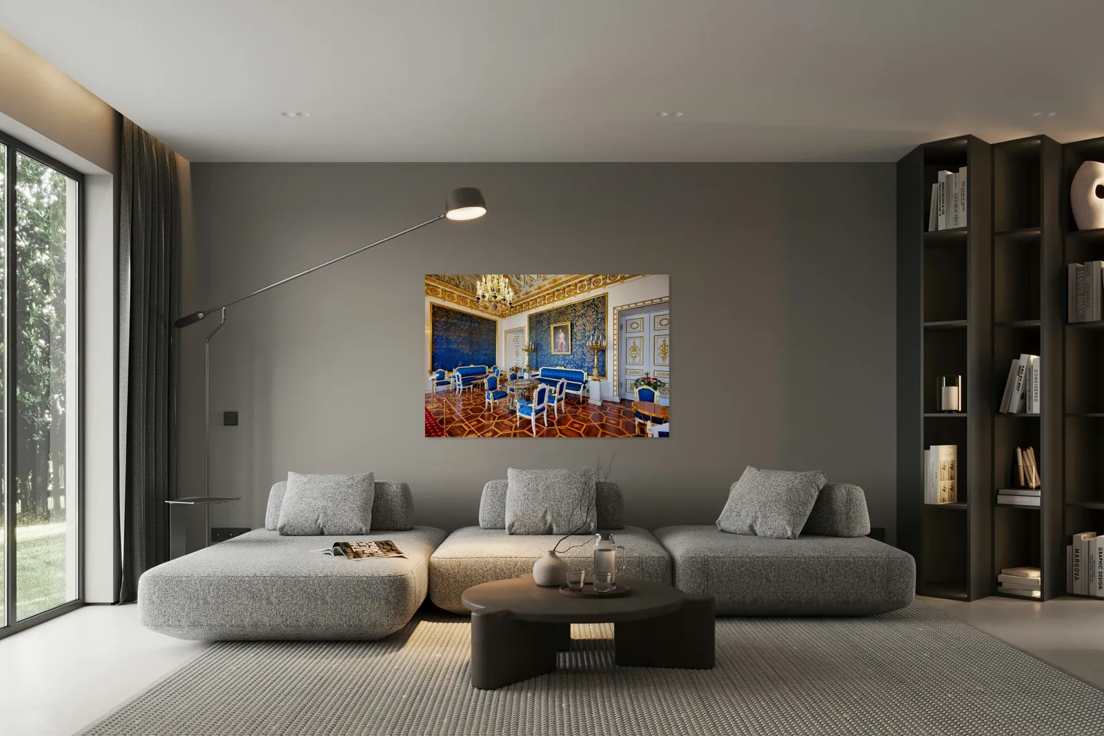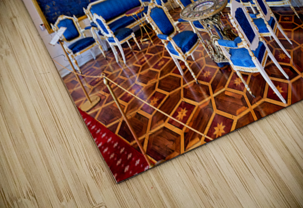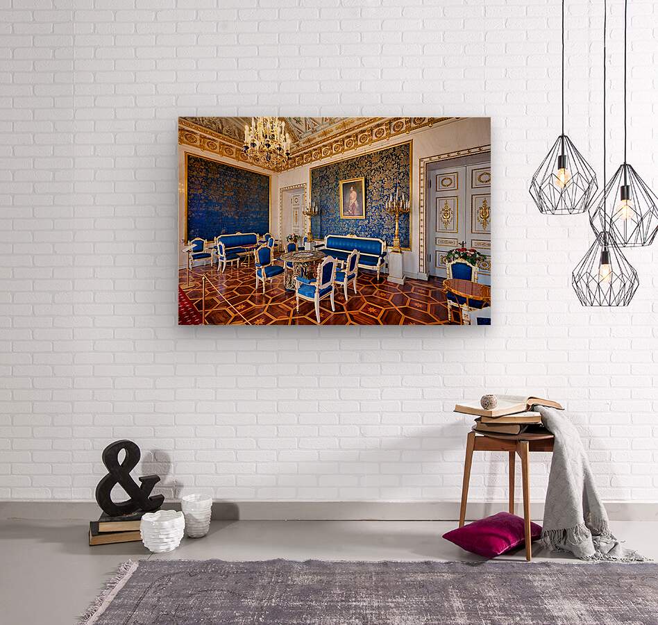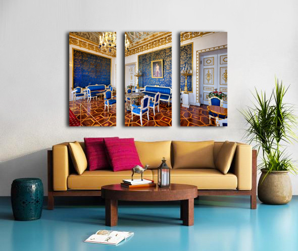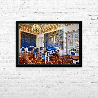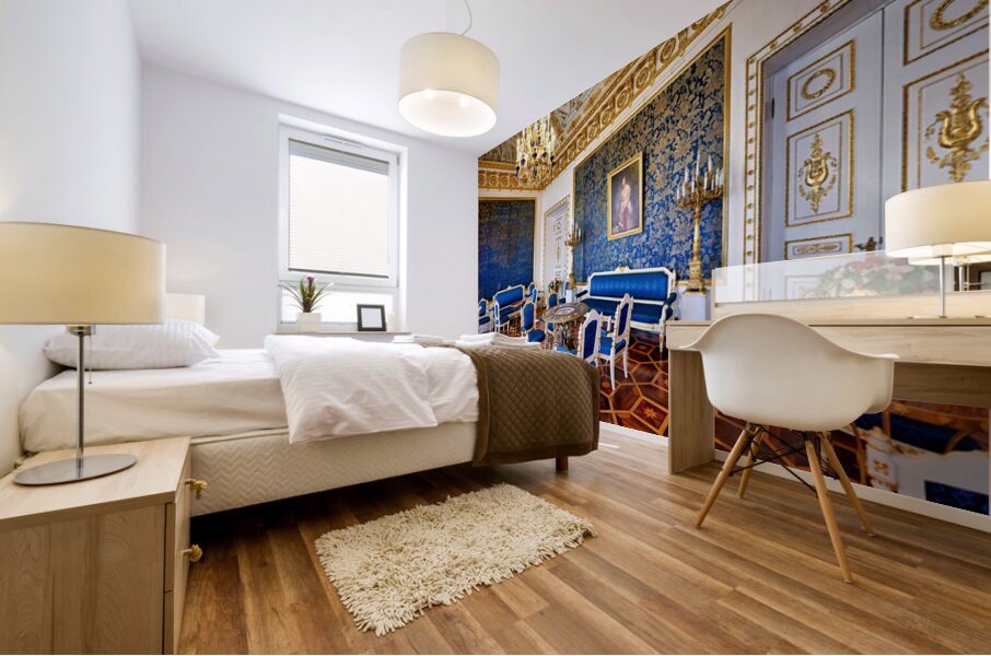 Inside the Yusupov Palace in St. Petersburg blue walls and furniture are arranged neatly. The room has a chandelier and wooden floors.