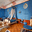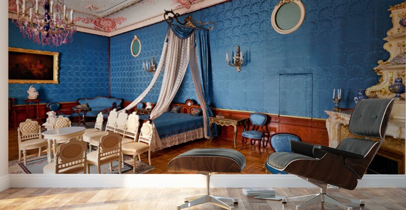Visitors walk through a blue room in Yusupov Palace enjoying the design and art learning about its history and significance.