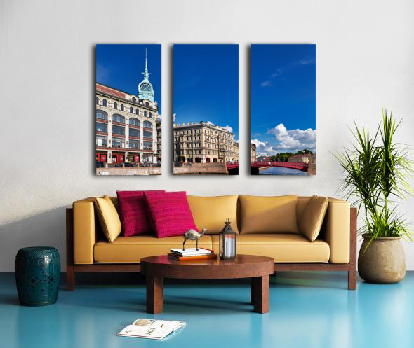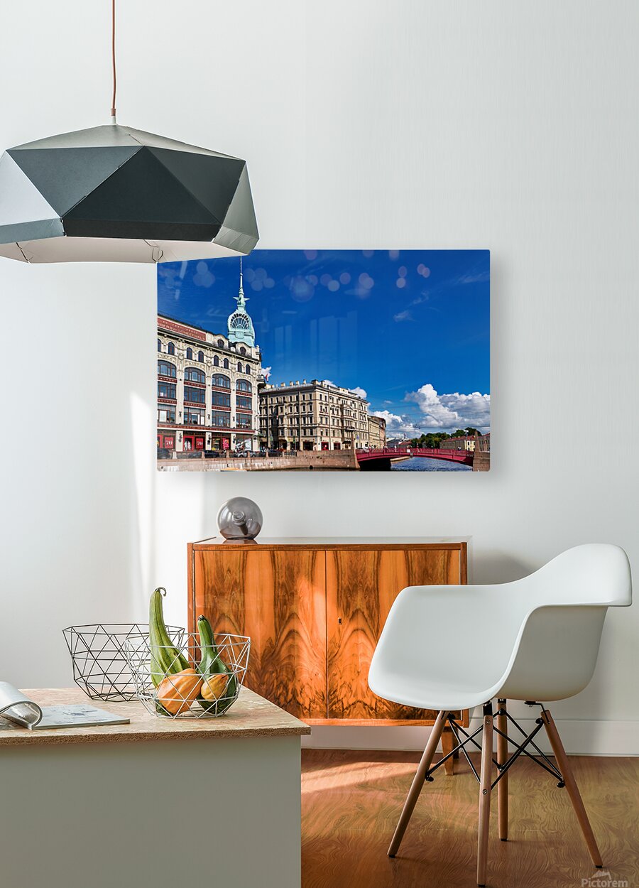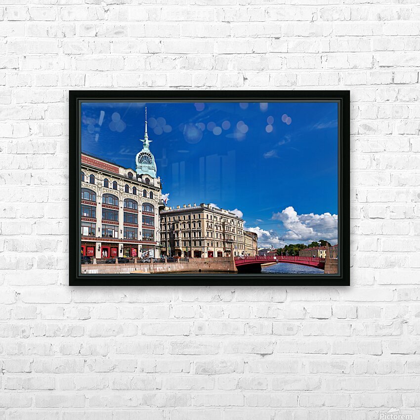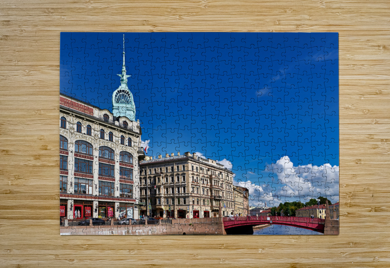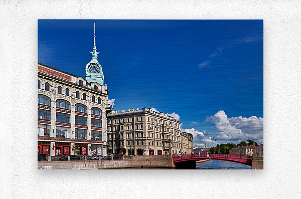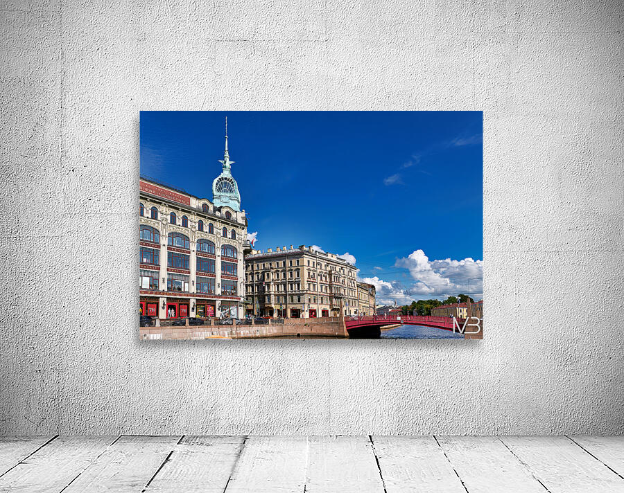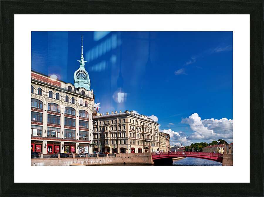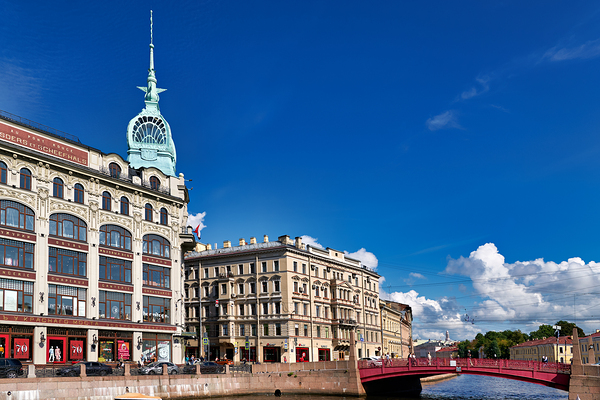 Historical buildings near Moyka River in St. Petersburg. People walk along the river and enjoy the architecture on a clear day.