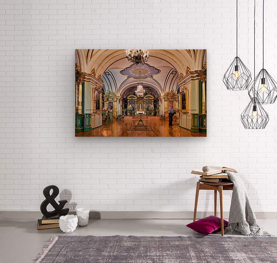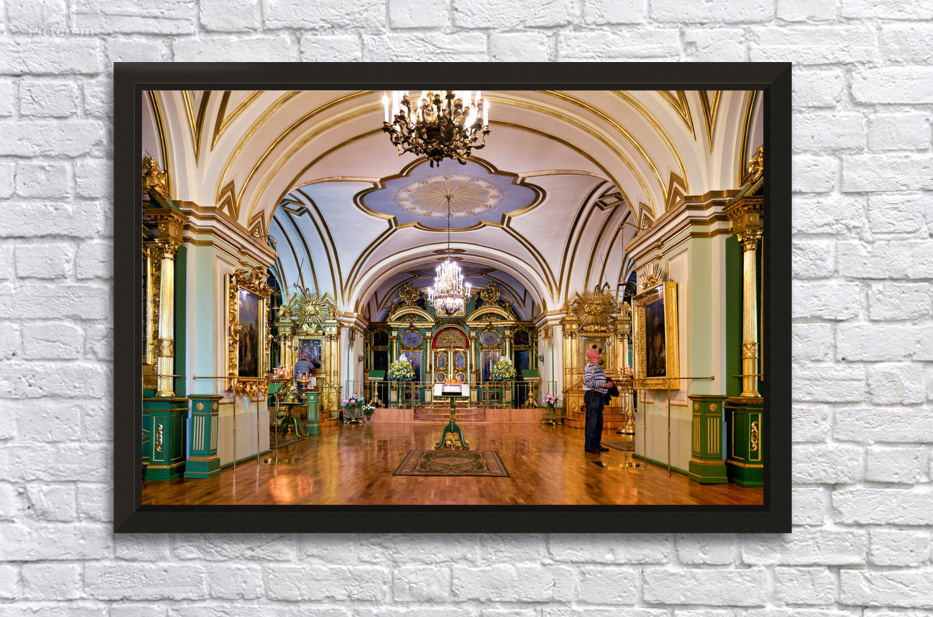 Visitors look around inside the Nikolo Bogoyavlenskiy Morskoy Sobor. The interior shows detailed design and decoration.
