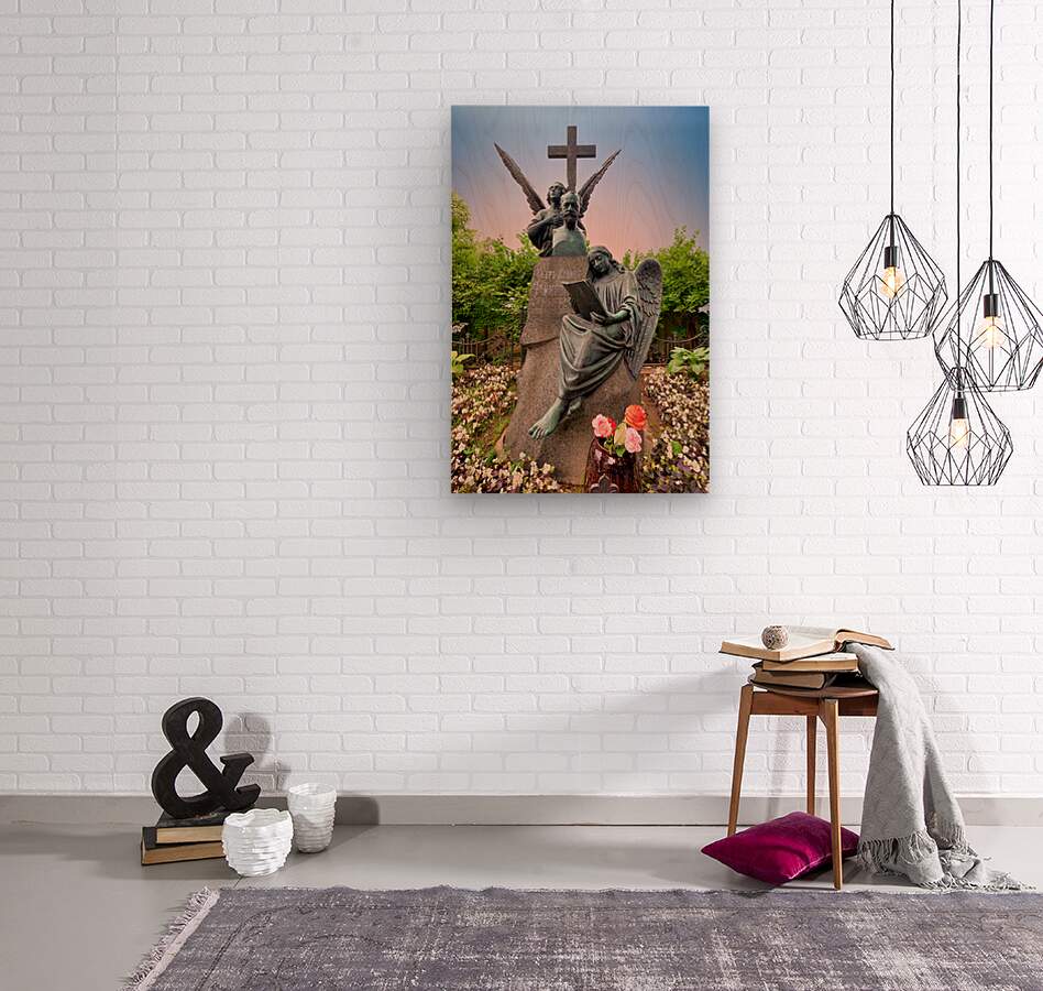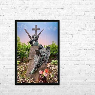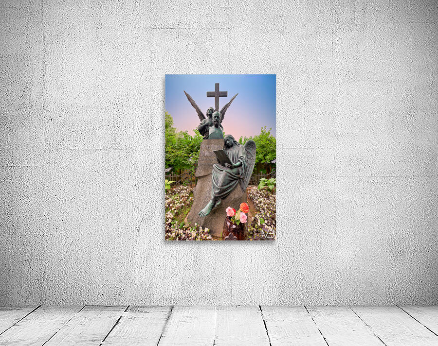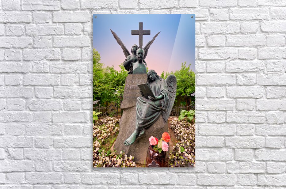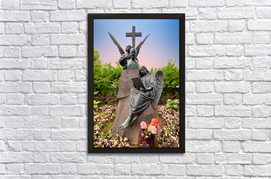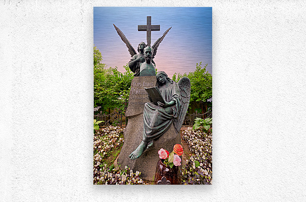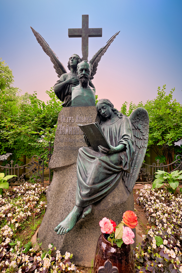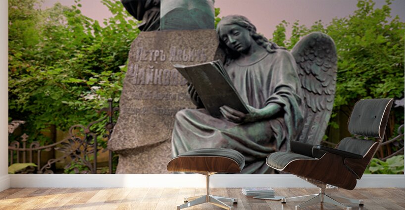 The grave of Fyodor Dostoevsky shows a statue of an angel reading amid flowers and greenery in Tikhvin cemetery Saint Petersburg Russia.