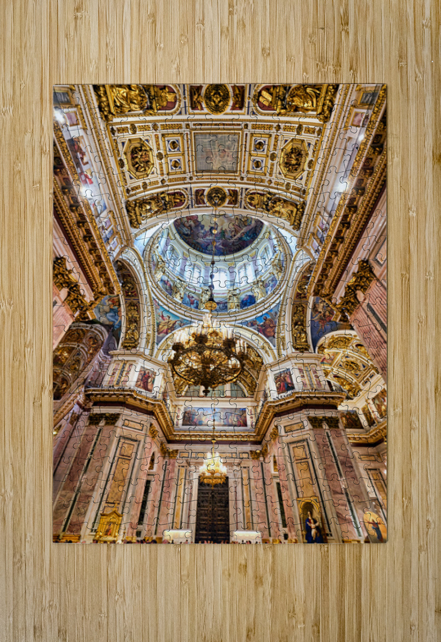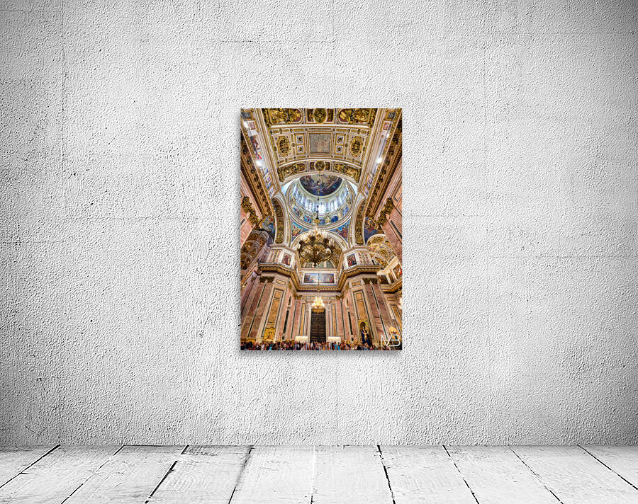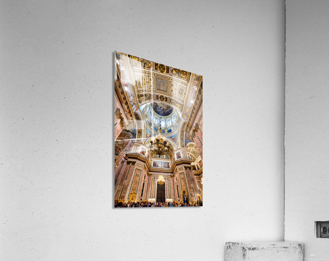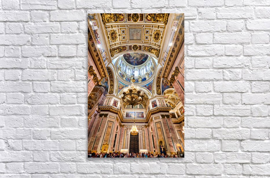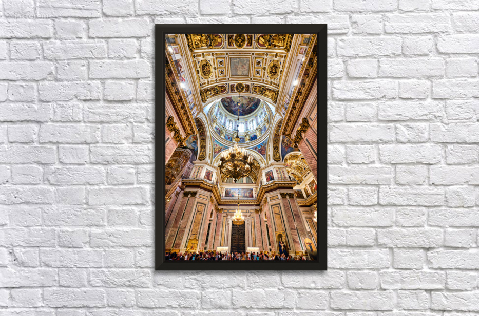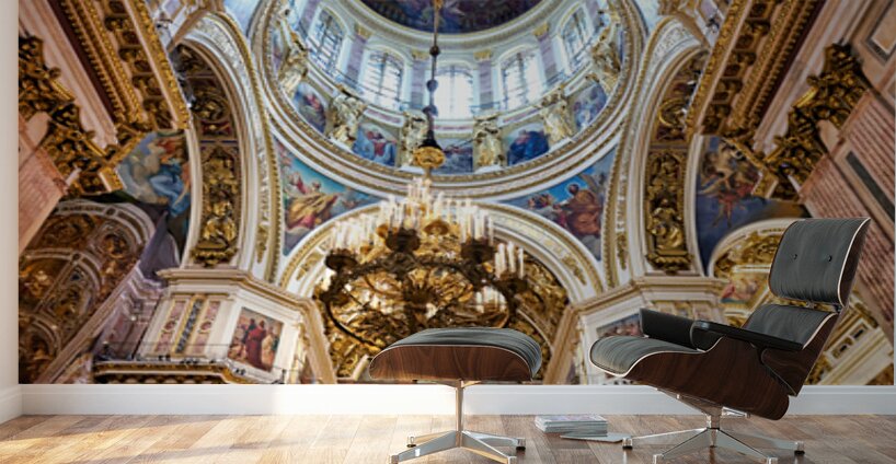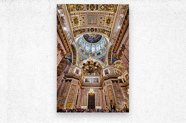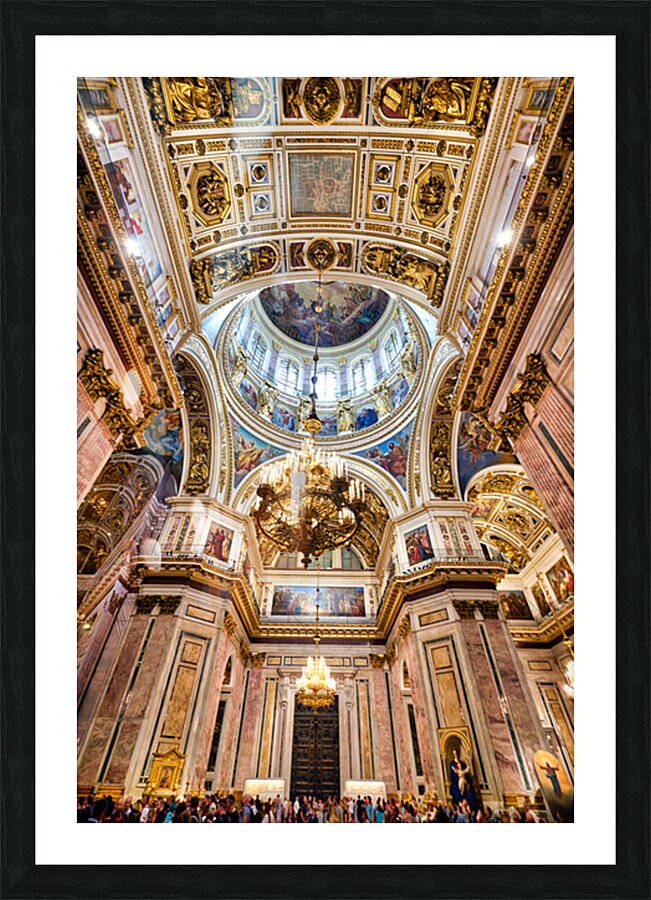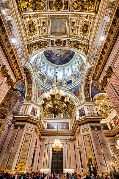 People gather inside St. Isaacs Cathedral in St. Petersburg. The ornate ceiling and large chandelier attract attention from all around.