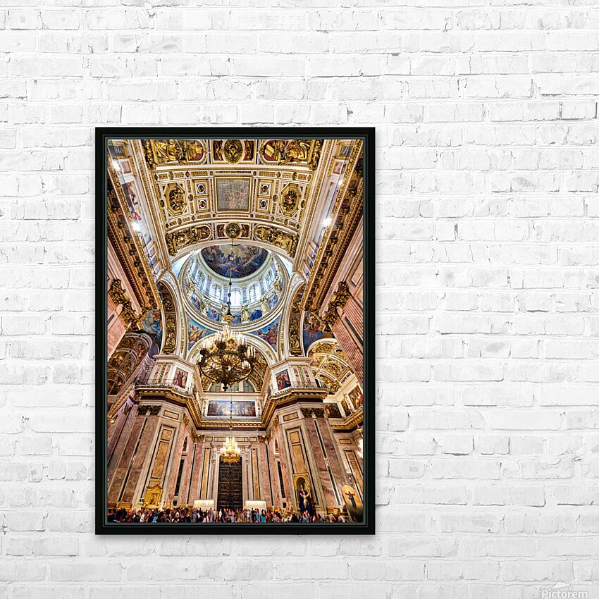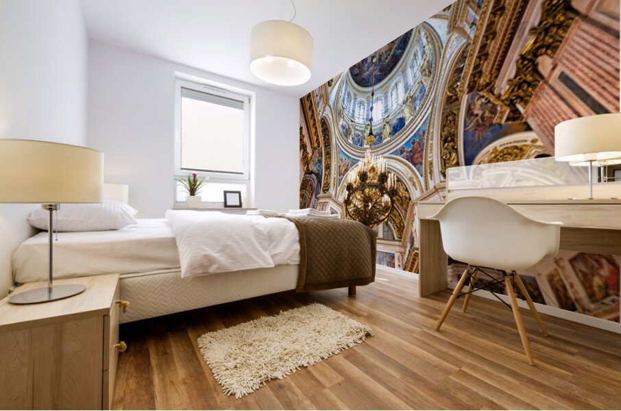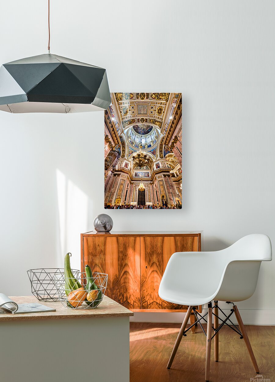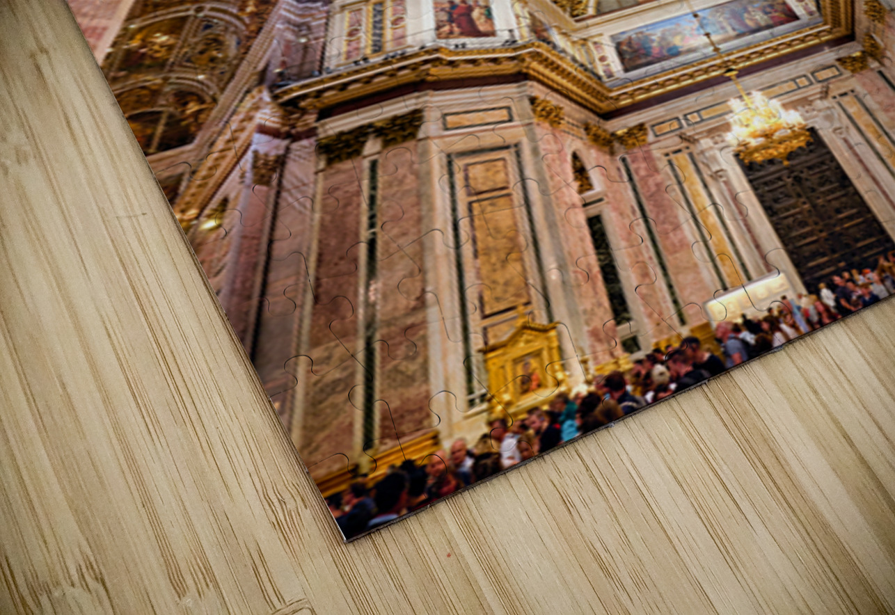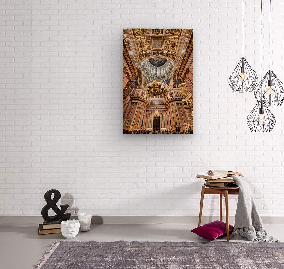 People gather inside St. Isaacs Cathedral in St. Petersburg. The ornate ceiling and large chandelier attract attention from all around.