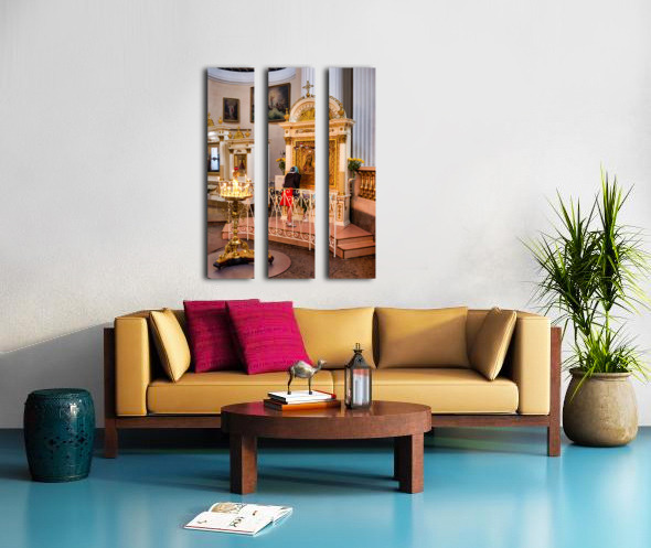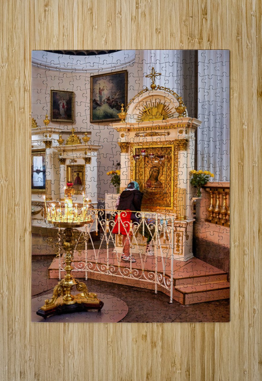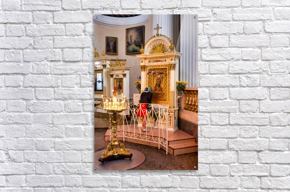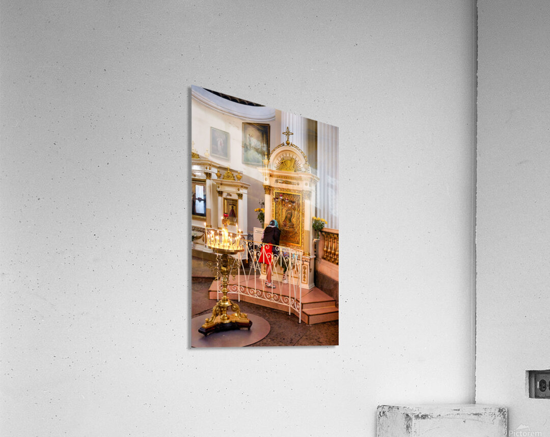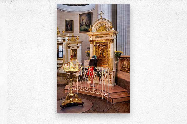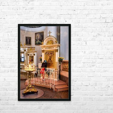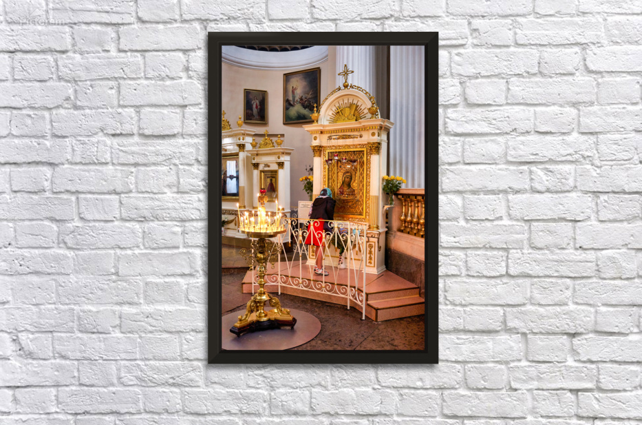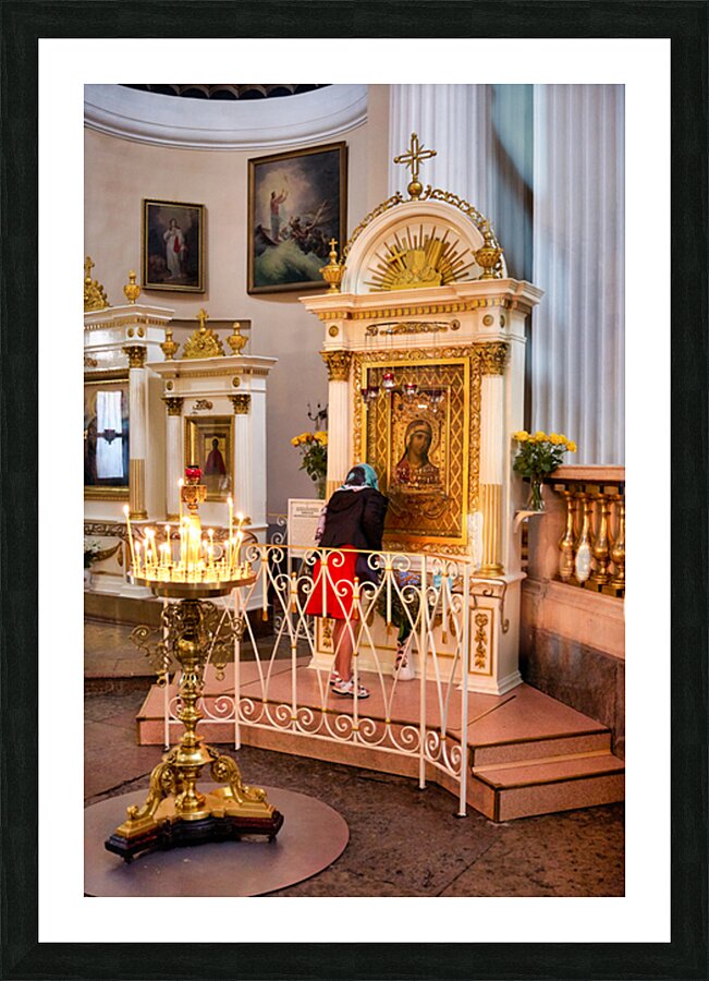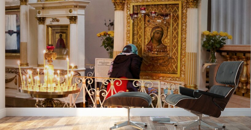 A visitor prays at the icon in Alexander Nevsky Lavra Church in St. Petersburg. People gather to seek blessings in this sacred place.
