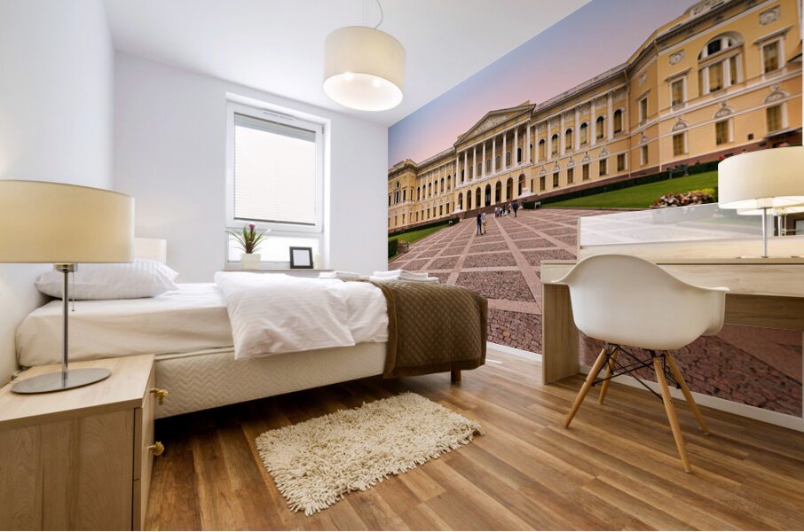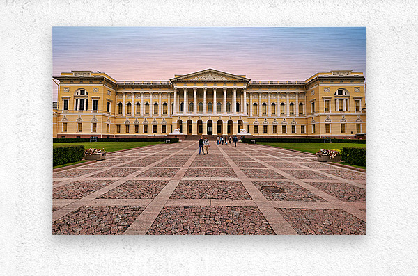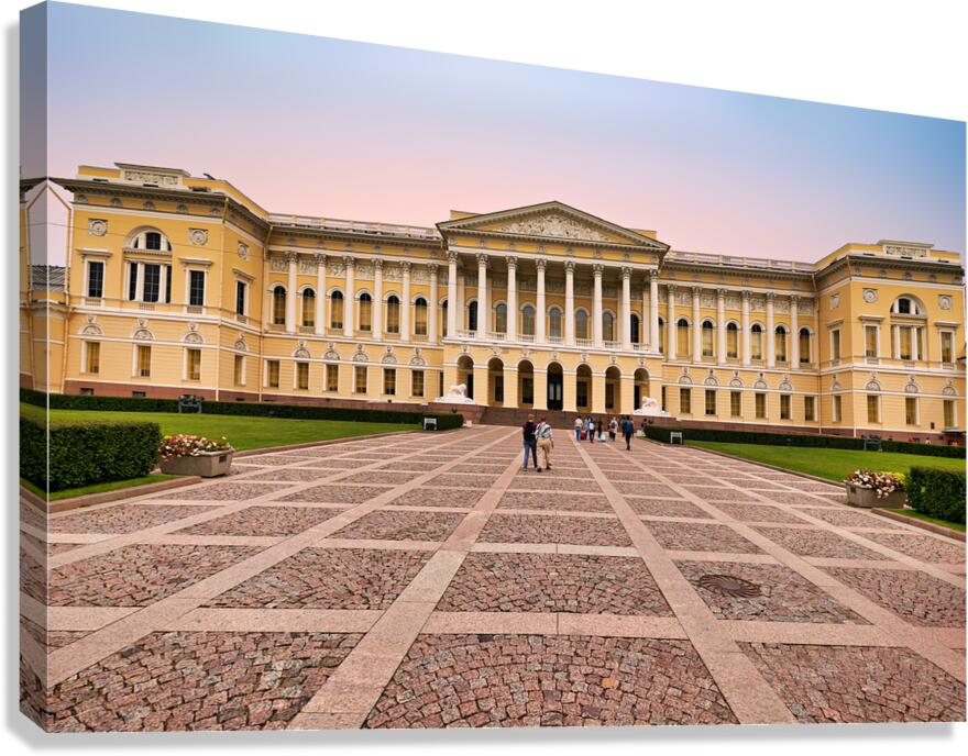 People walk towards the Russian Museum in Saint Petersburg. The building shows classic architecture and visitors admire its design.