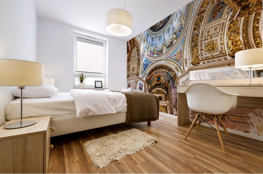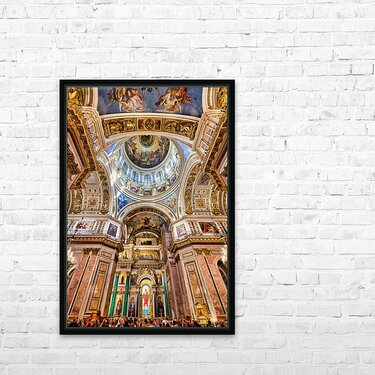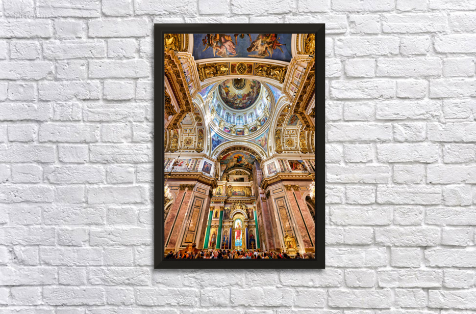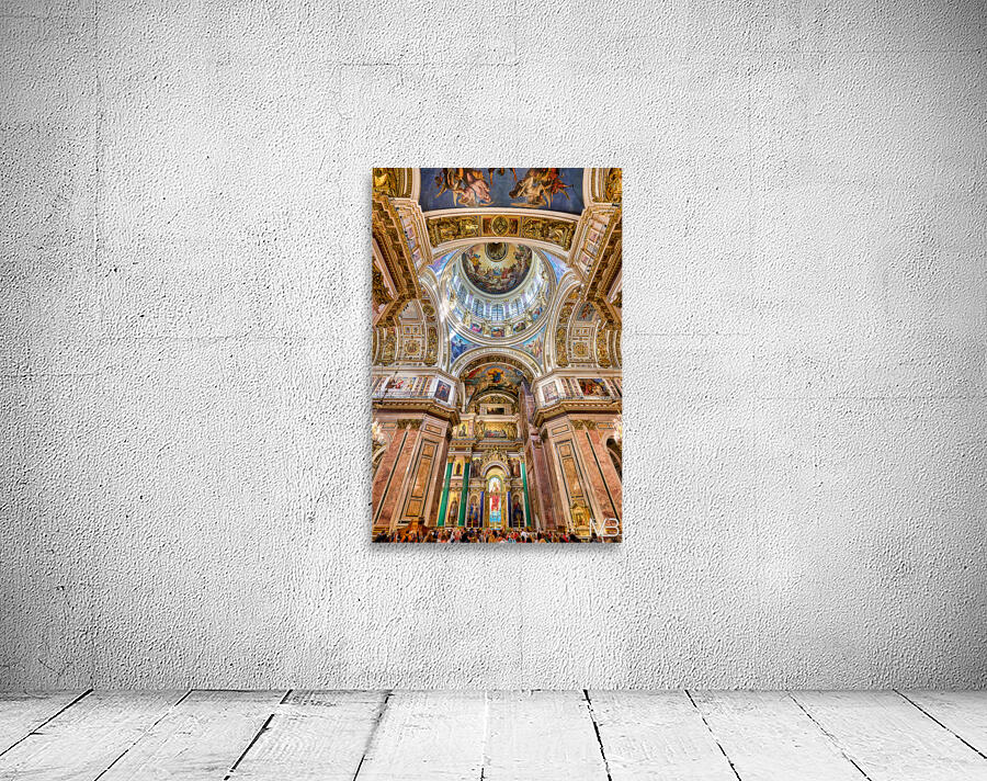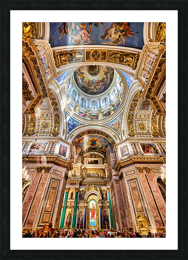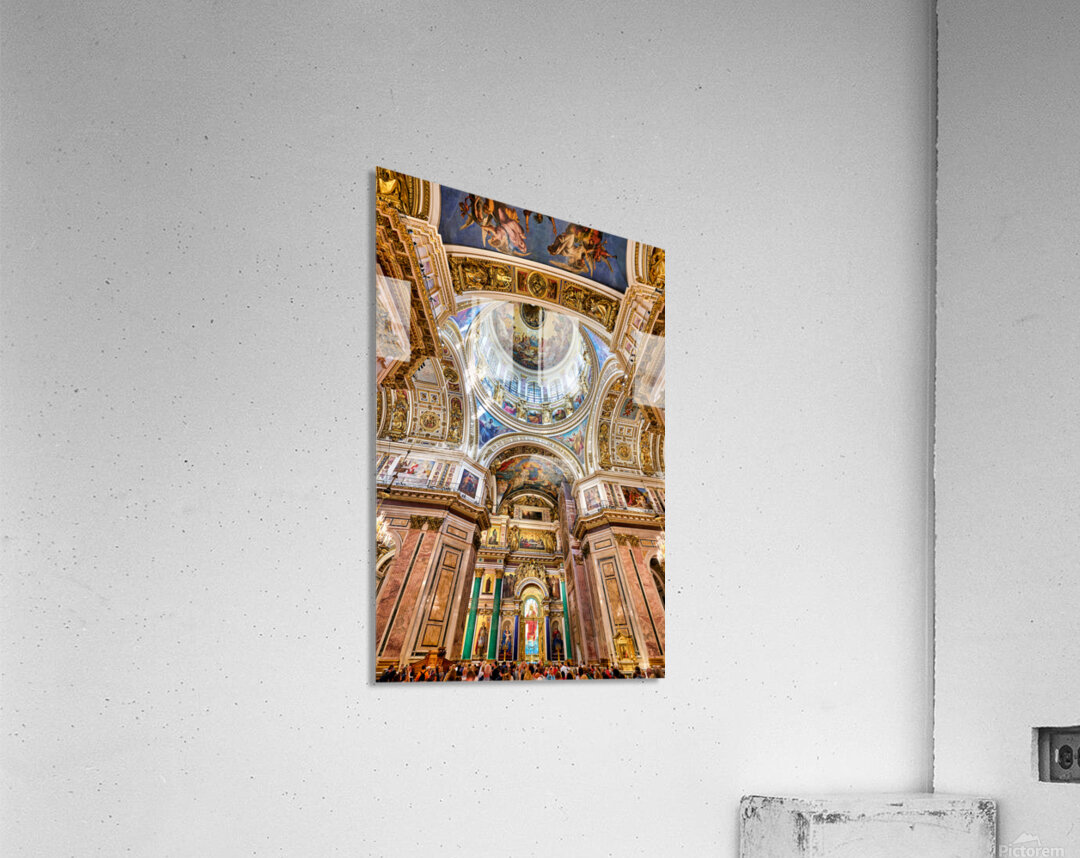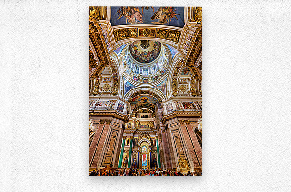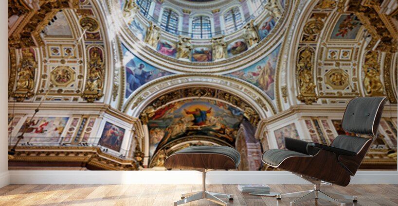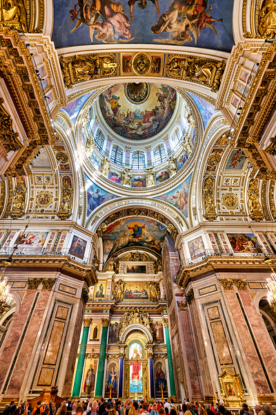 People explore the interior of St. Isaacs Cathedral in St. Petersburg. The ceiling showcases colorful artworks and detailed architecture.