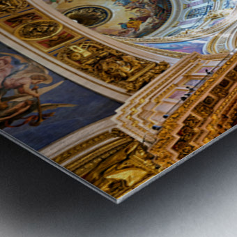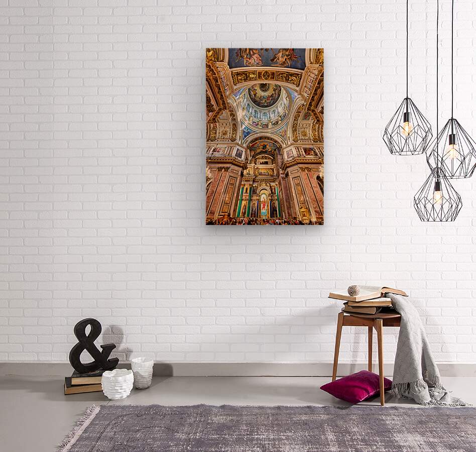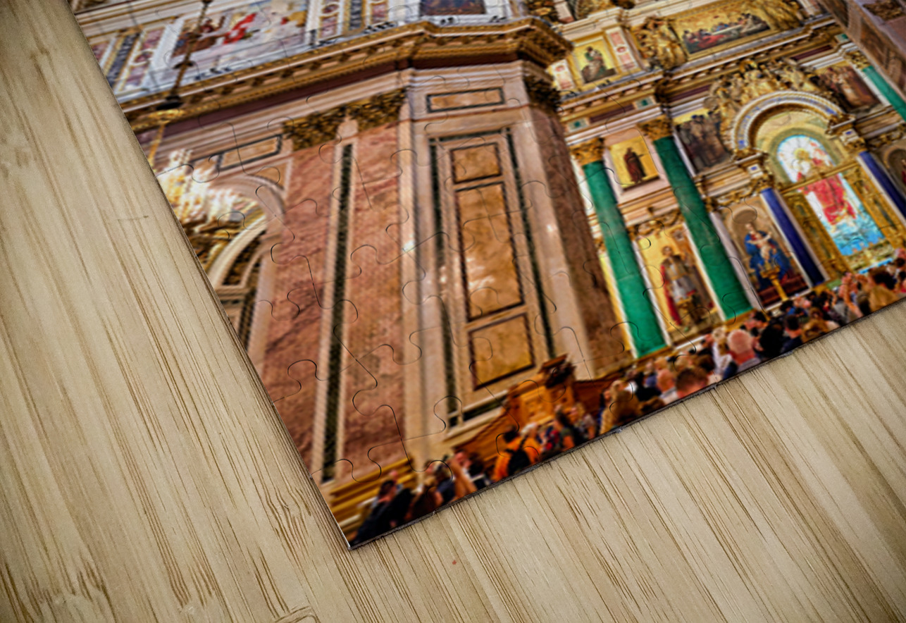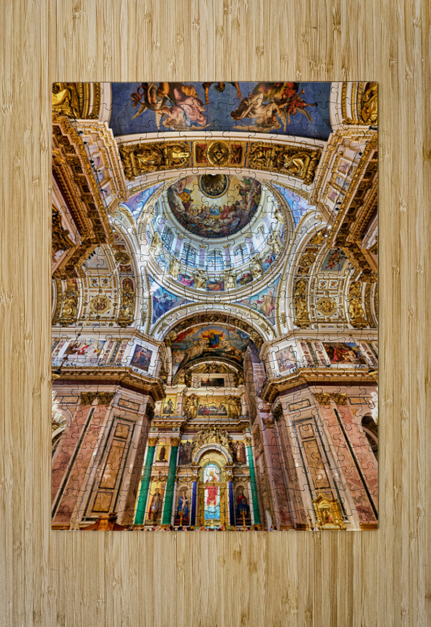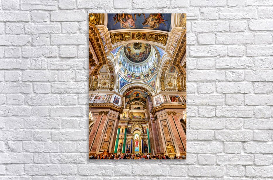 People explore the interior of St. Isaacs Cathedral in St. Petersburg. The ceiling showcases colorful artworks and detailed architecture.