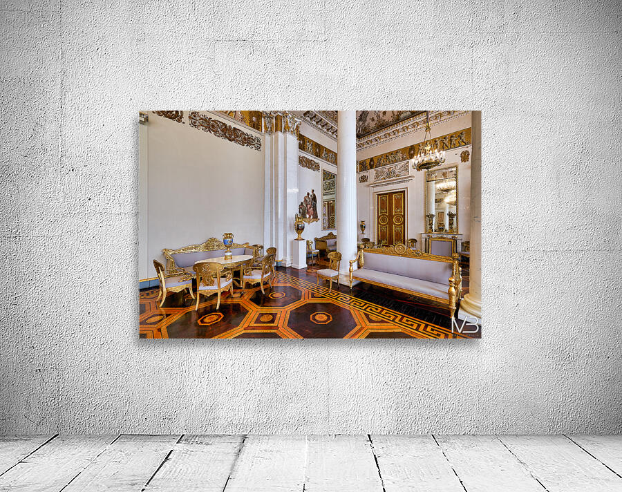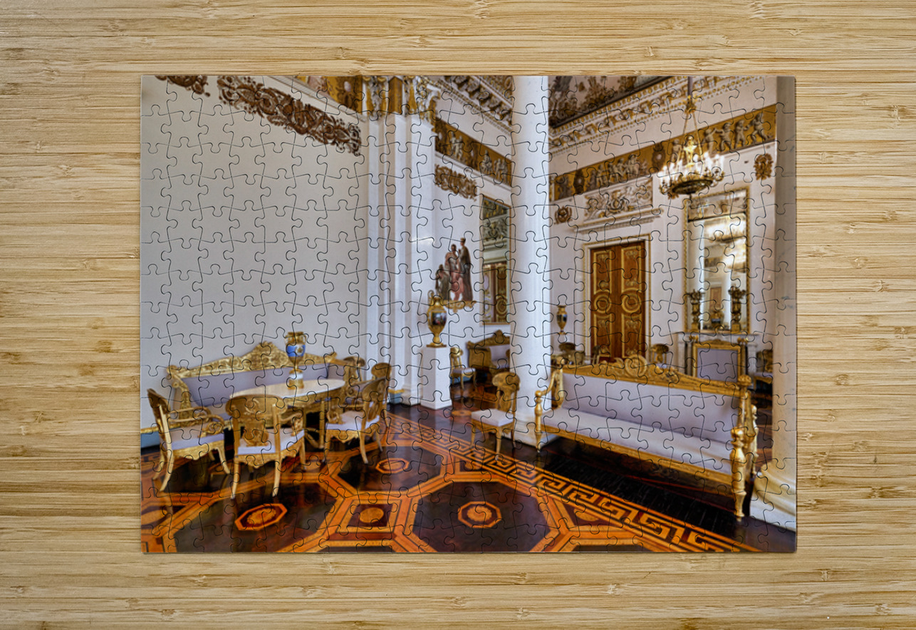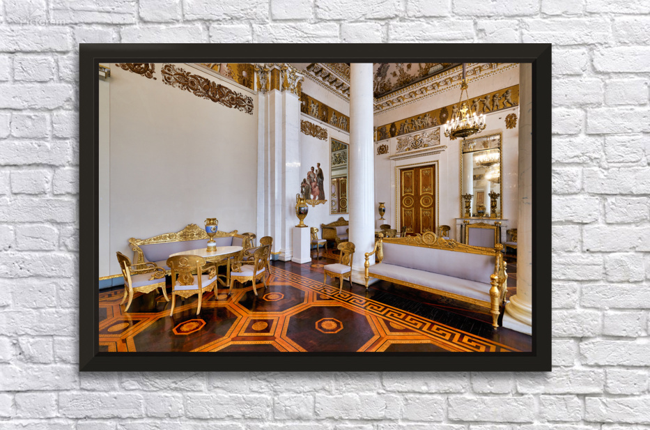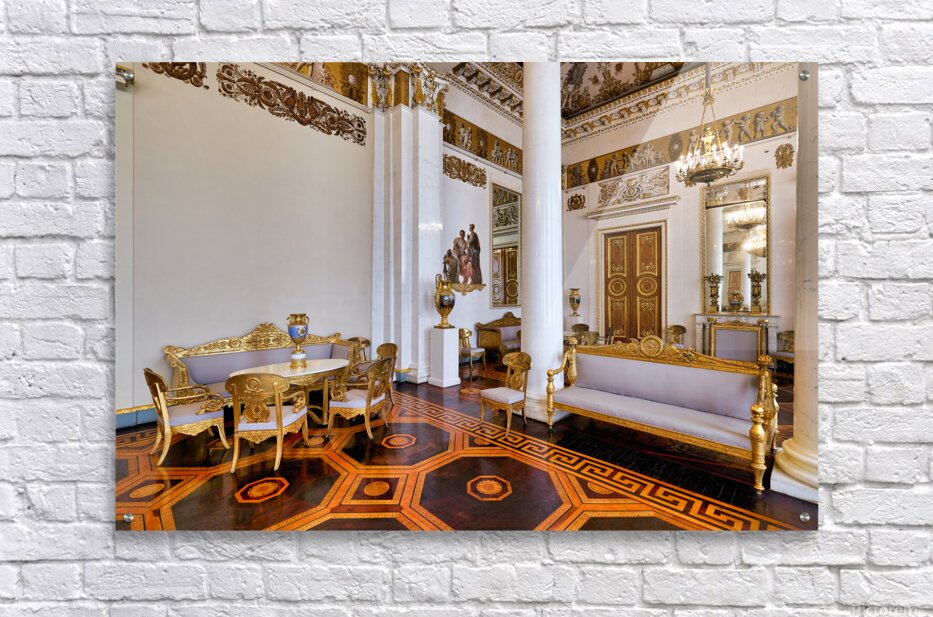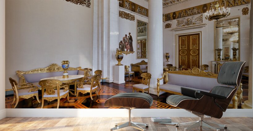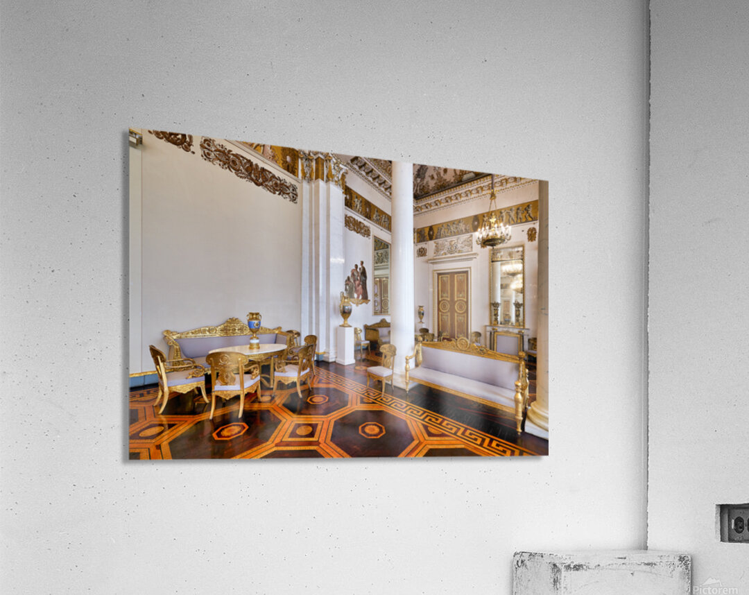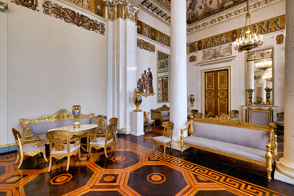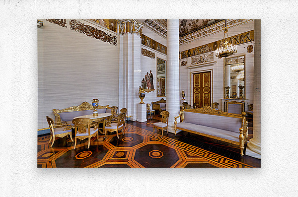 Inside the Russian Museum in Saint Petersburg visitors look at artworks while enjoying the decorative furnishings in the room.