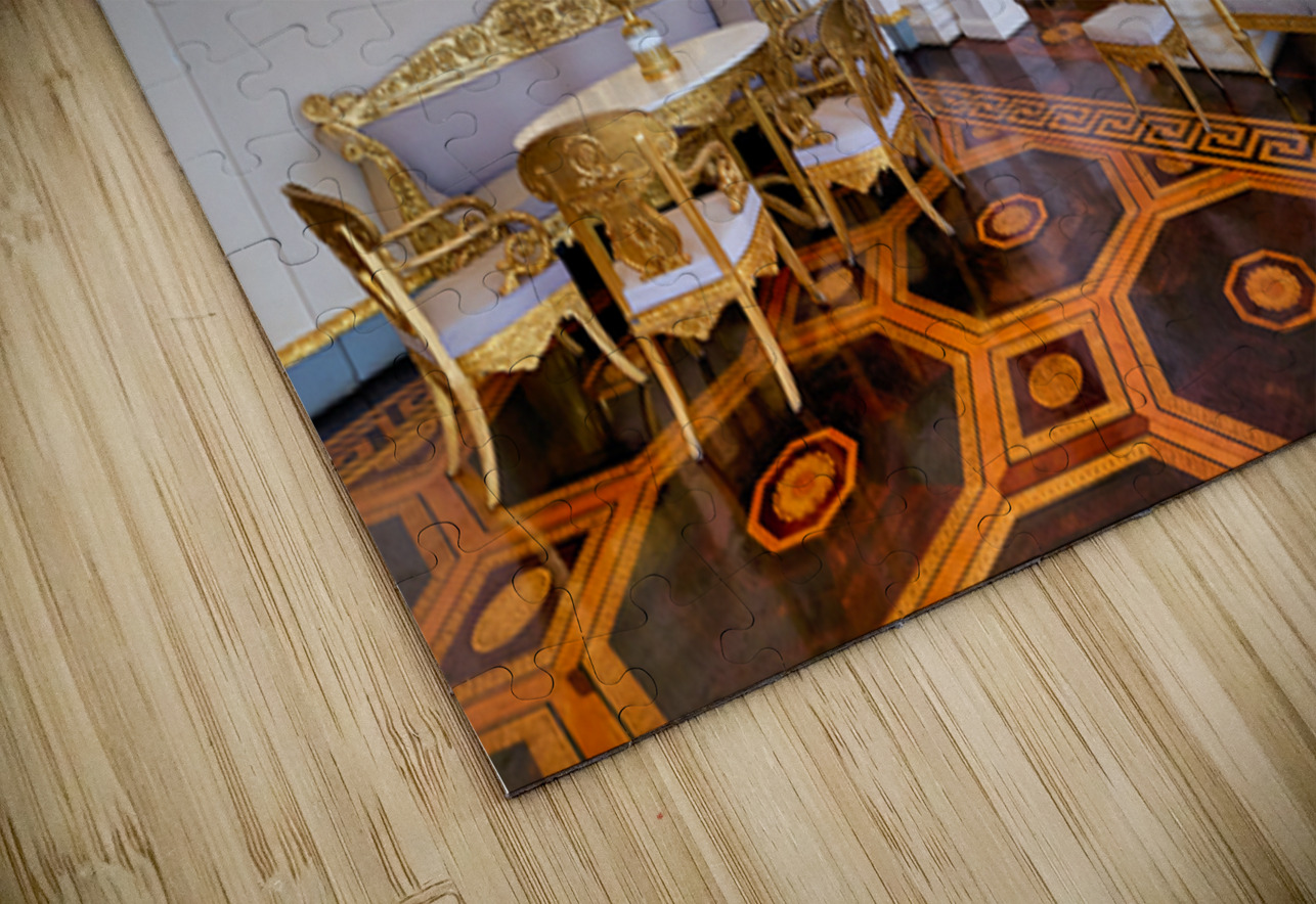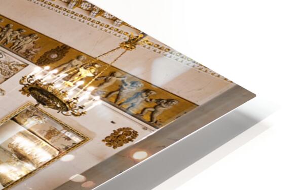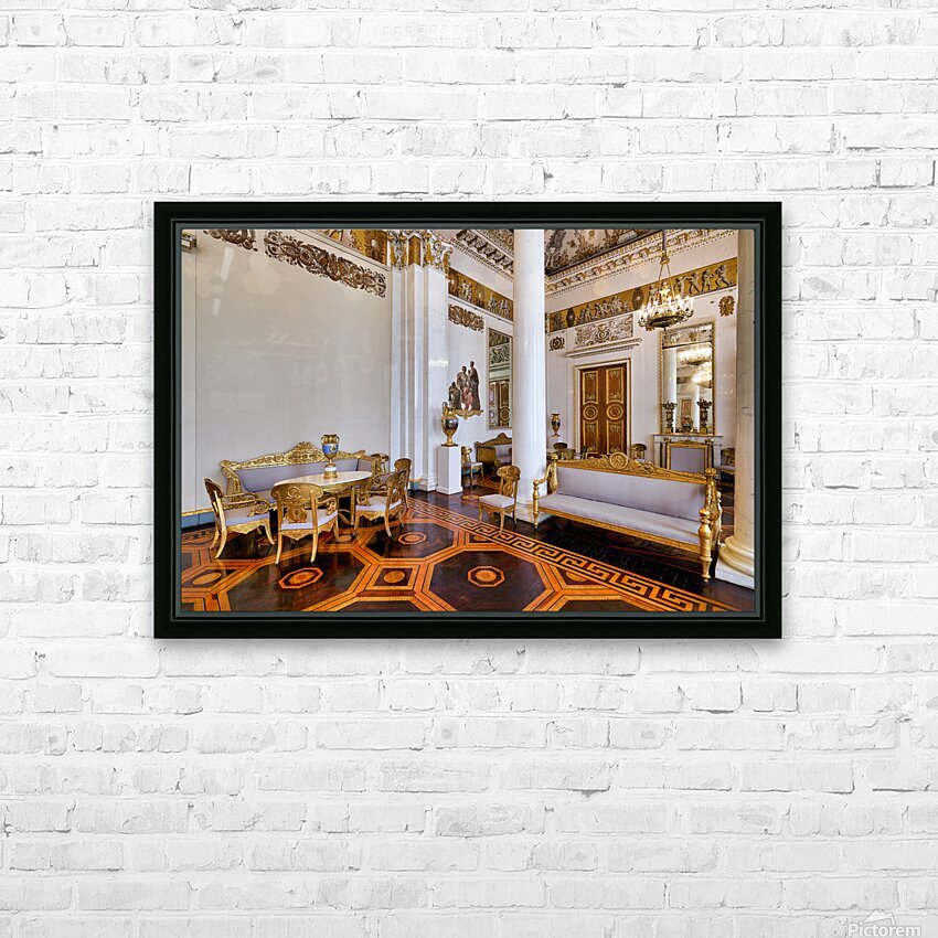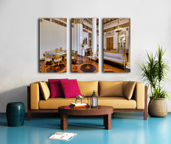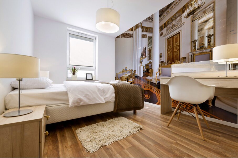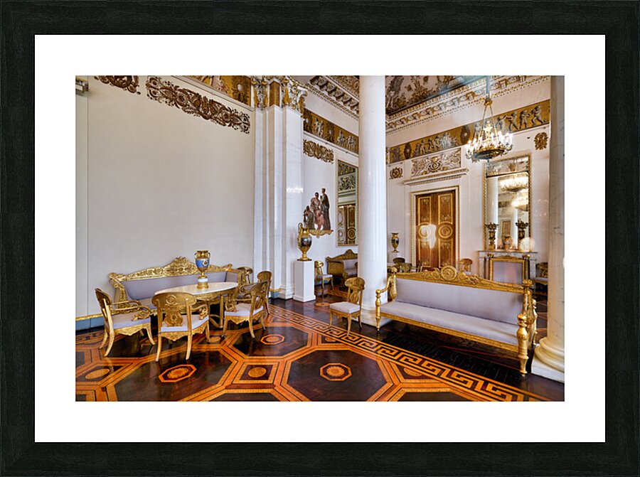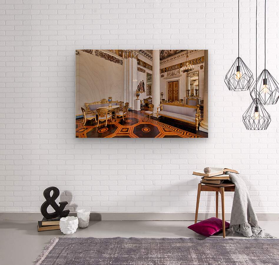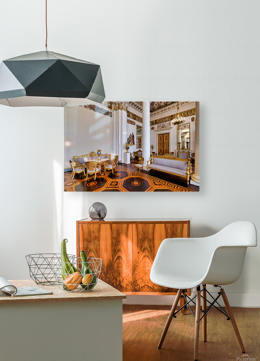 Inside the Russian Museum in Saint Petersburg visitors look at artworks while enjoying the decorative furnishings in the room.