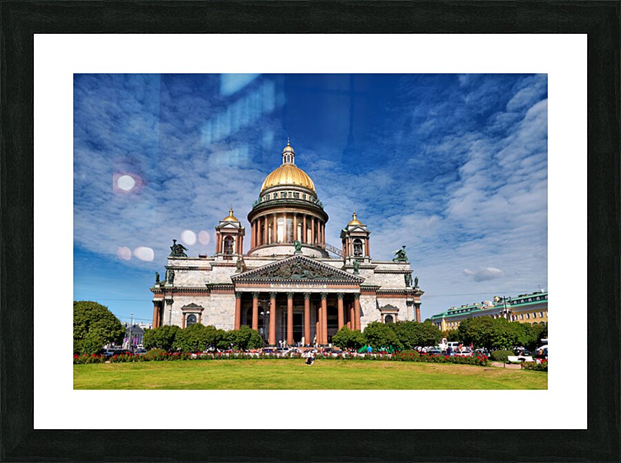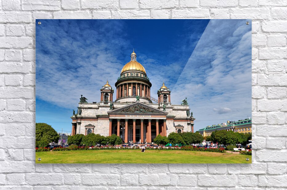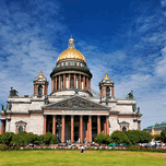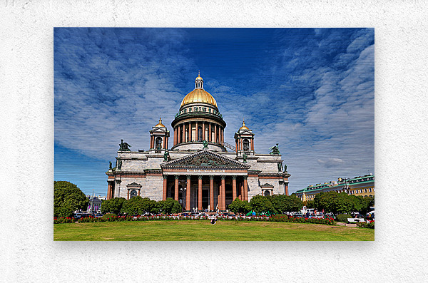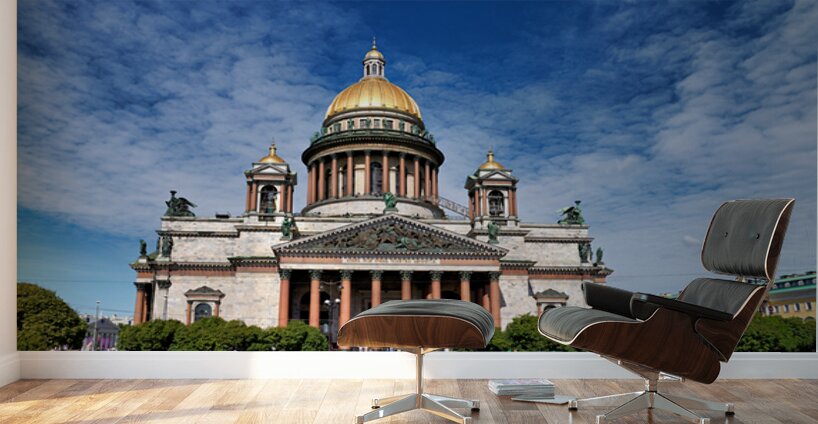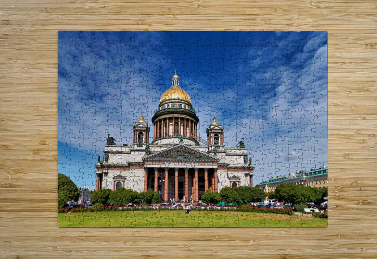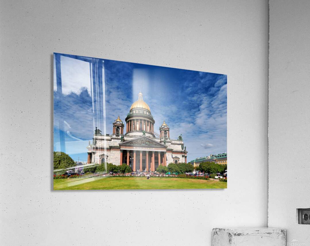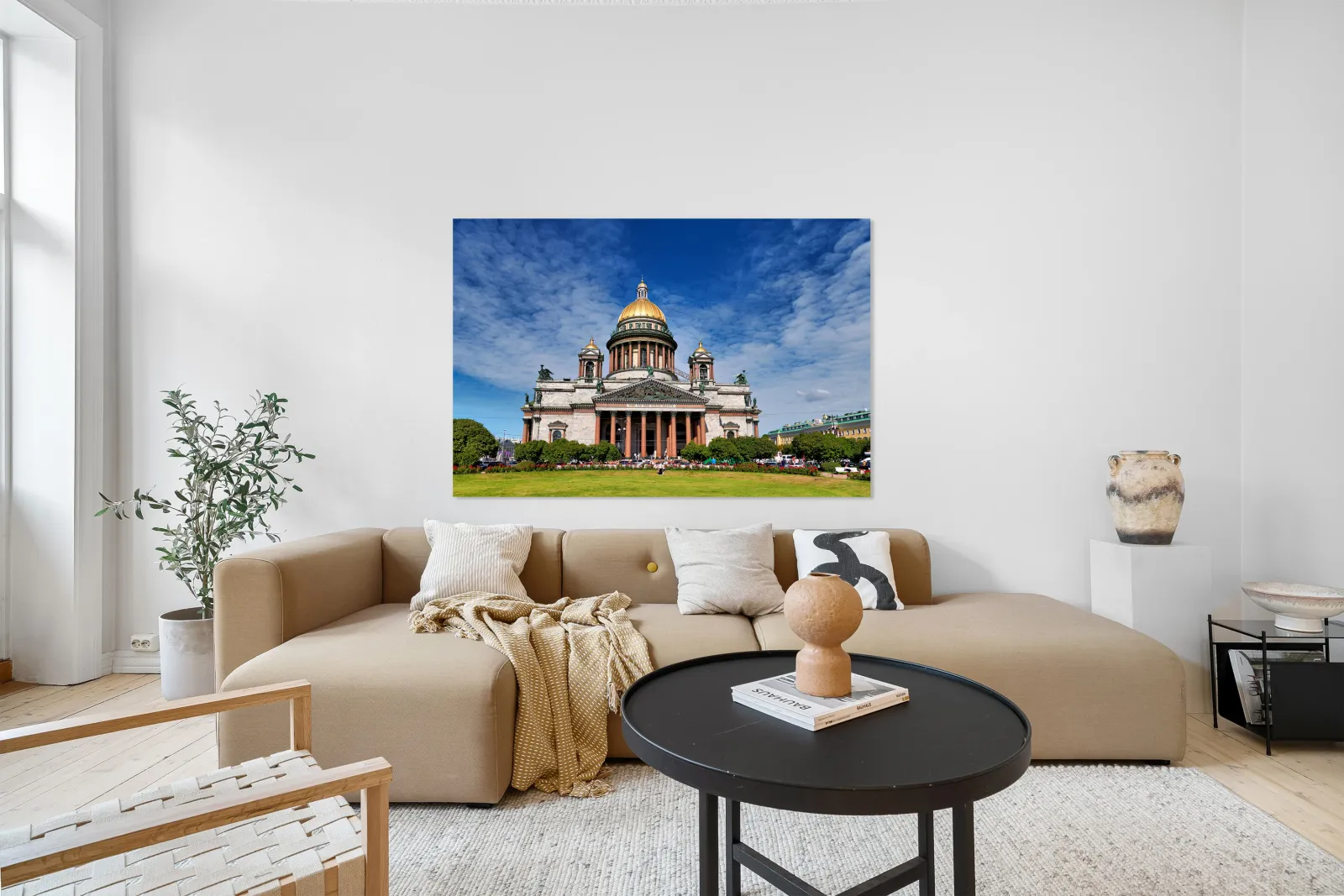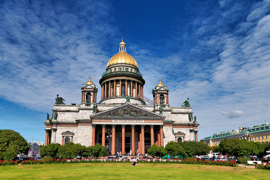 Saint Isaacs Cathedral stands tall in Saint Petersburg. Tourists visit the landmark under a clear blue sky with fluffy clouds.