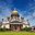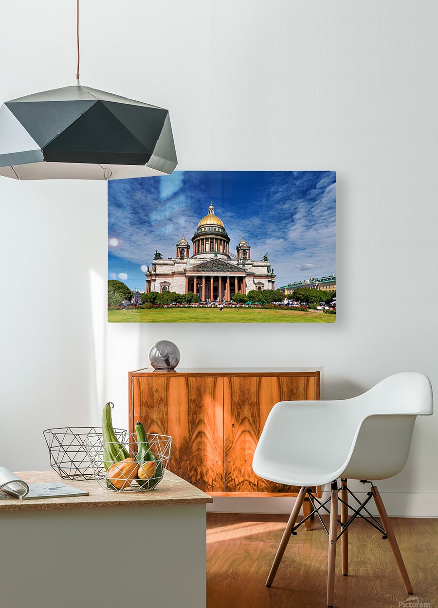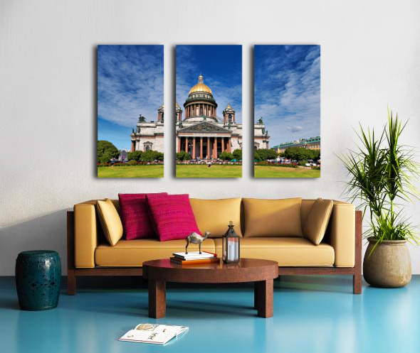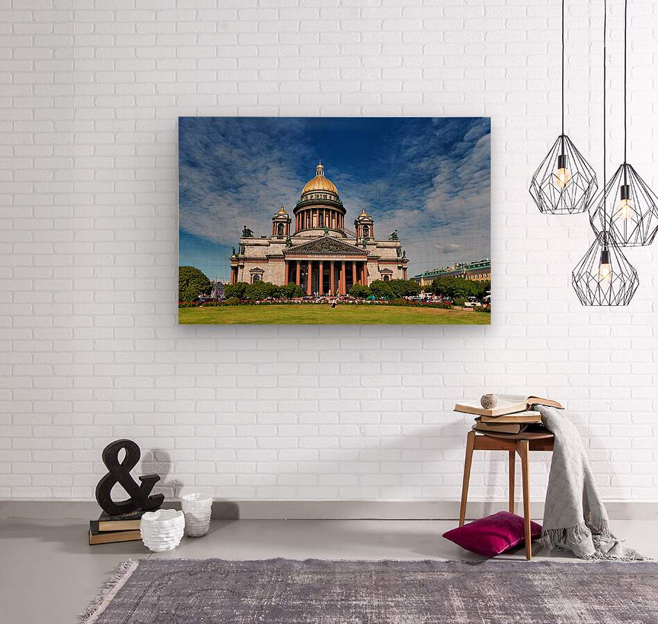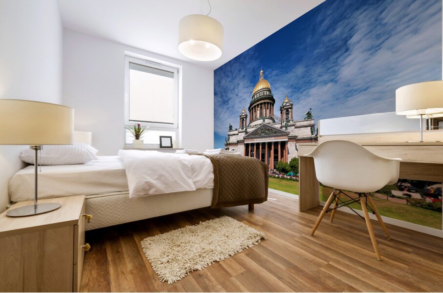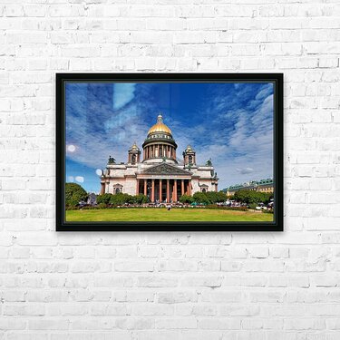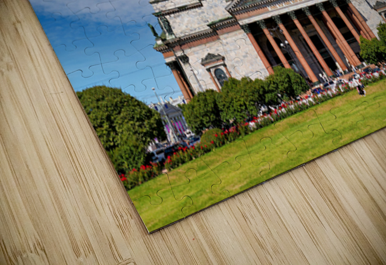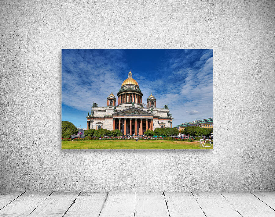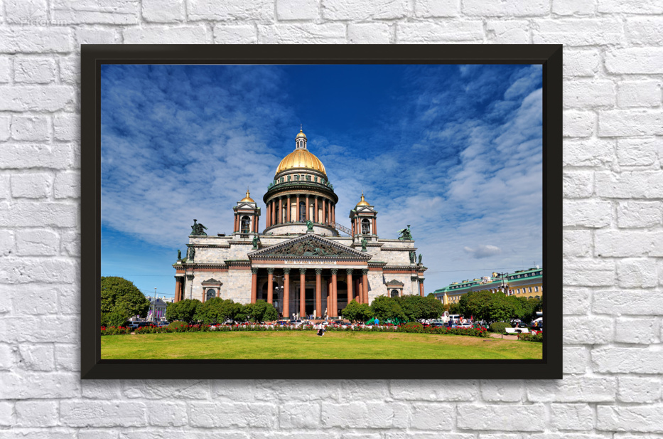 Saint Isaacs Cathedral stands tall in Saint Petersburg. Tourists visit the landmark under a clear blue sky with fluffy clouds.