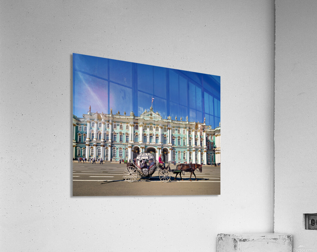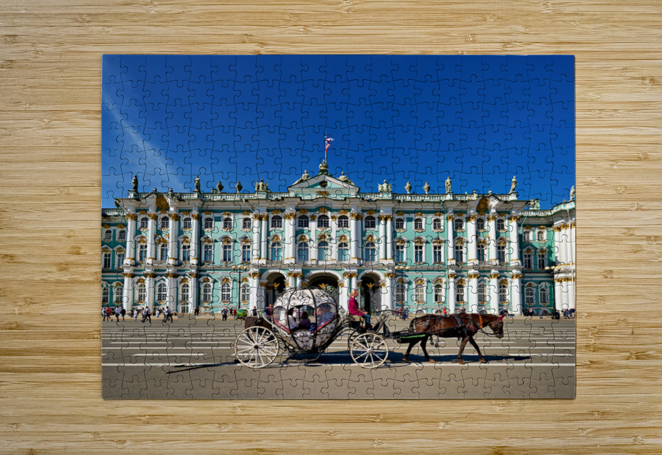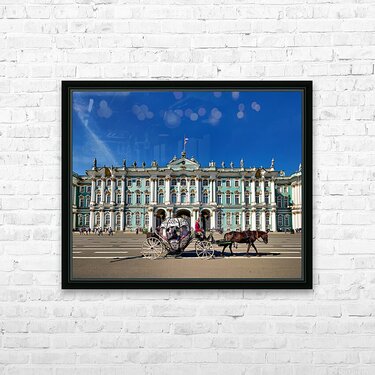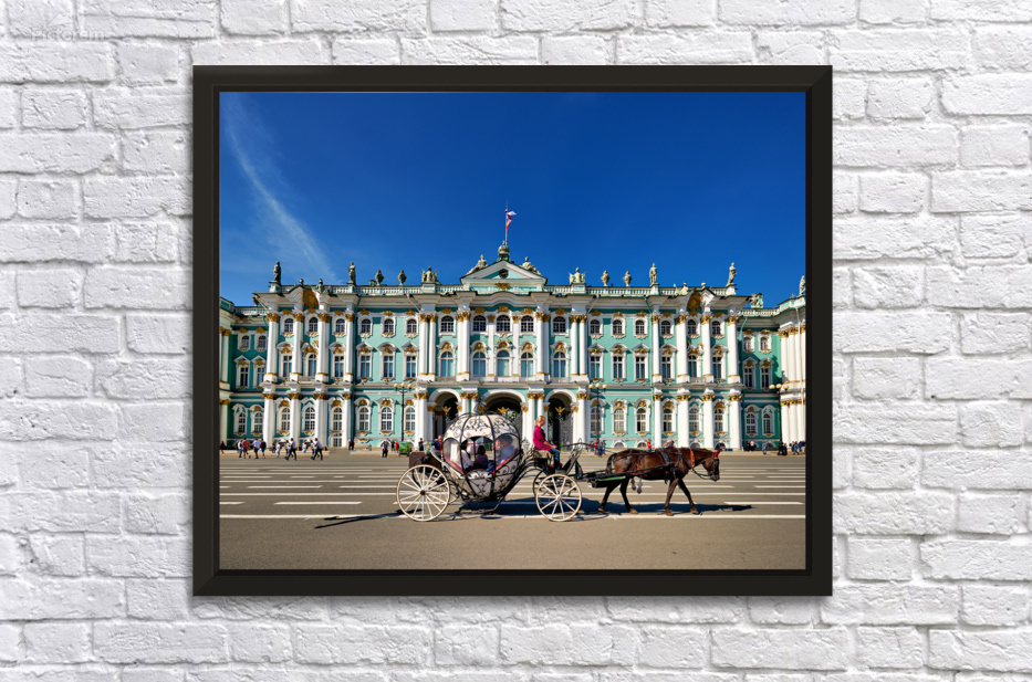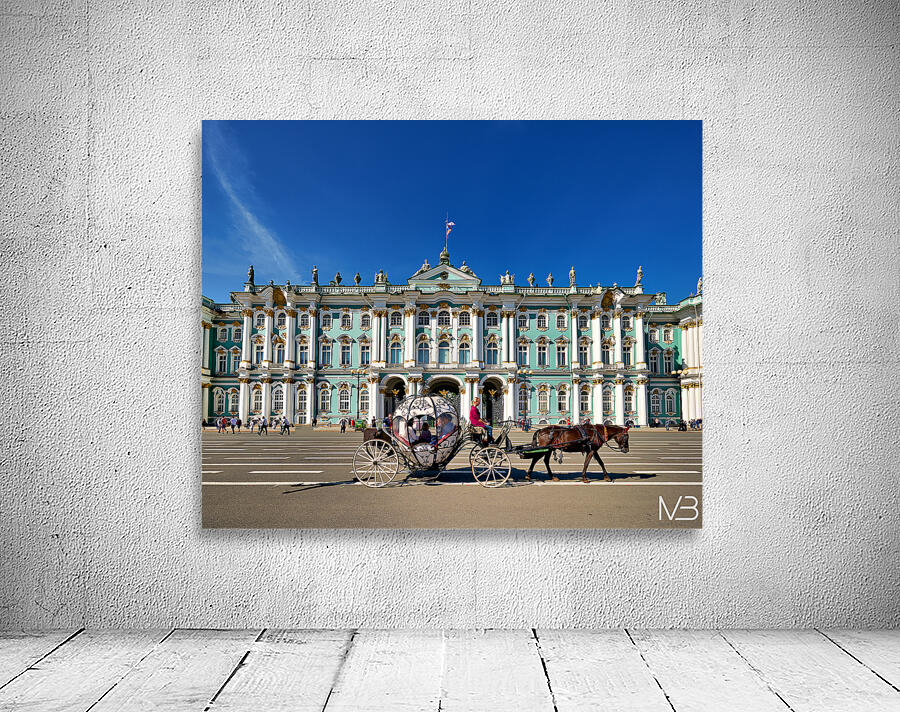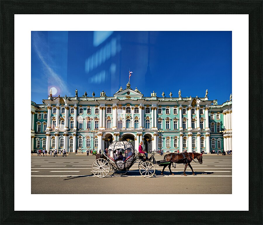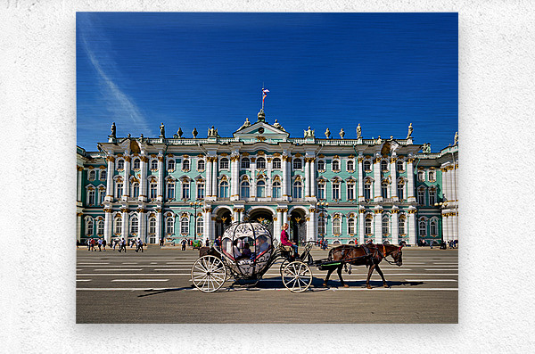 A horse carriage moves in front of the Winter Palace in Saint Petersburg Russia. Tourists walk around the historic site under a clear blue sky.