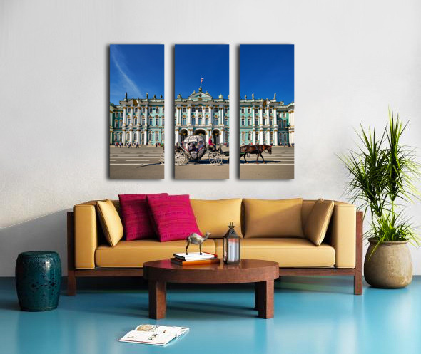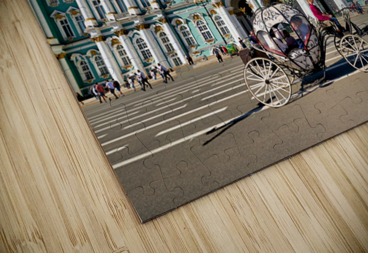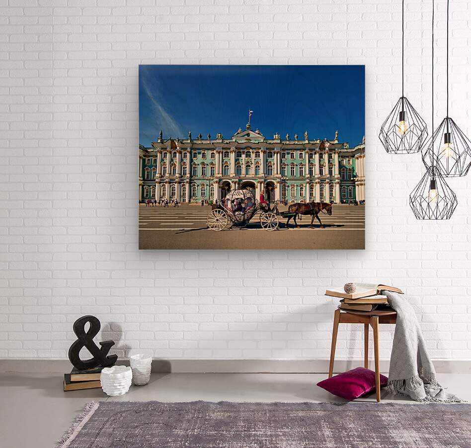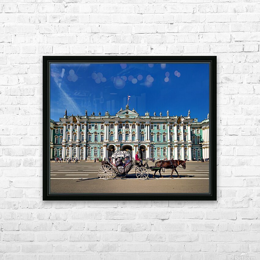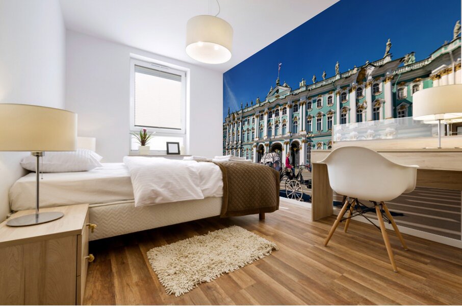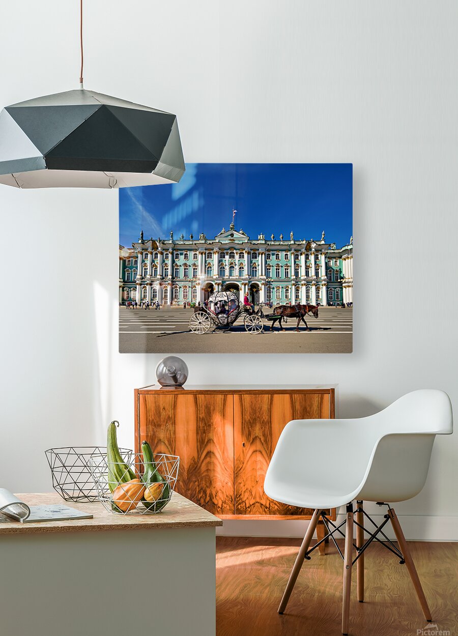 A horse carriage moves in front of the Winter Palace in Saint Petersburg Russia. Tourists walk around the historic site under a clear blue sky.