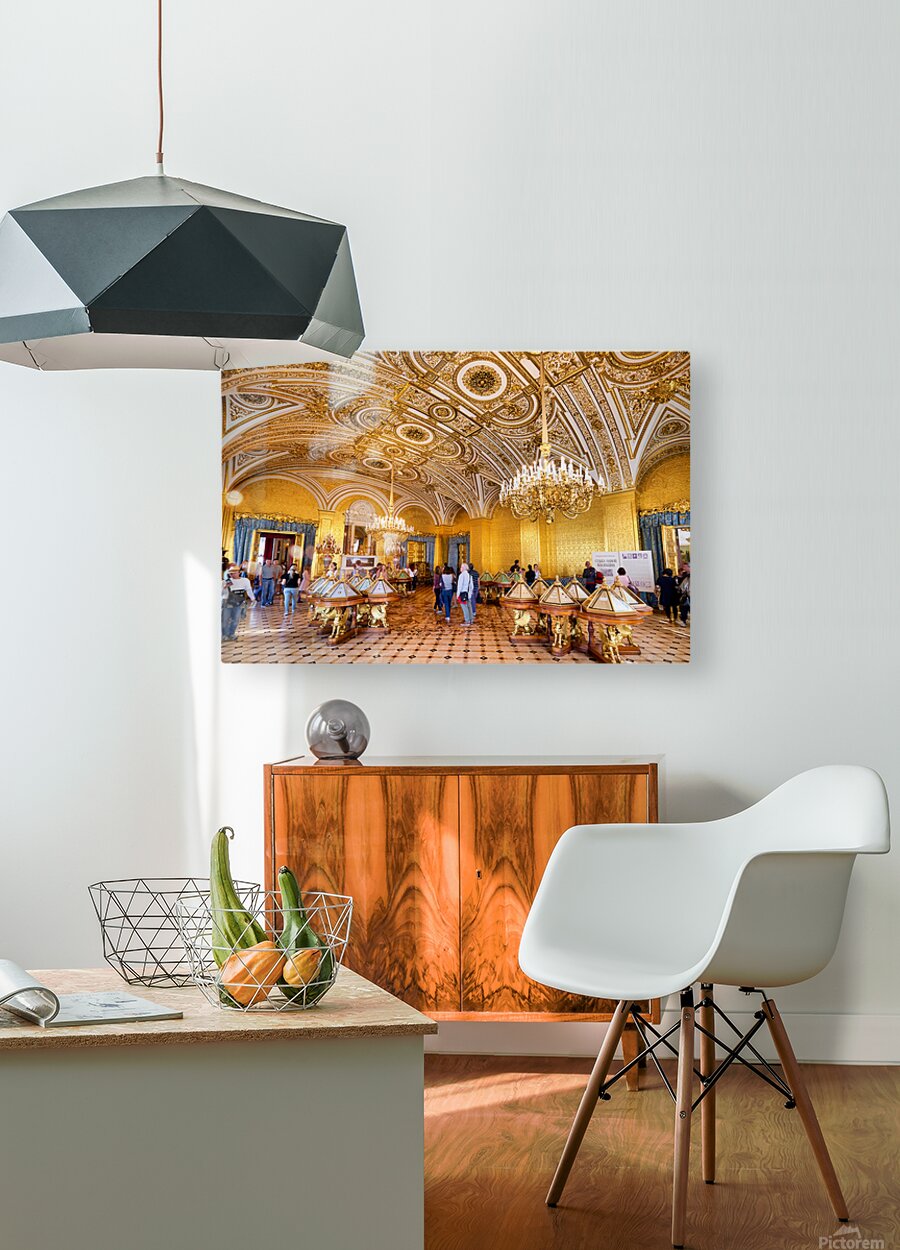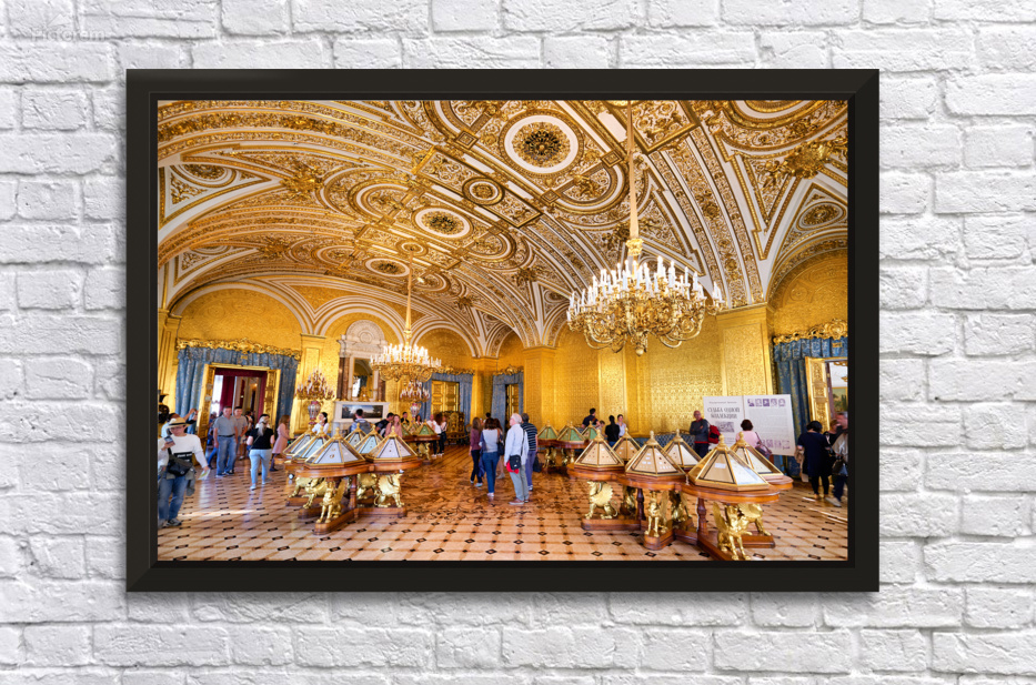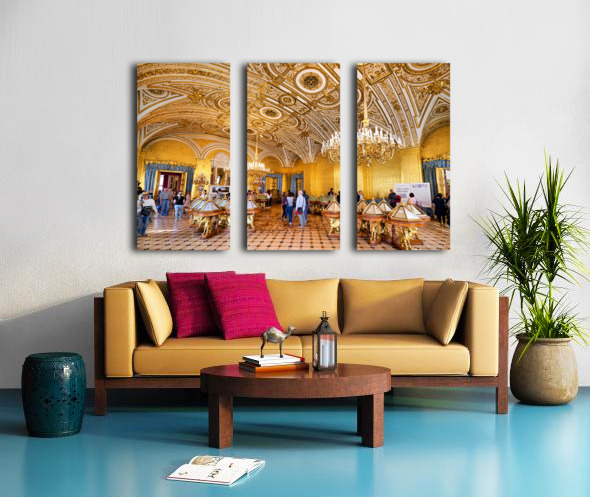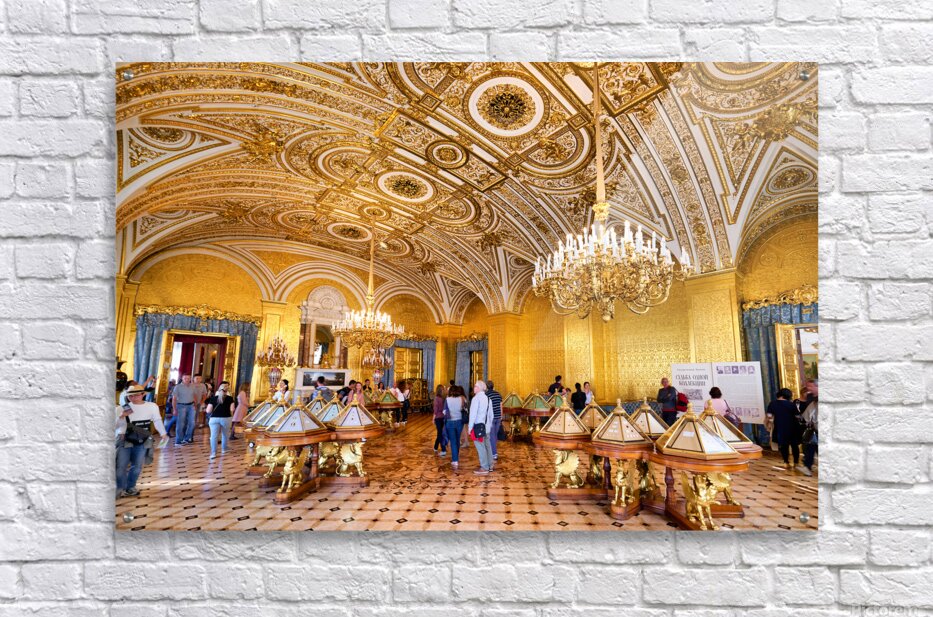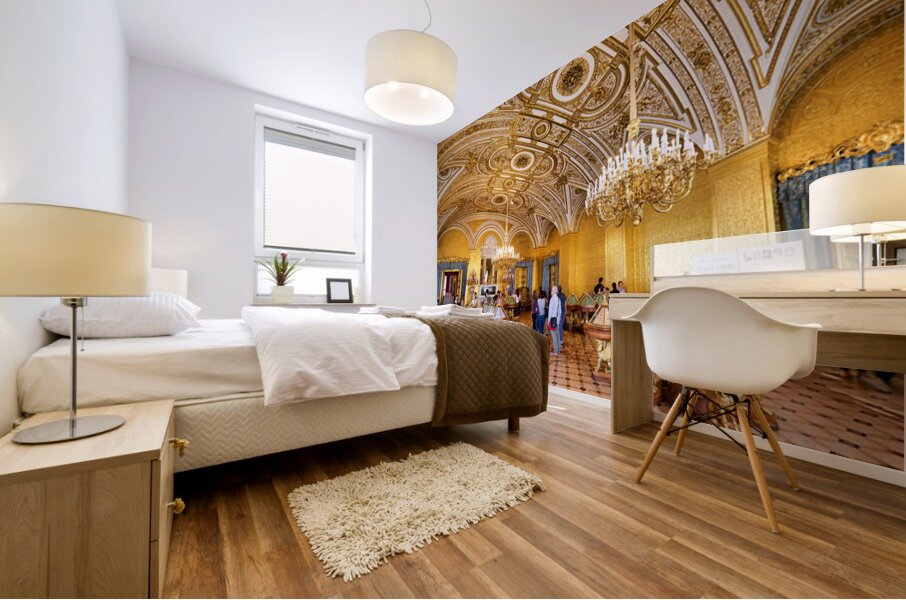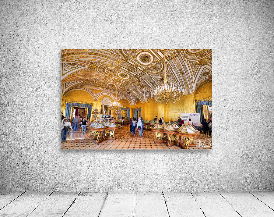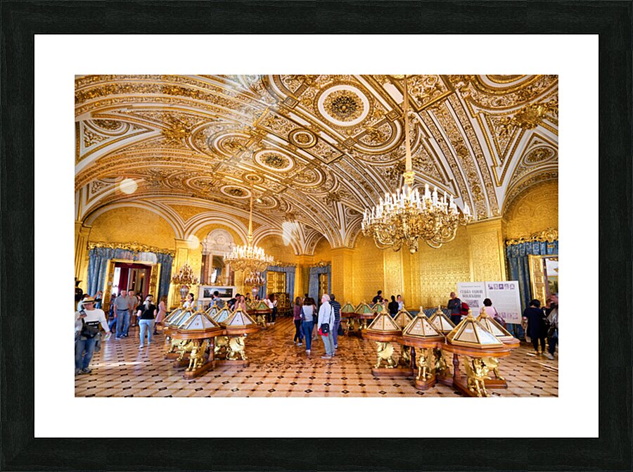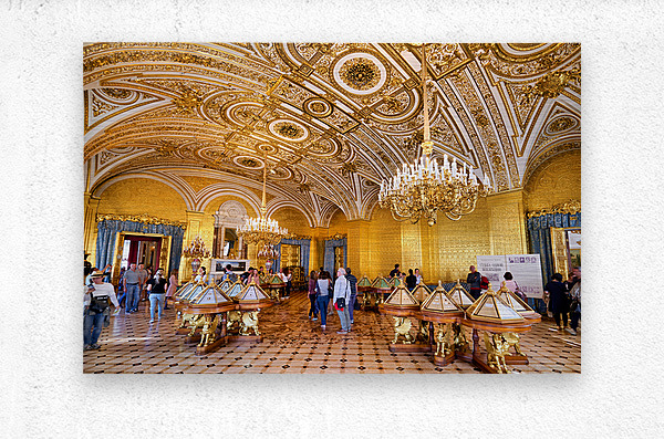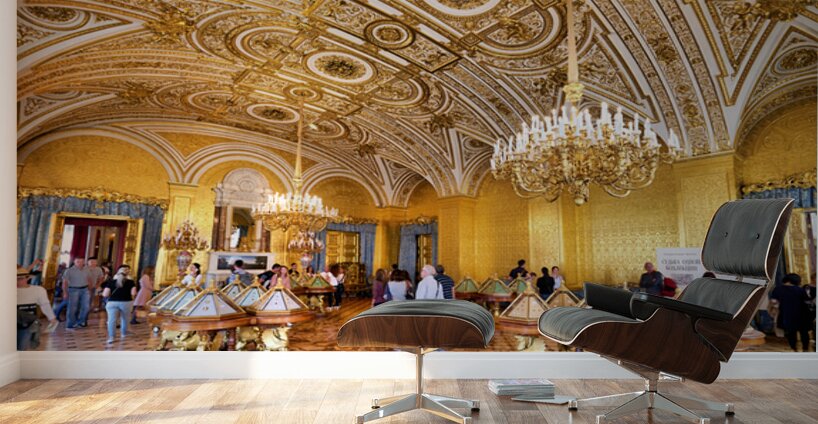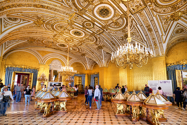 People walk through the ornate interior of the Winter Palace in Saint Petersburg. The room features gold decor and elaborate design.