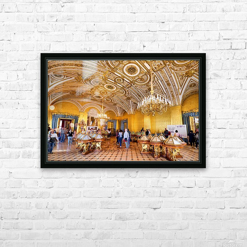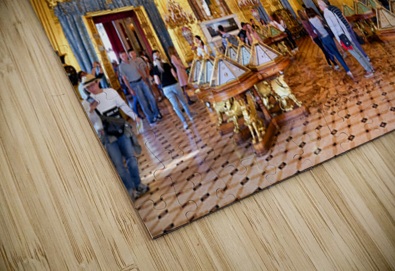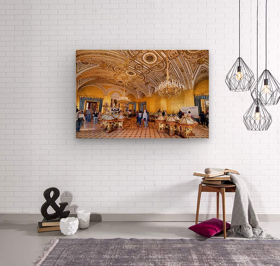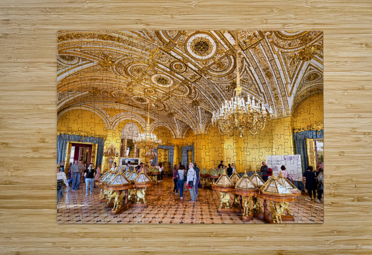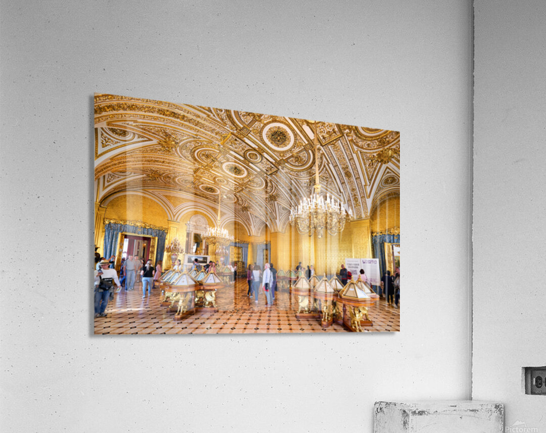 People walk through the ornate interior of the Winter Palace in Saint Petersburg. The room features gold decor and elaborate design.