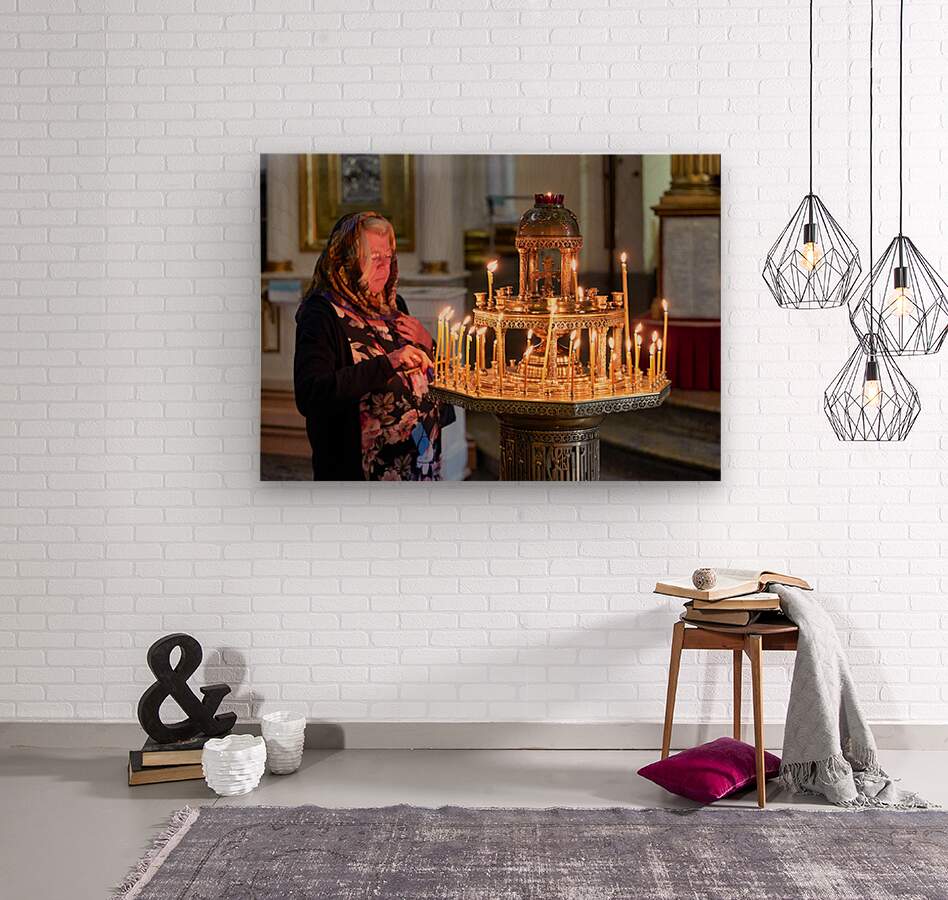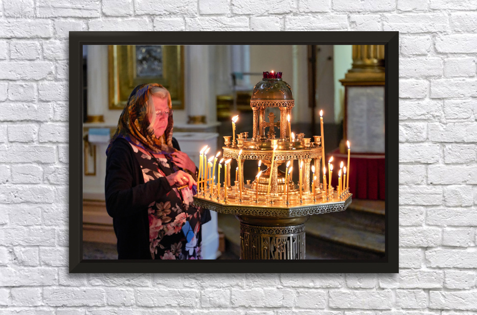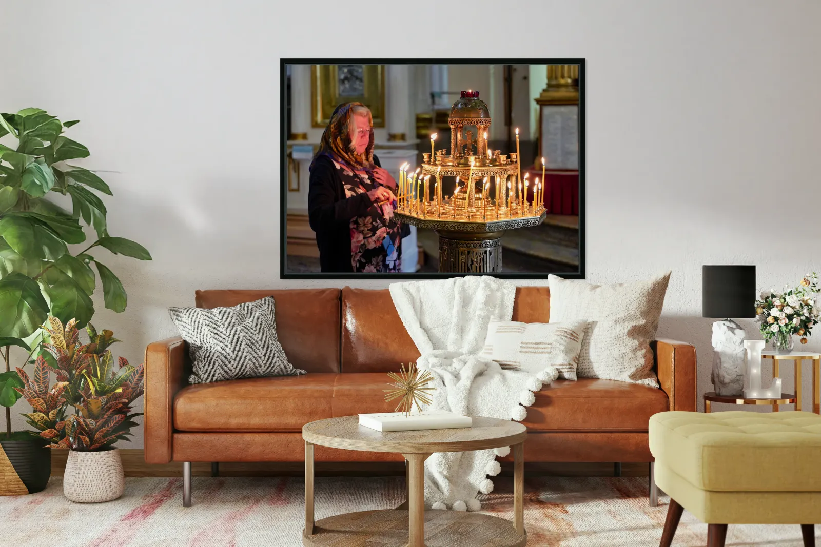 A woman stands near a candle holder at Alexander Nevsky Lavra in Saint Petersburg lighting candles for prayer and reflection.