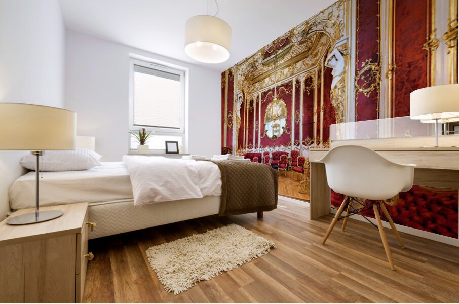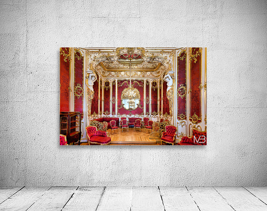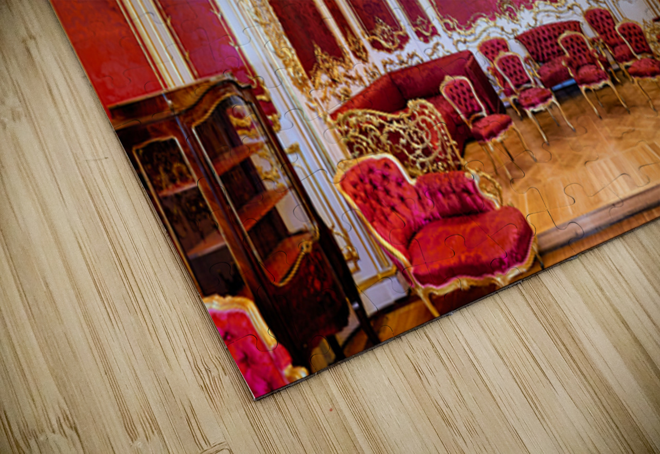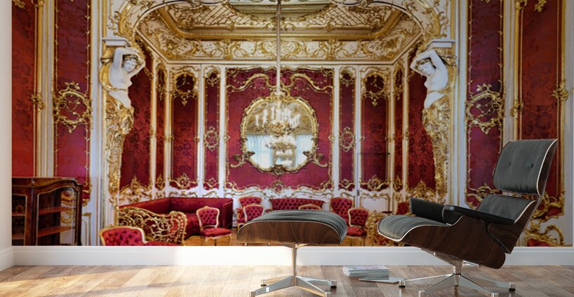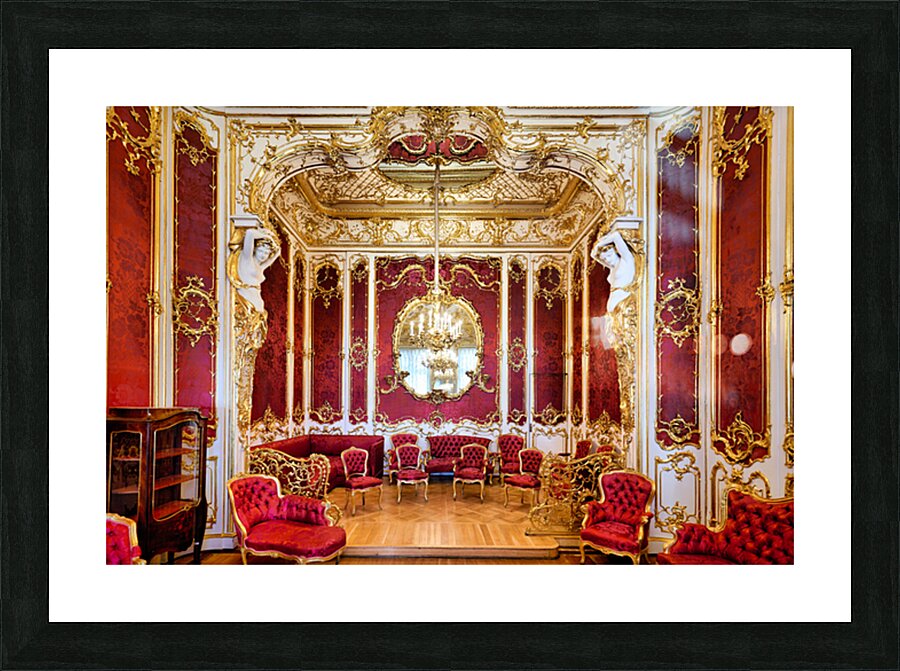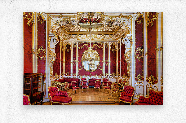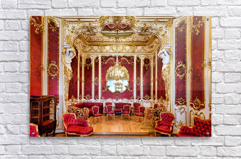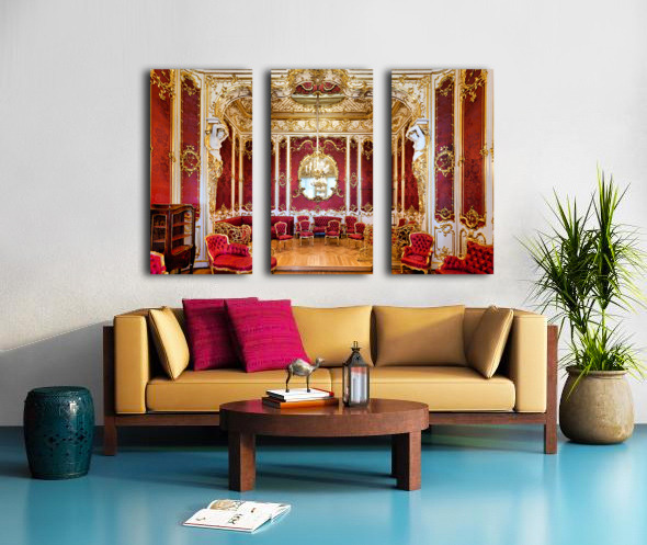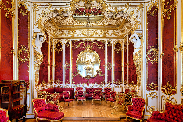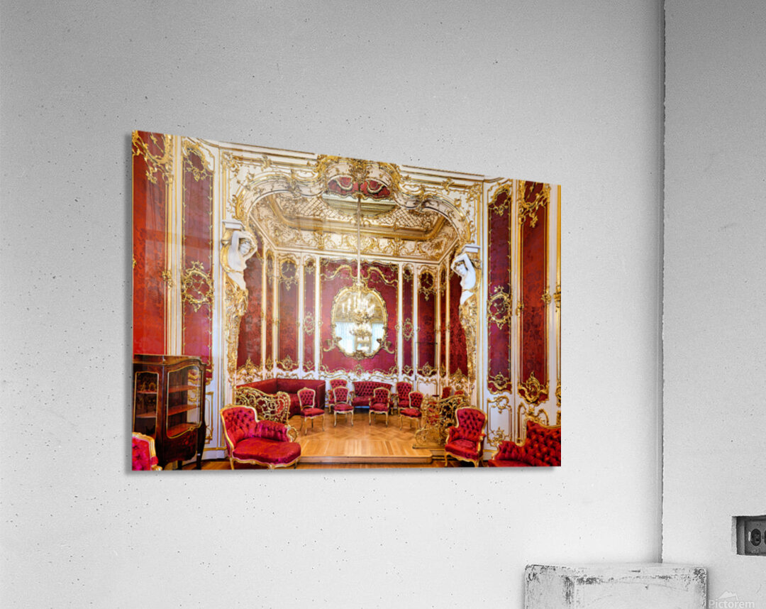 People walk through the Winter Palace in St. Petersburg. The room features rich red decor and ornate gold details.