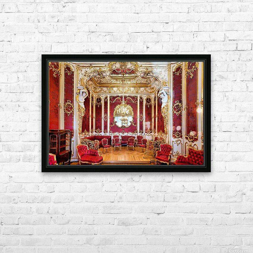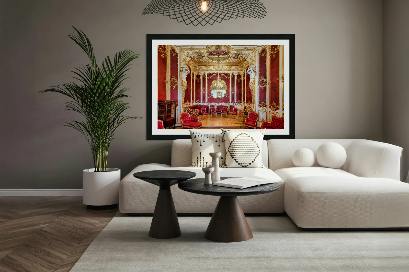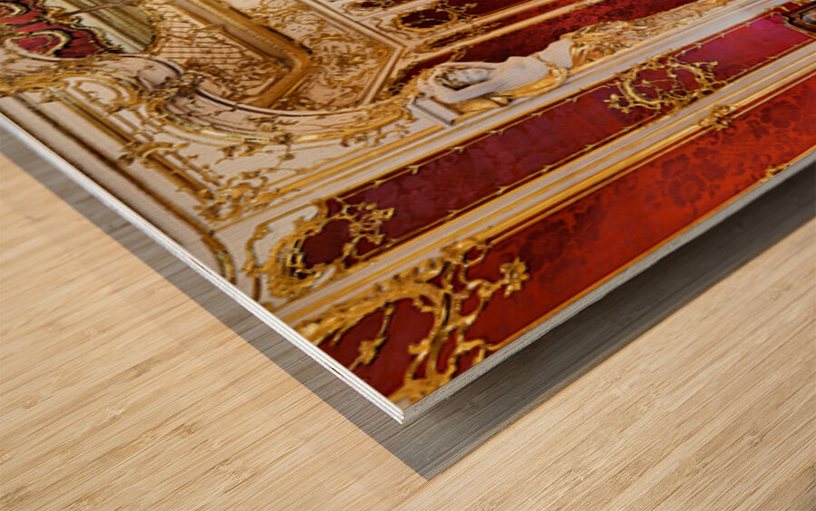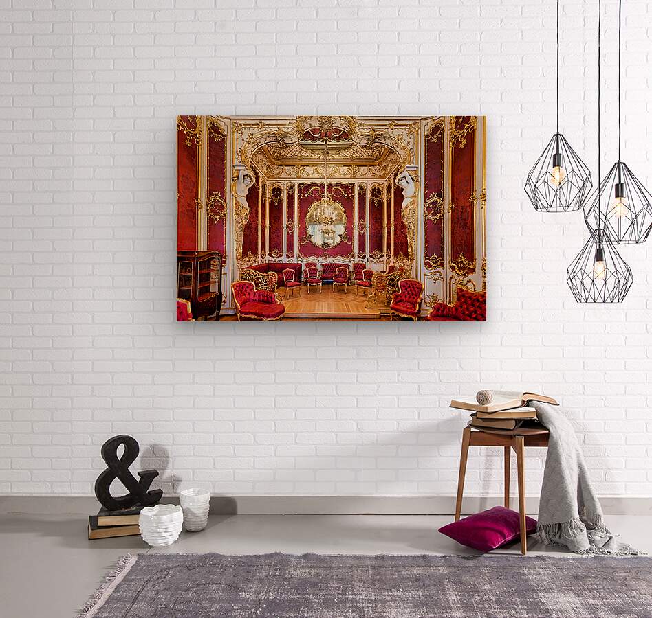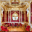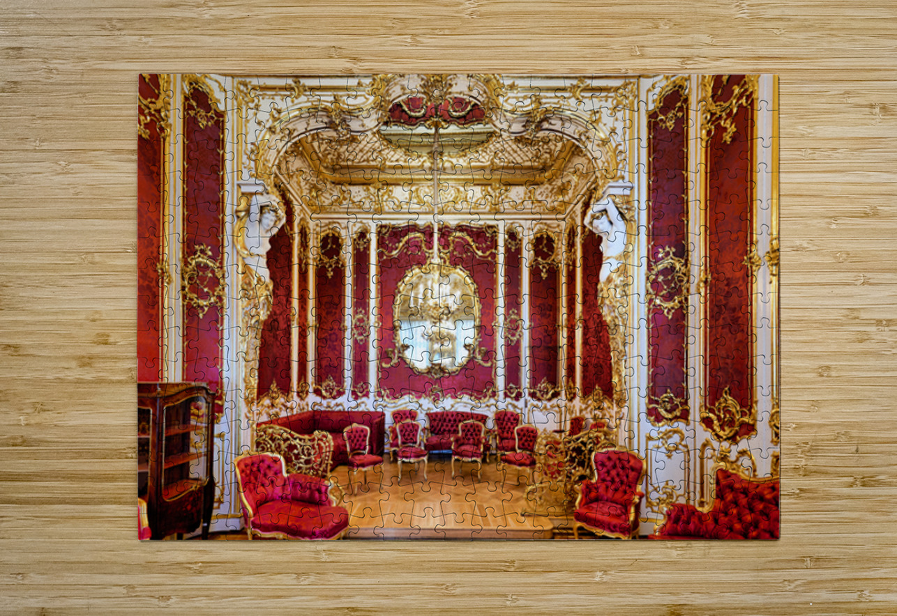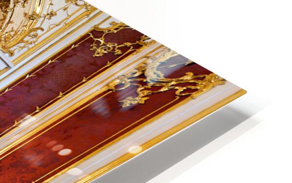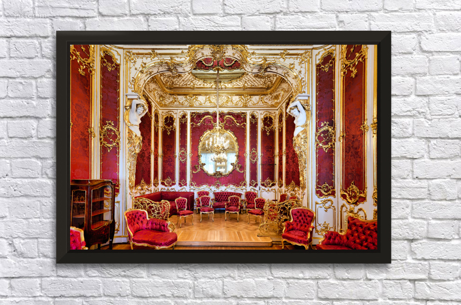 People walk through the Winter Palace in St. Petersburg. The room features rich red decor and ornate gold details.