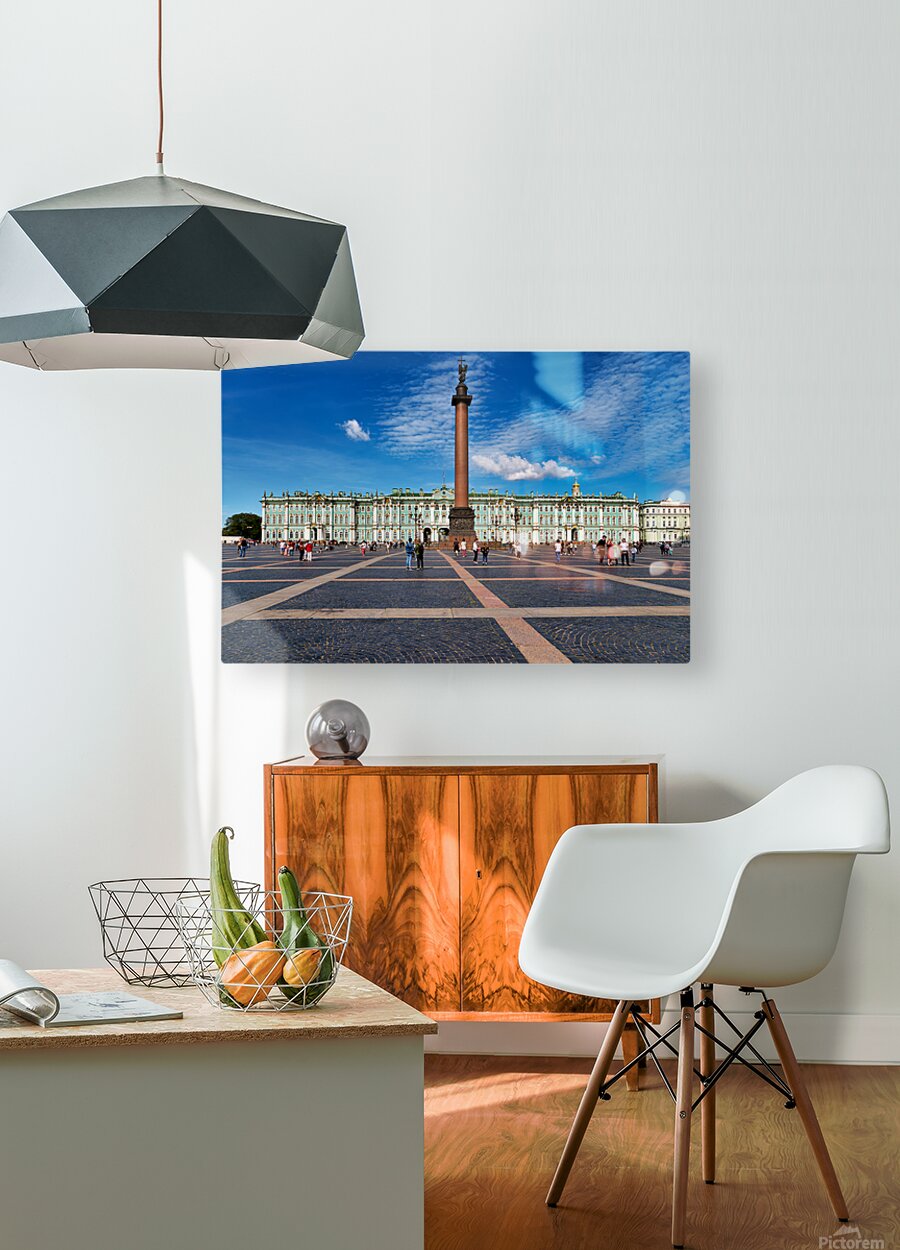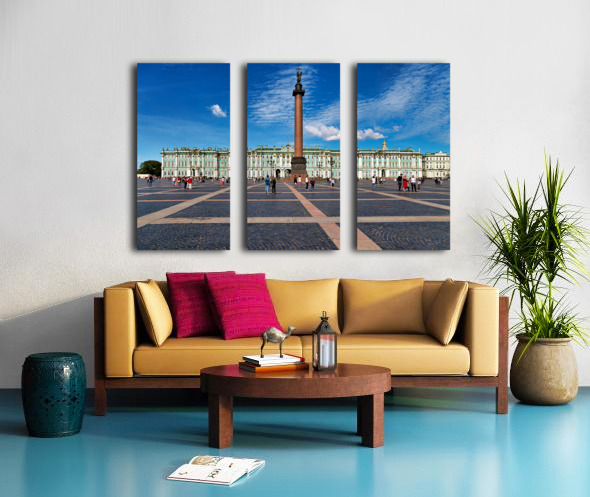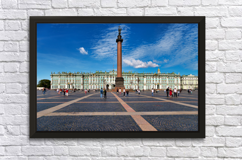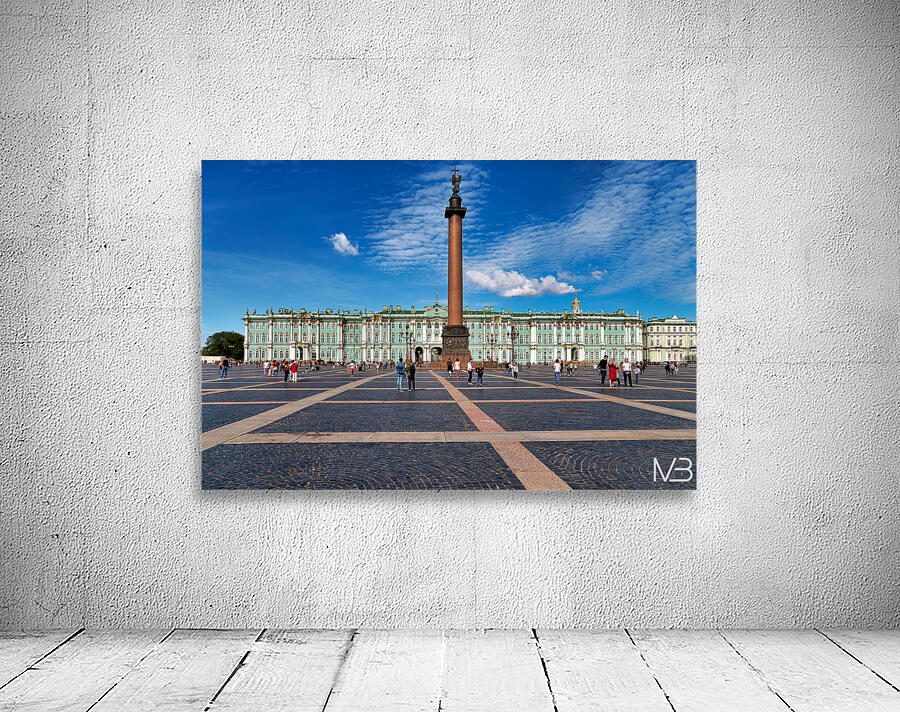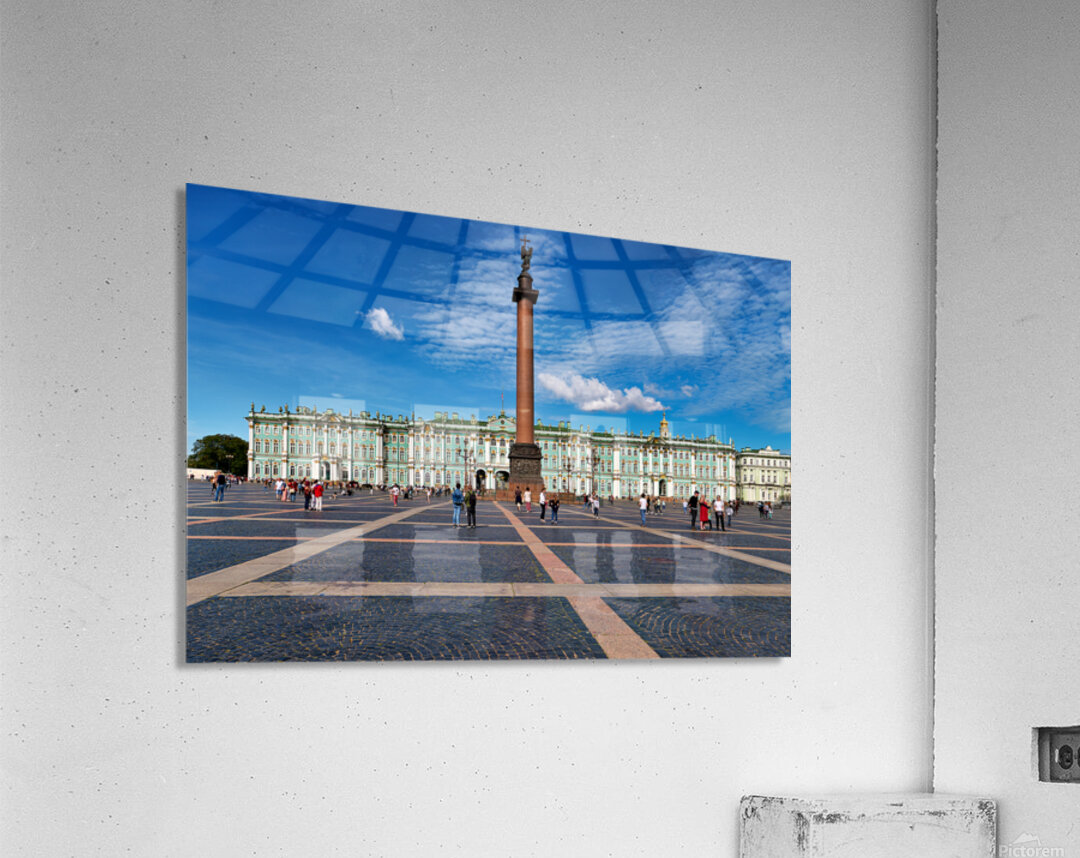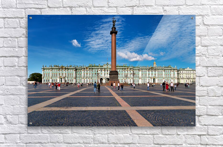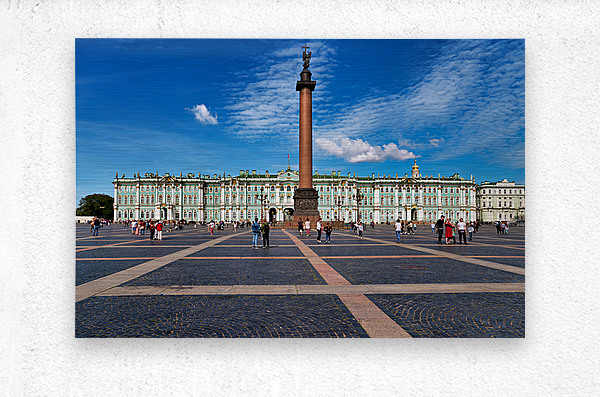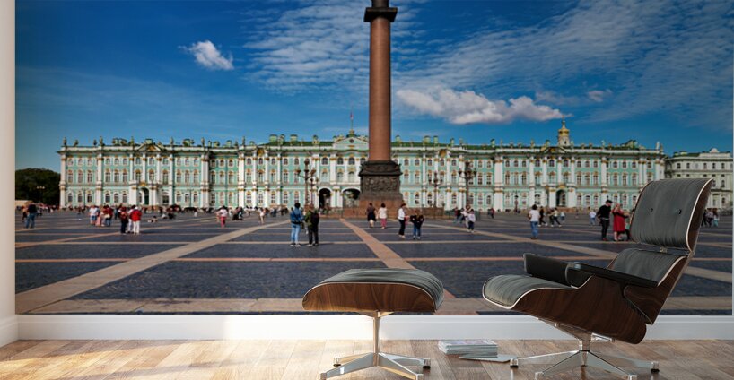 People walk and explore the Winter Palace at Palace Square in St. Petersburg. Clear skies add to the lively atmosphere of this historic site.
