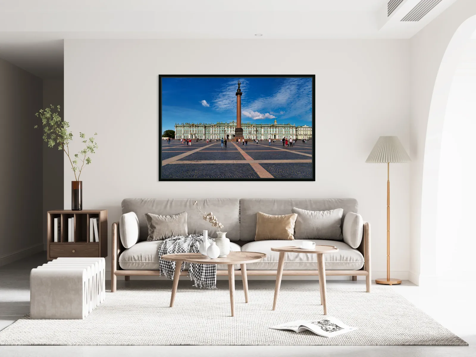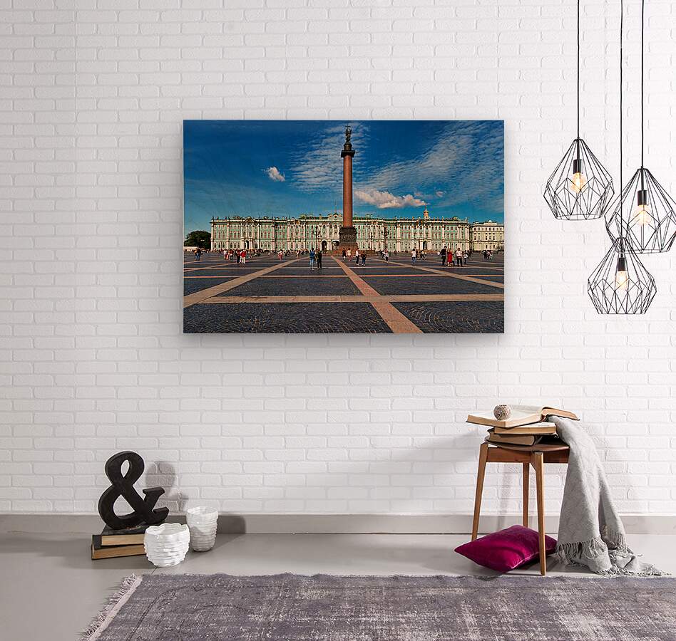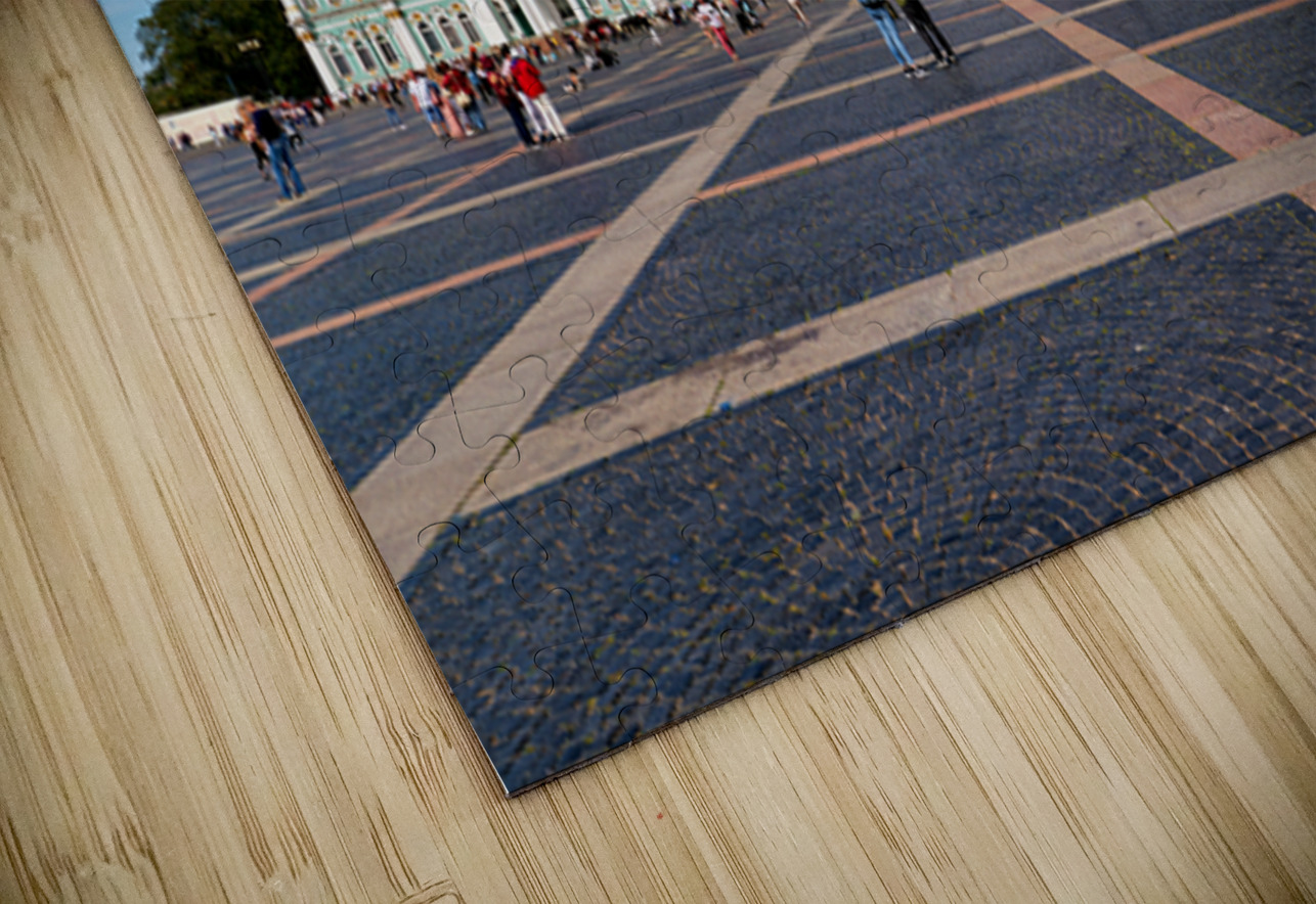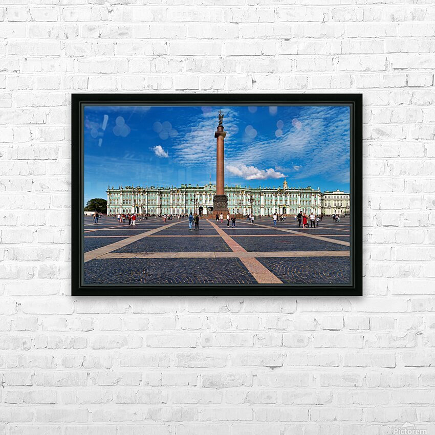 People walk and explore the Winter Palace at Palace Square in St. Petersburg. Clear skies add to the lively atmosphere of this historic site.