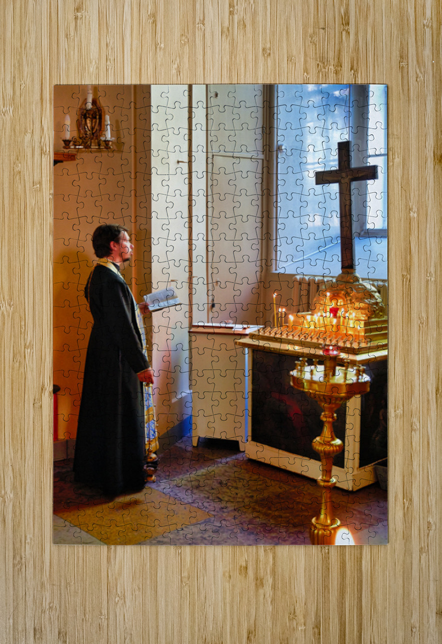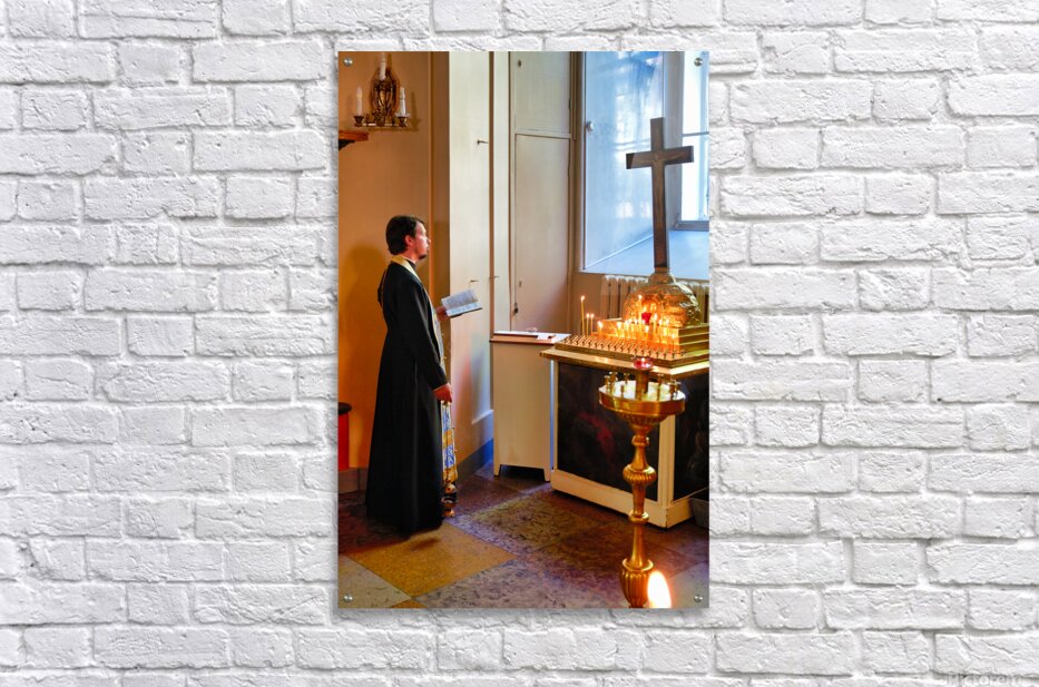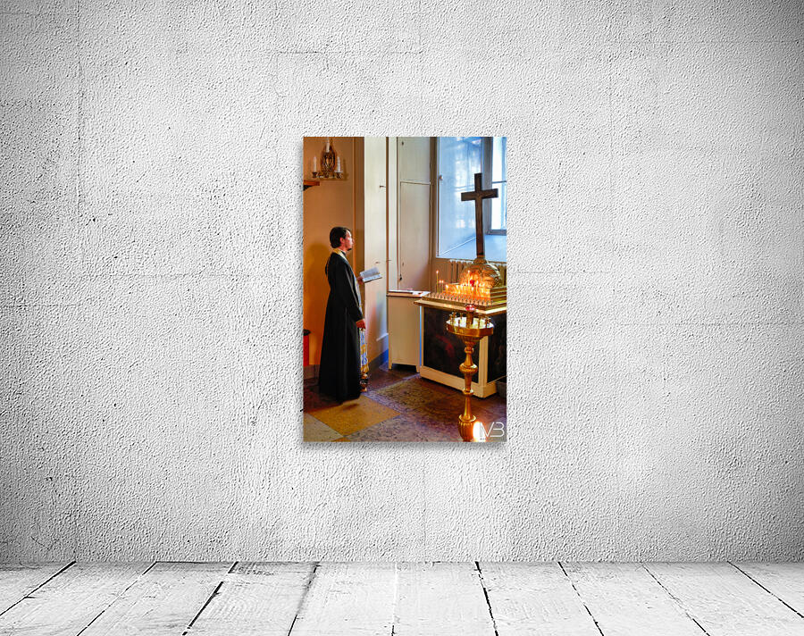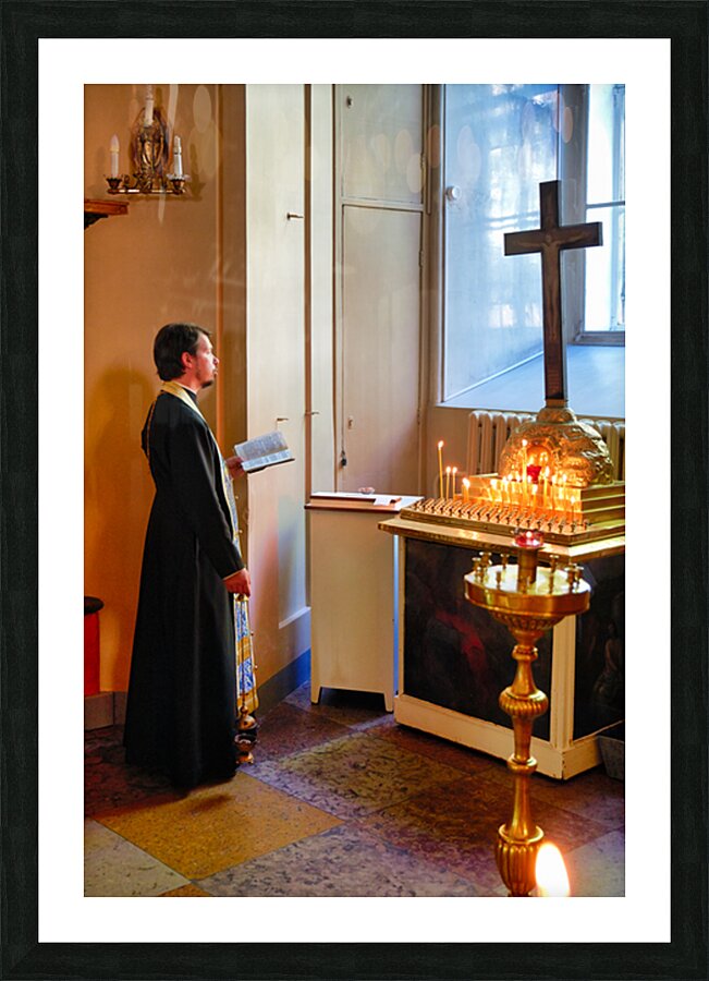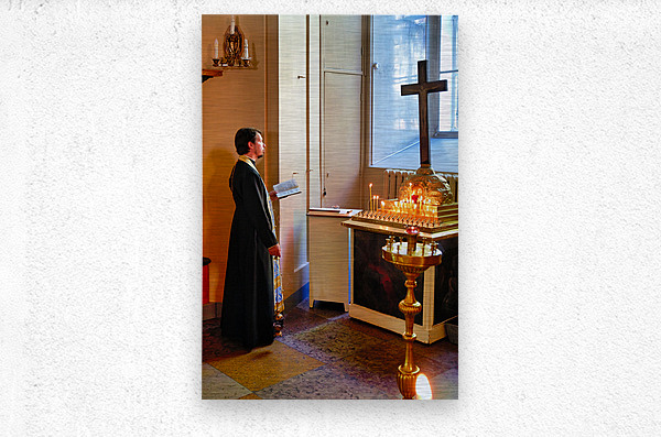 A person stands in prayer at a candle altar inside Transfiguration Cathedral in St. Petersburg. Light from candles fills the space.