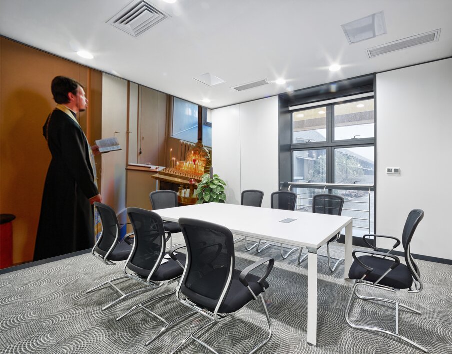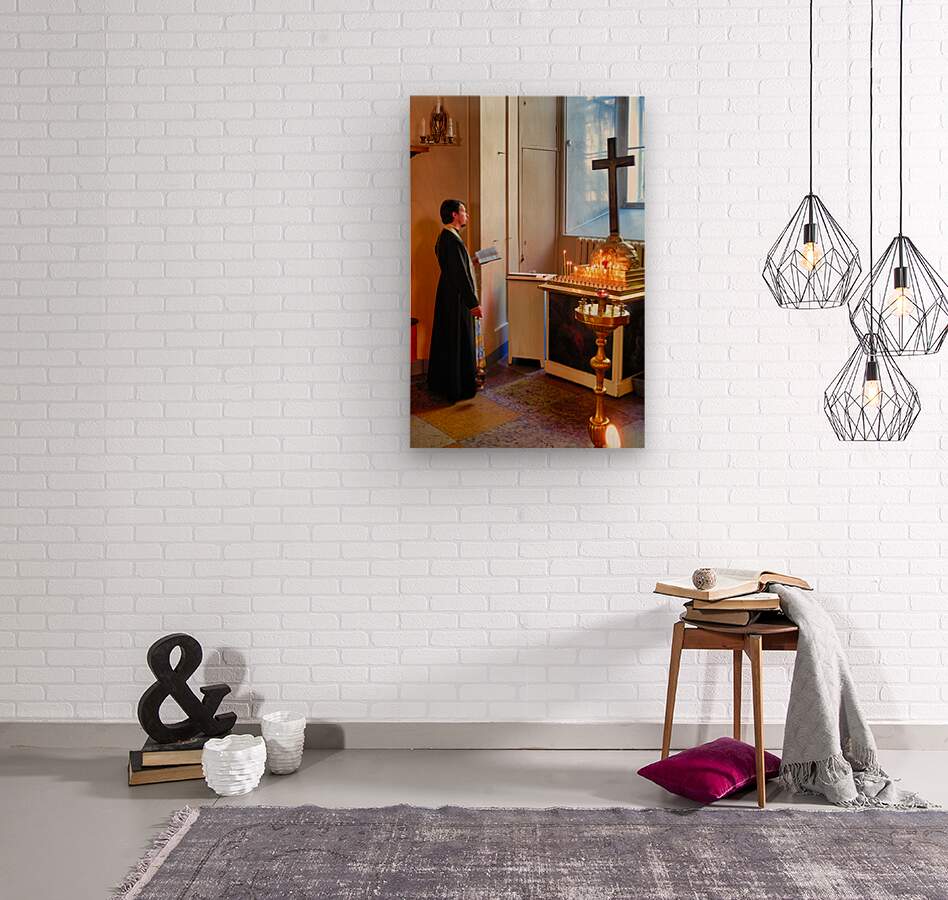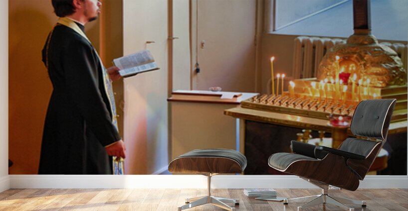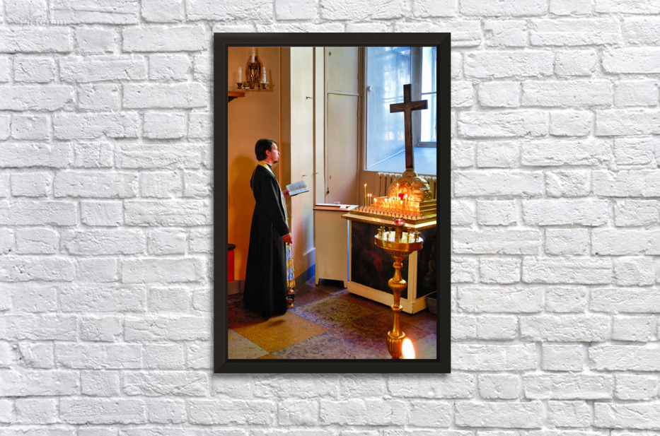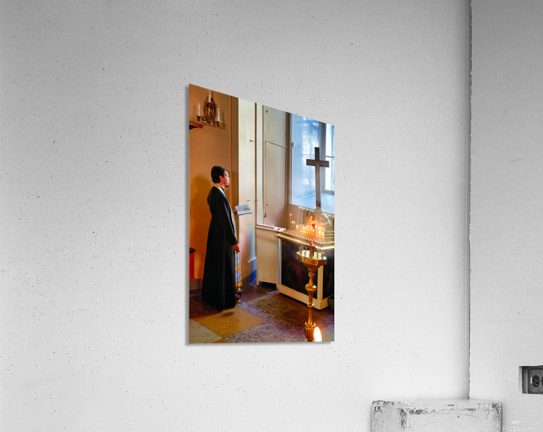 A person stands in prayer at a candle altar inside Transfiguration Cathedral in St. Petersburg. Light from candles fills the space.