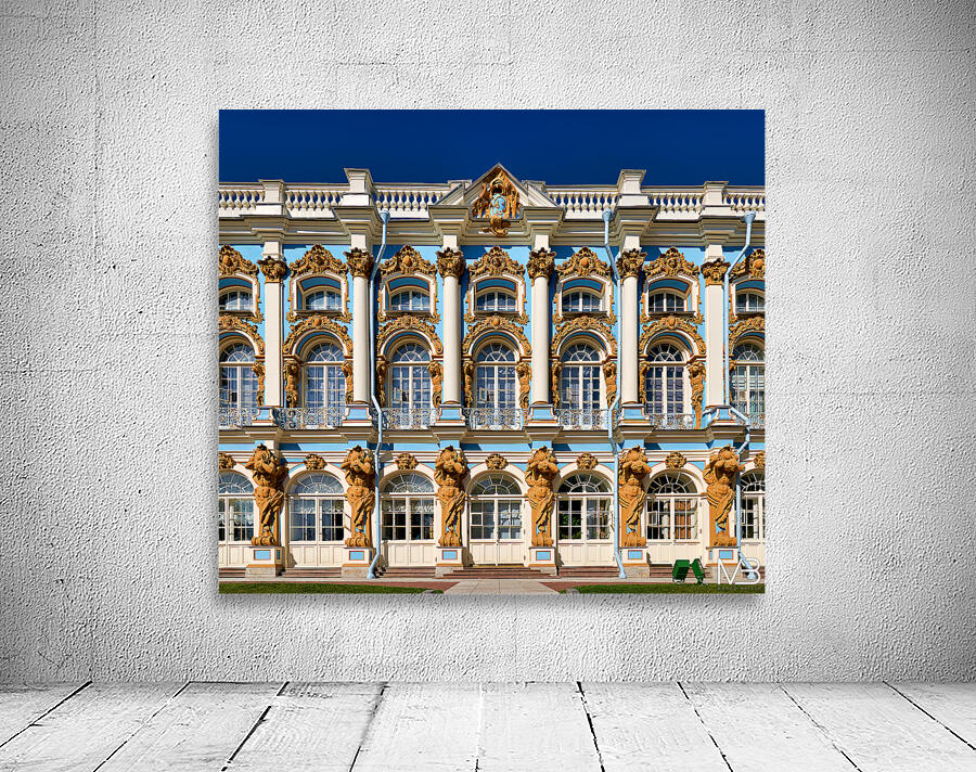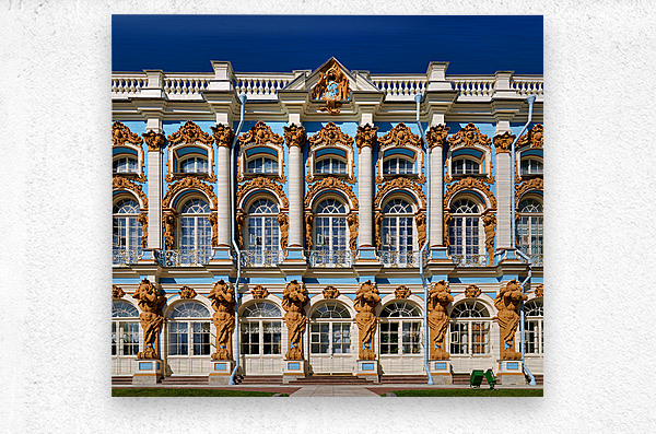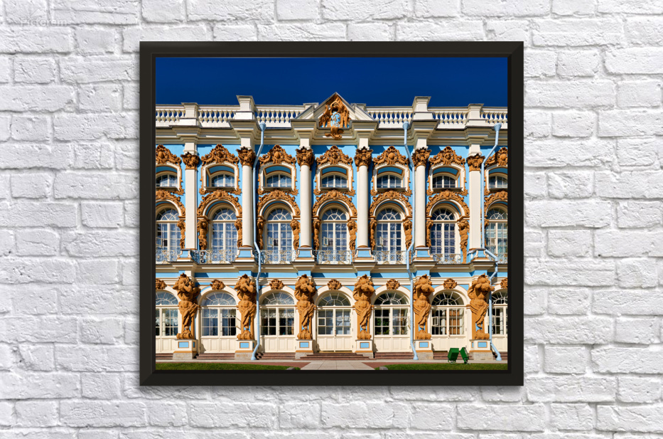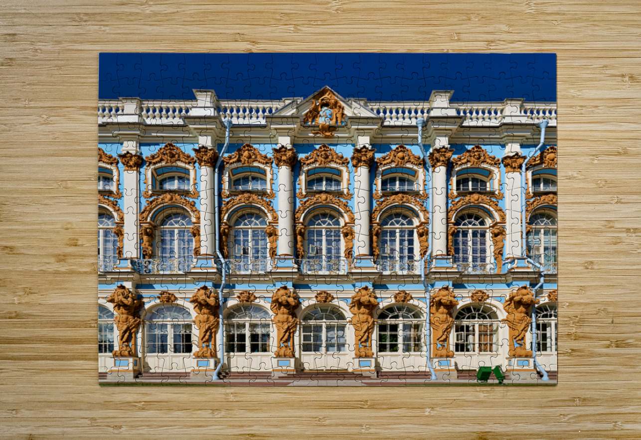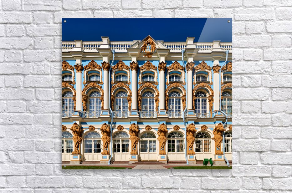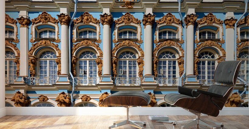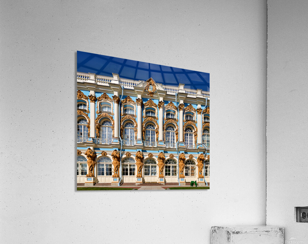 Visitors admire the detailed facade of Catherine Palace in Pushkin St. Petersburg. The colorful architecture draws many tourists.
