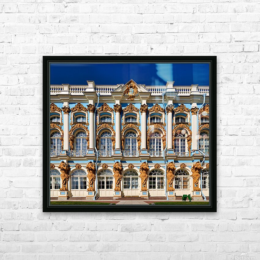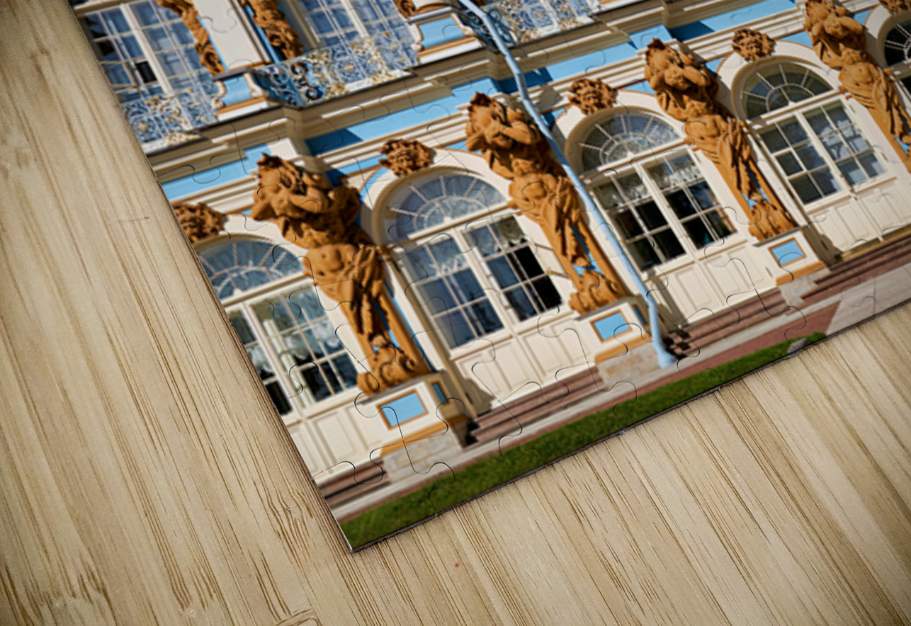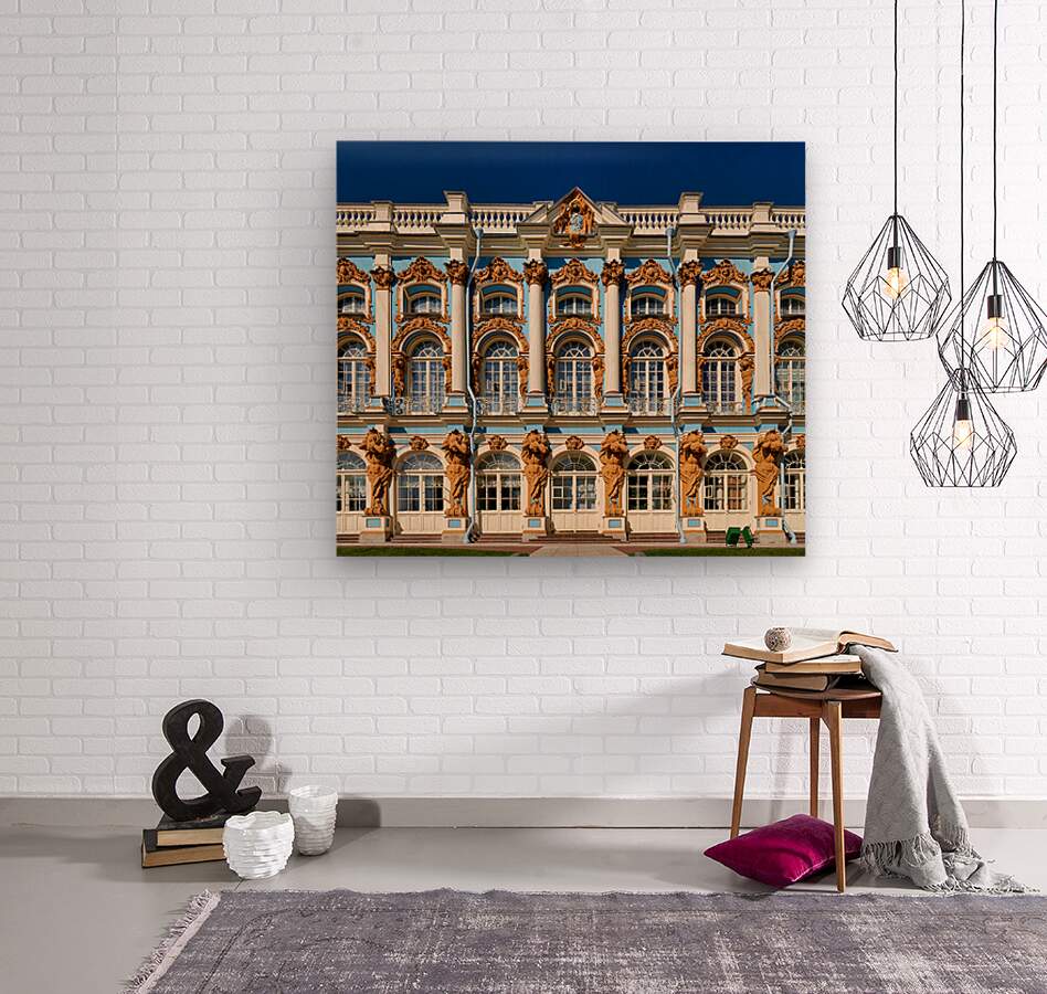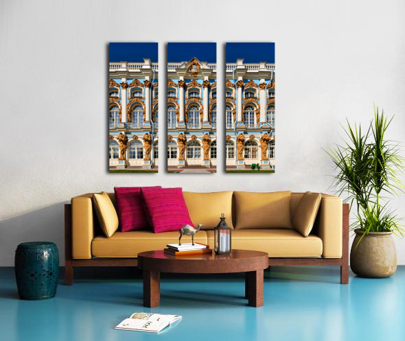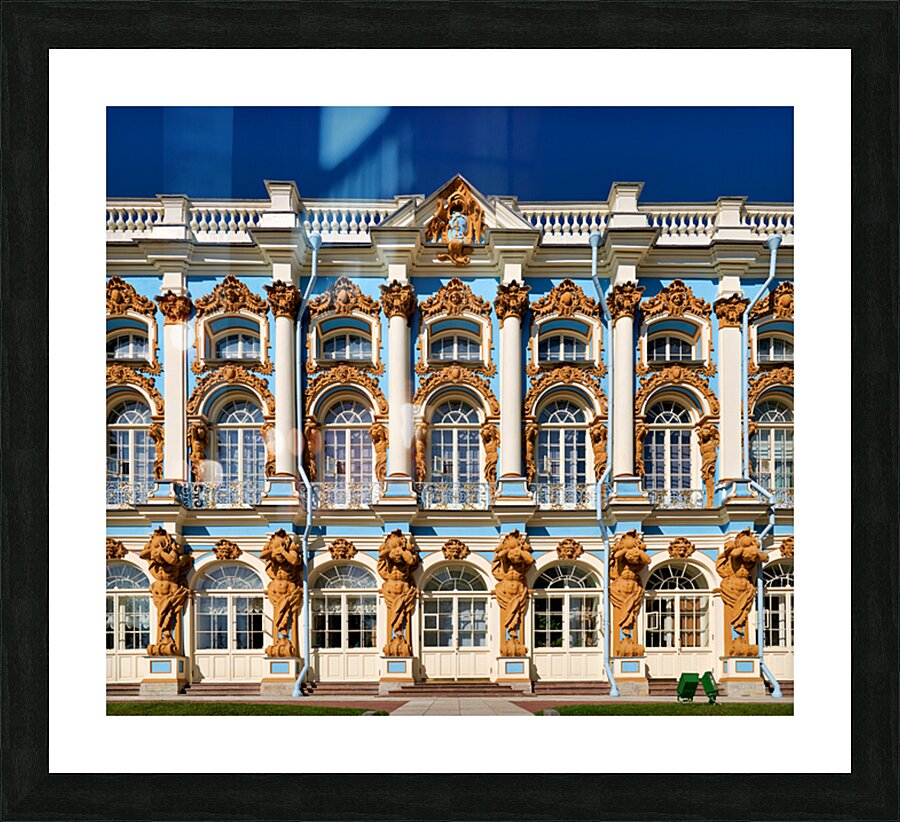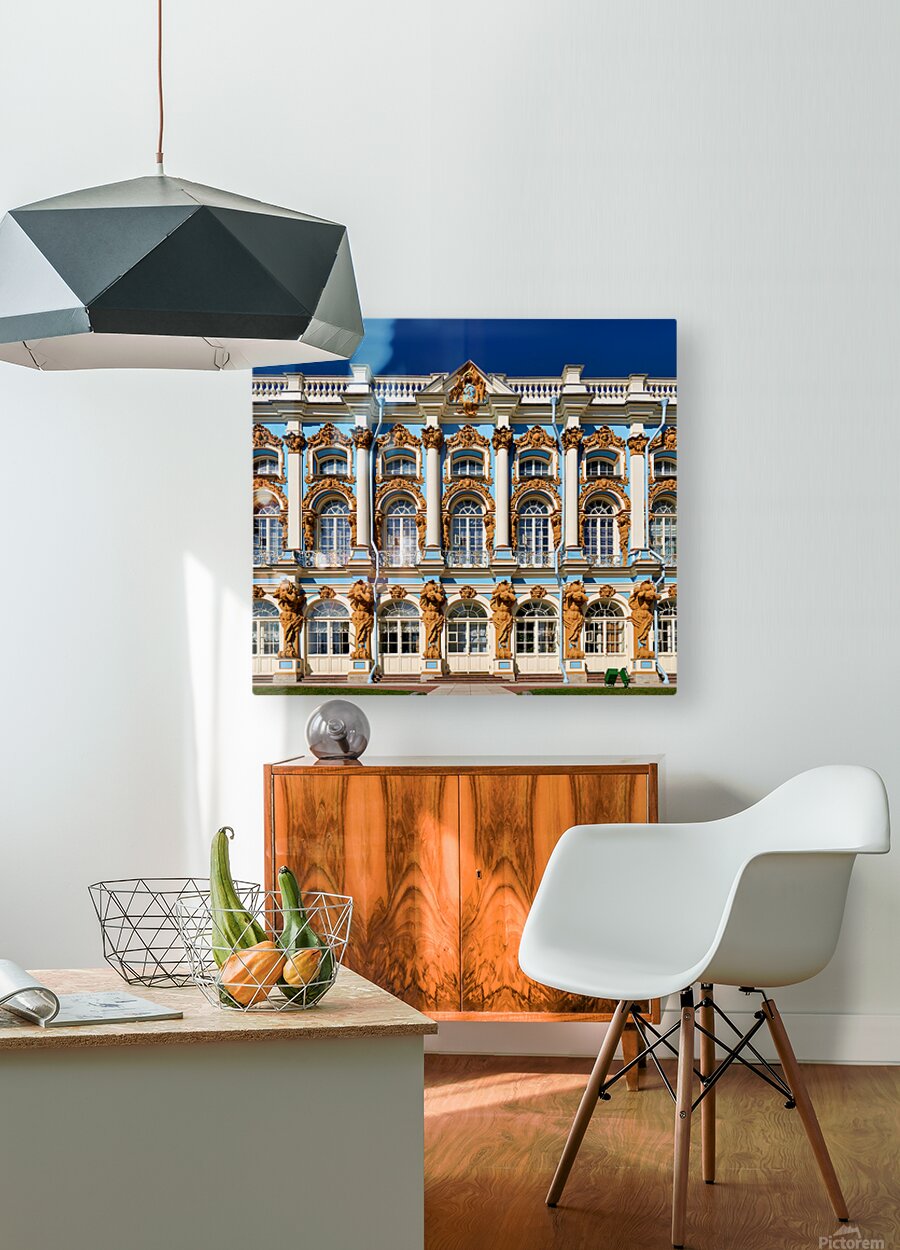 Visitors admire the detailed facade of Catherine Palace in Pushkin St. Petersburg. The colorful architecture draws many tourists.
