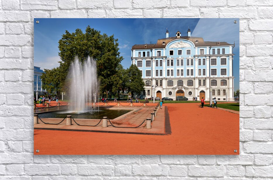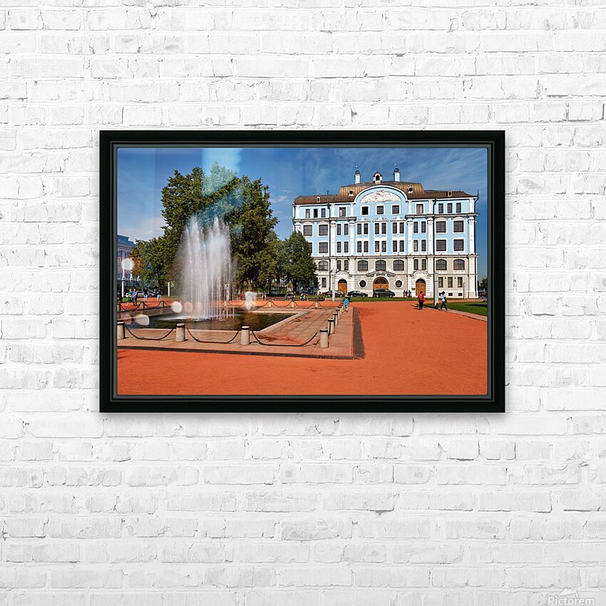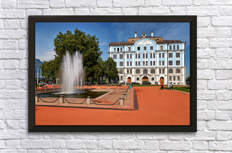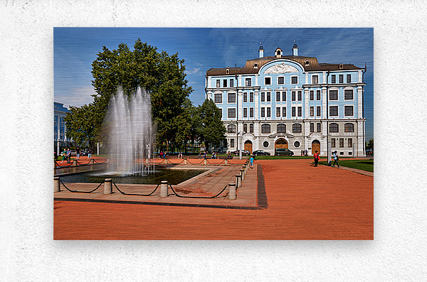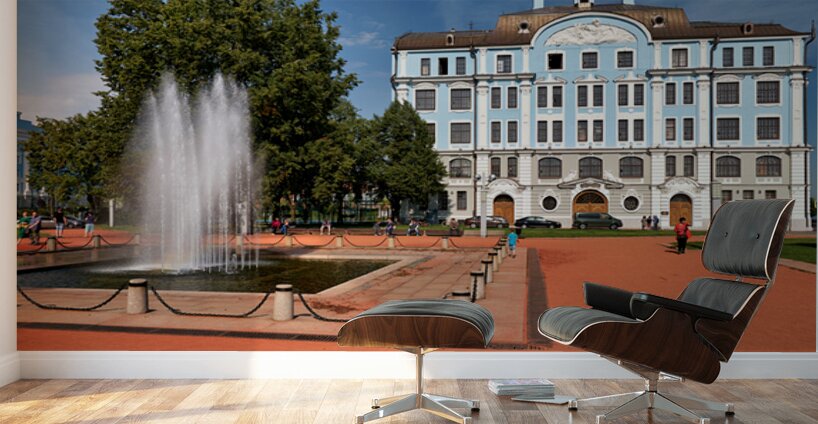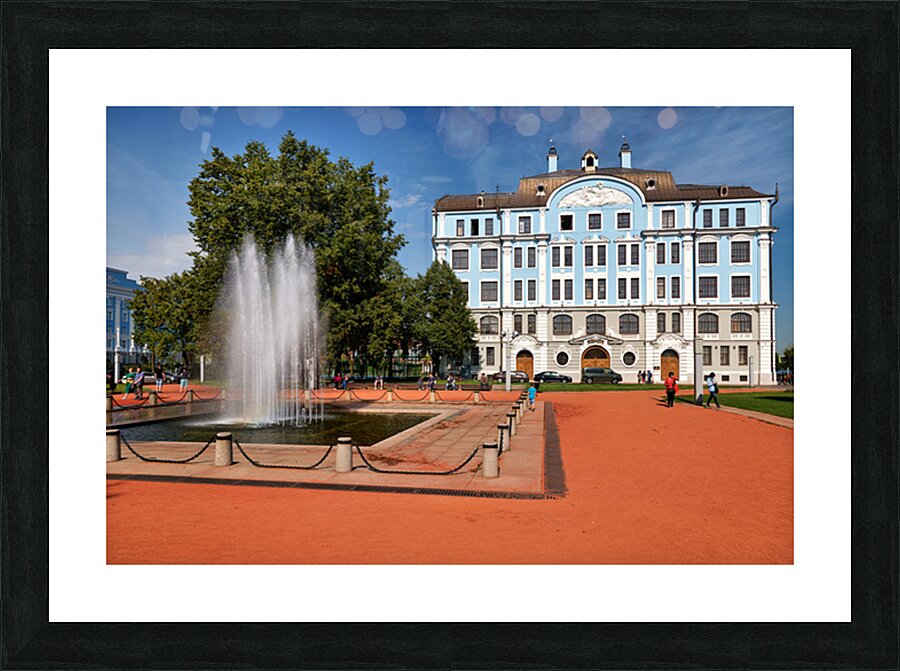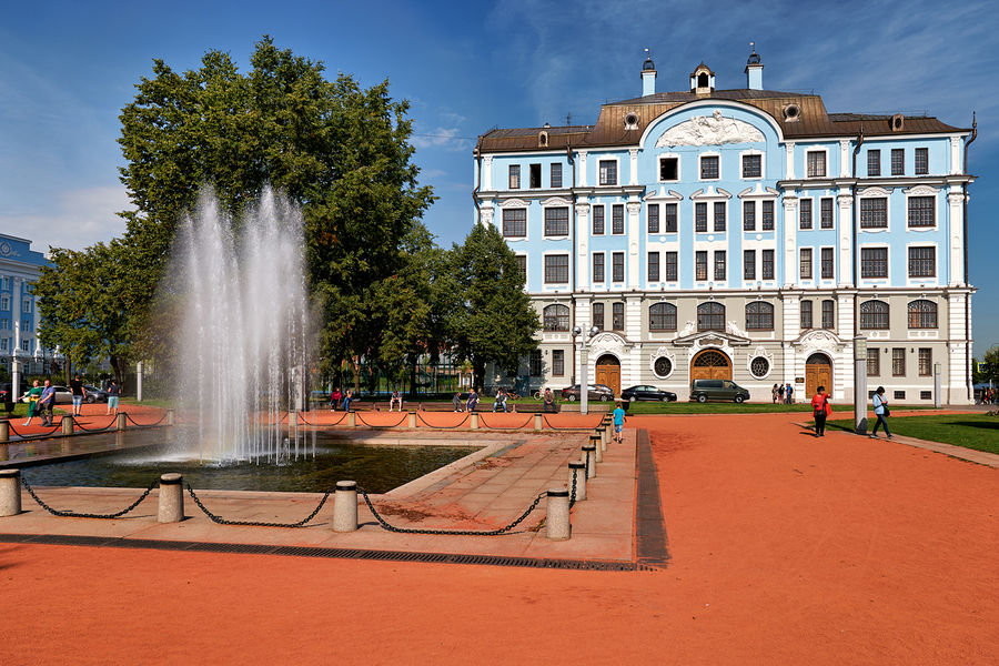 People walk near a fountain and building in St. Petersburg. The sun shines on the blue structure and park area where students gather.