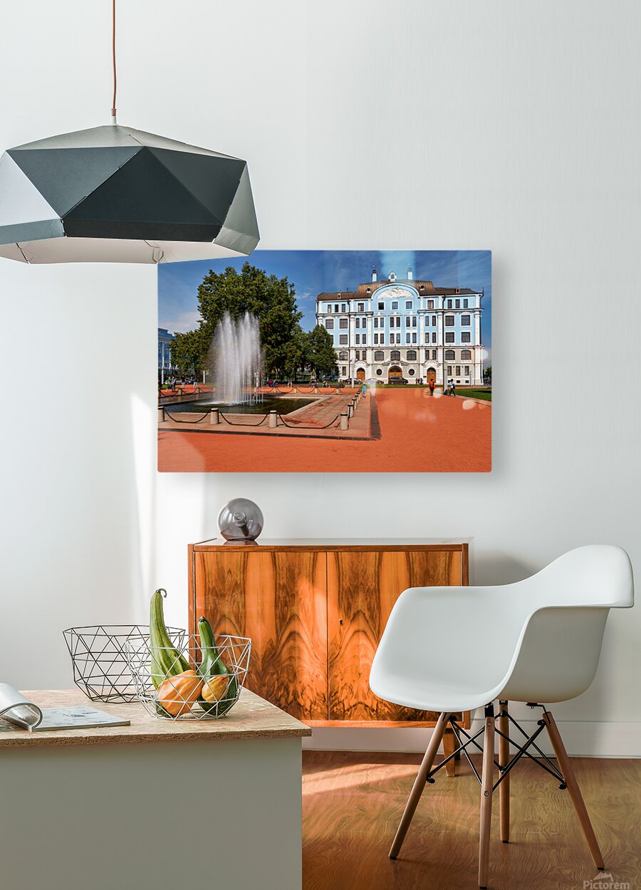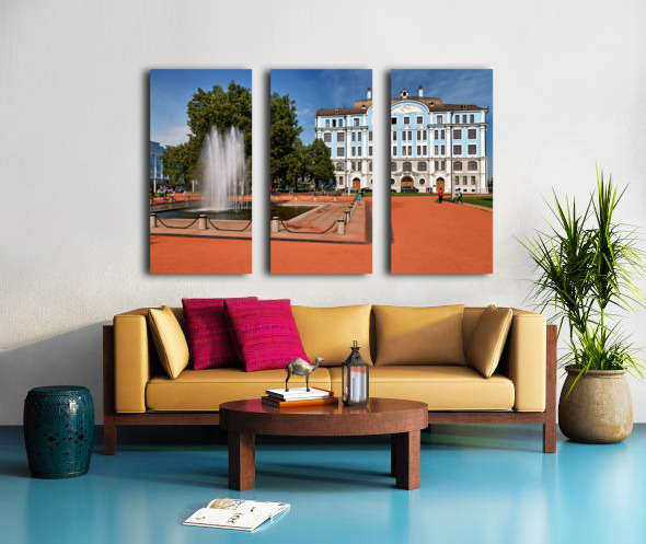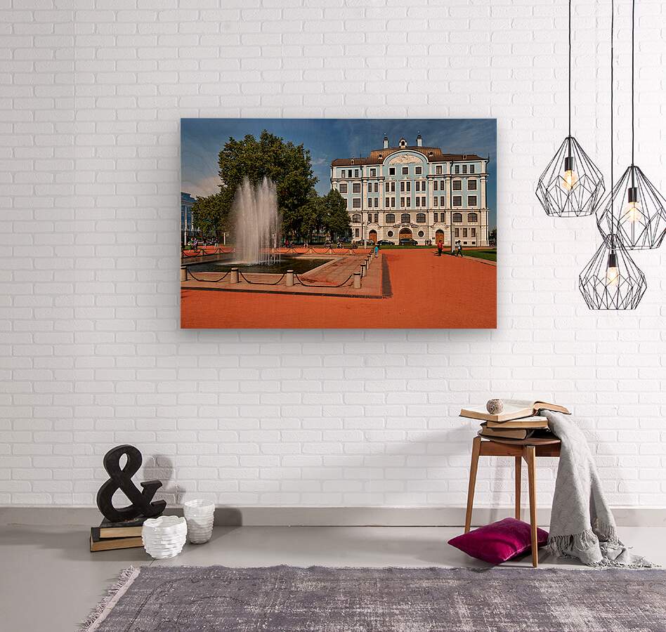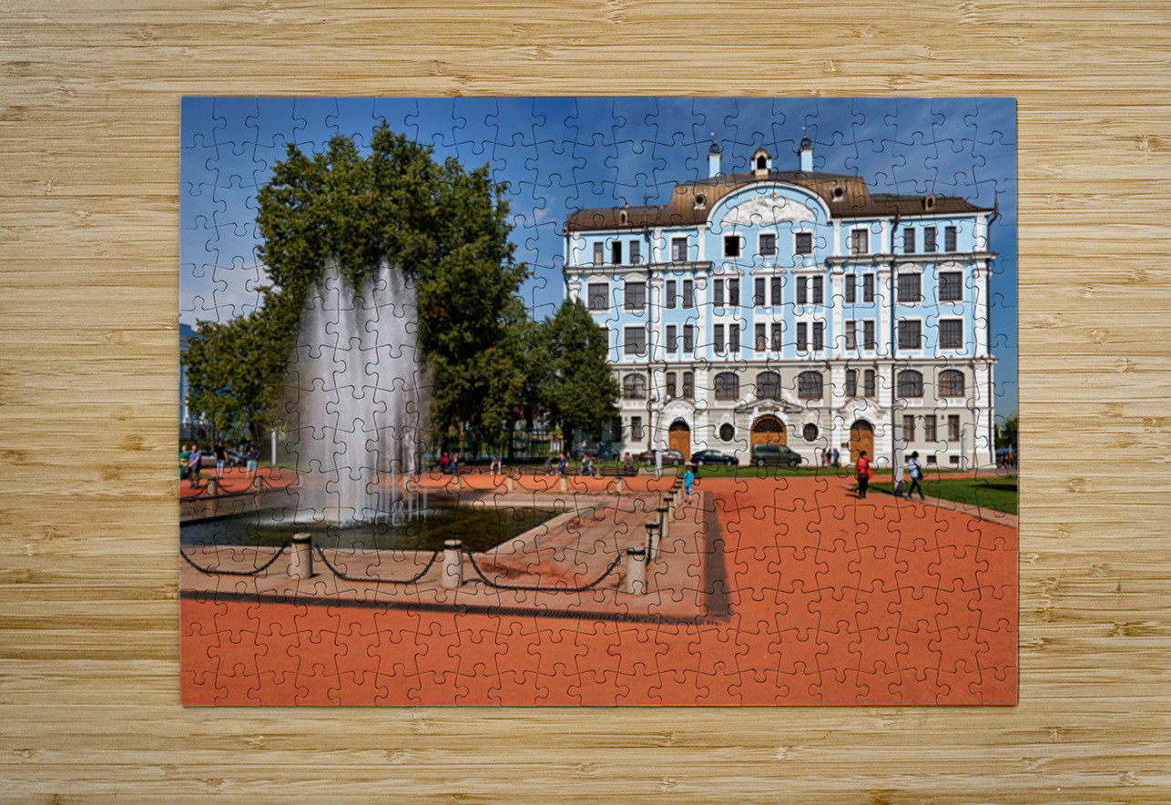 People walk near a fountain and building in St. Petersburg. The sun shines on the blue structure and park area where students gather.