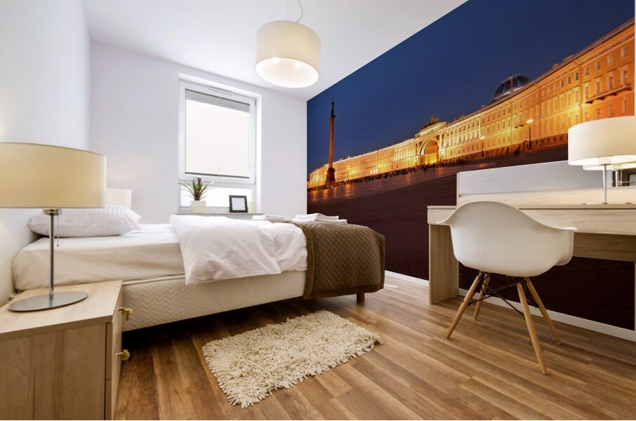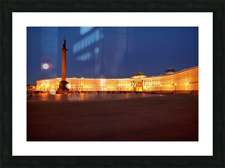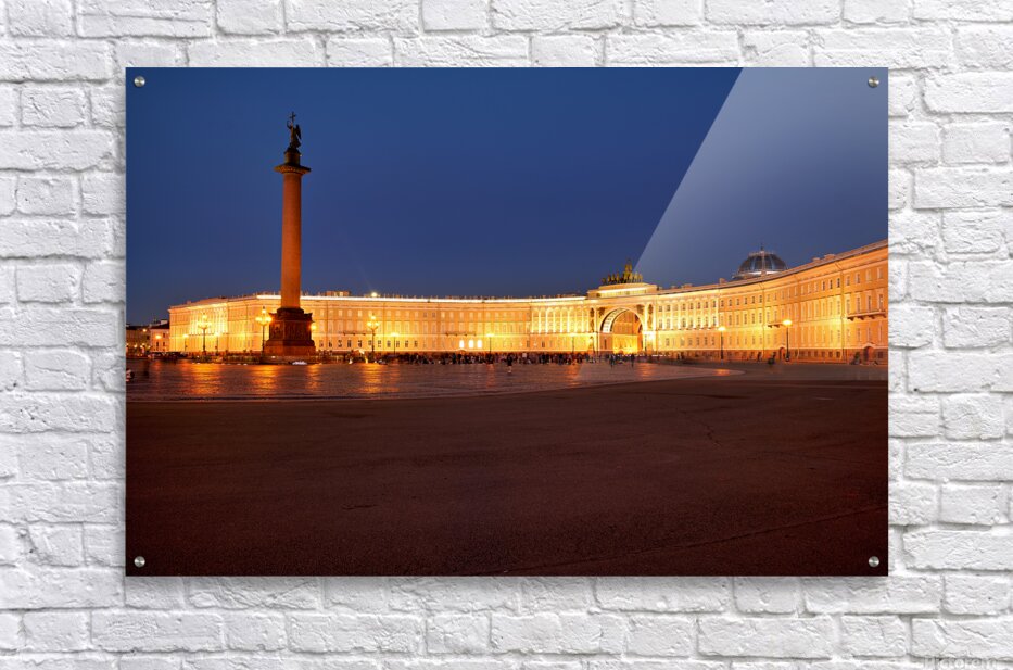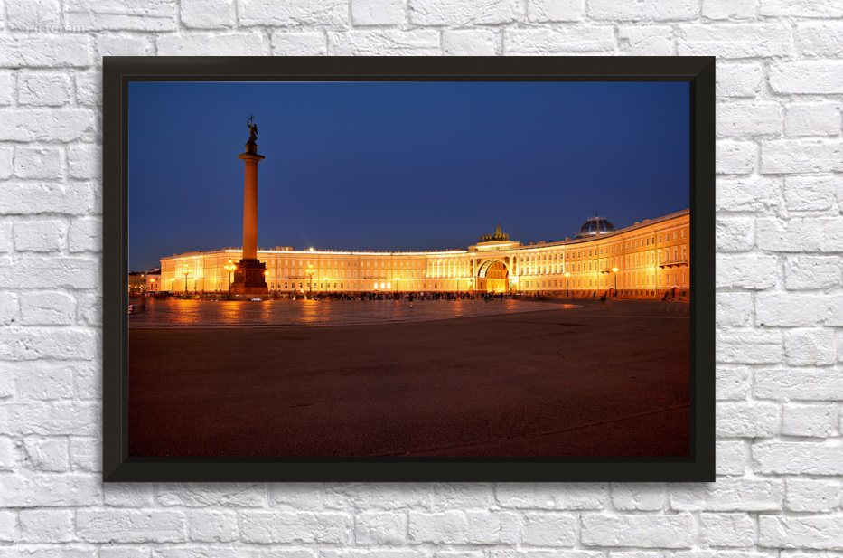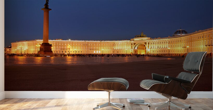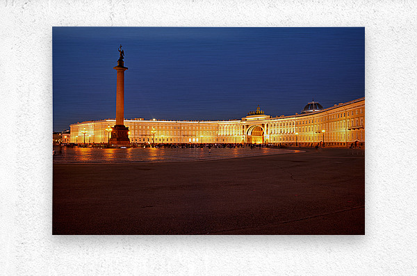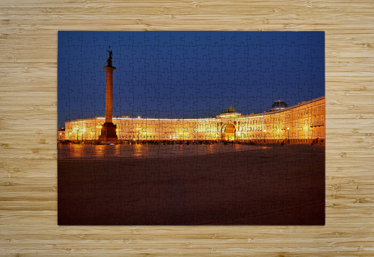 The Winter Palace stands tall in Palace Square lit warmly under the night sky with the Alexander Column nearby and people walking around.