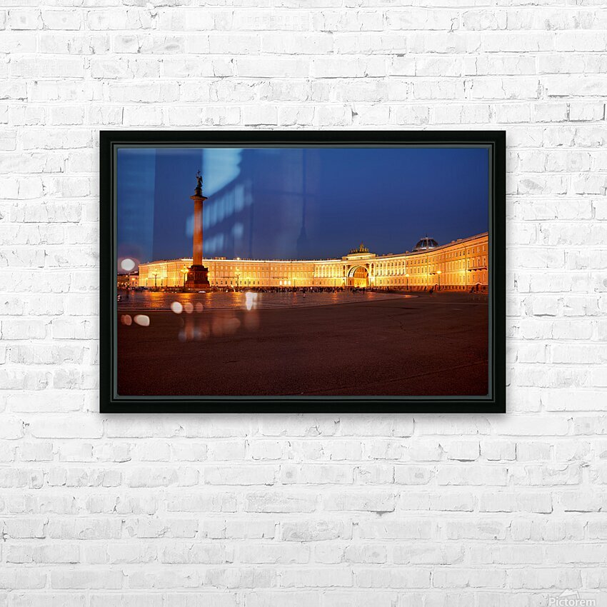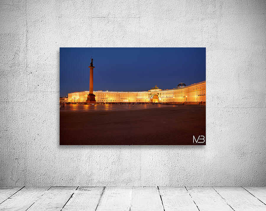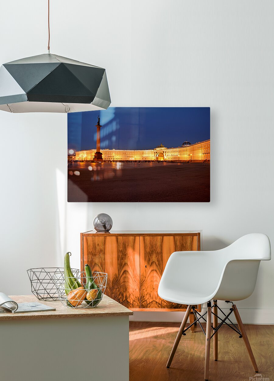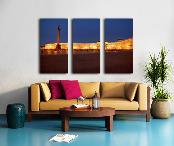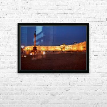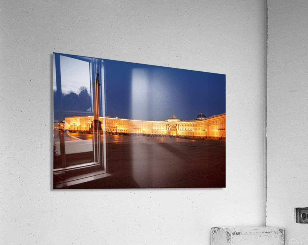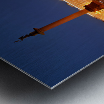 The Winter Palace stands tall in Palace Square lit warmly under the night sky with the Alexander Column nearby and people walking around.