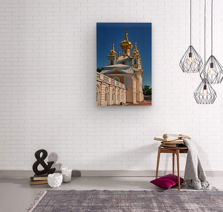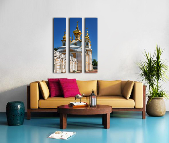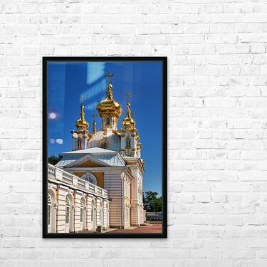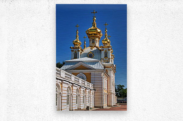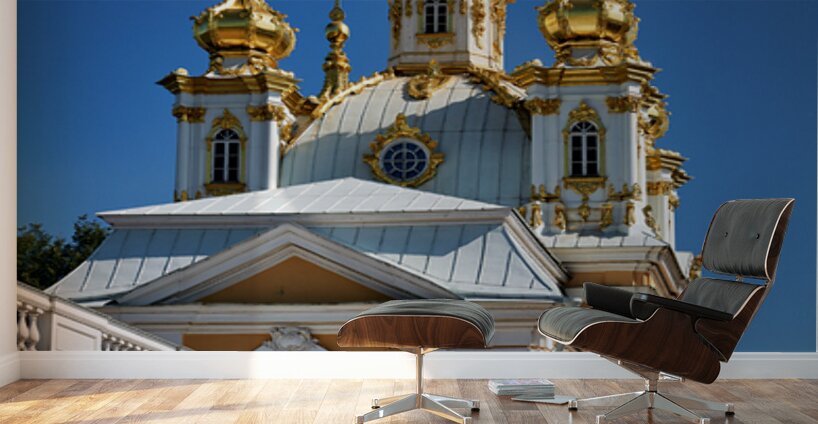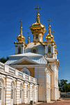 Peterhof Palace features golden domes shining in sunlight. Visitors admire the architecture and enjoy the clear blue sky in St. Petersburg.