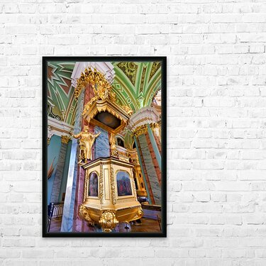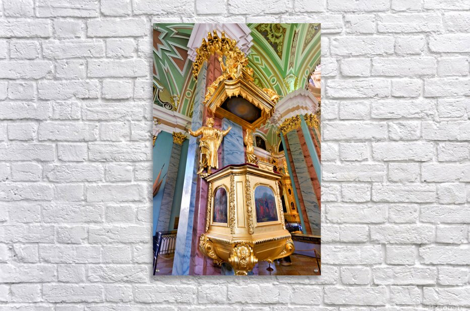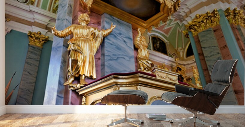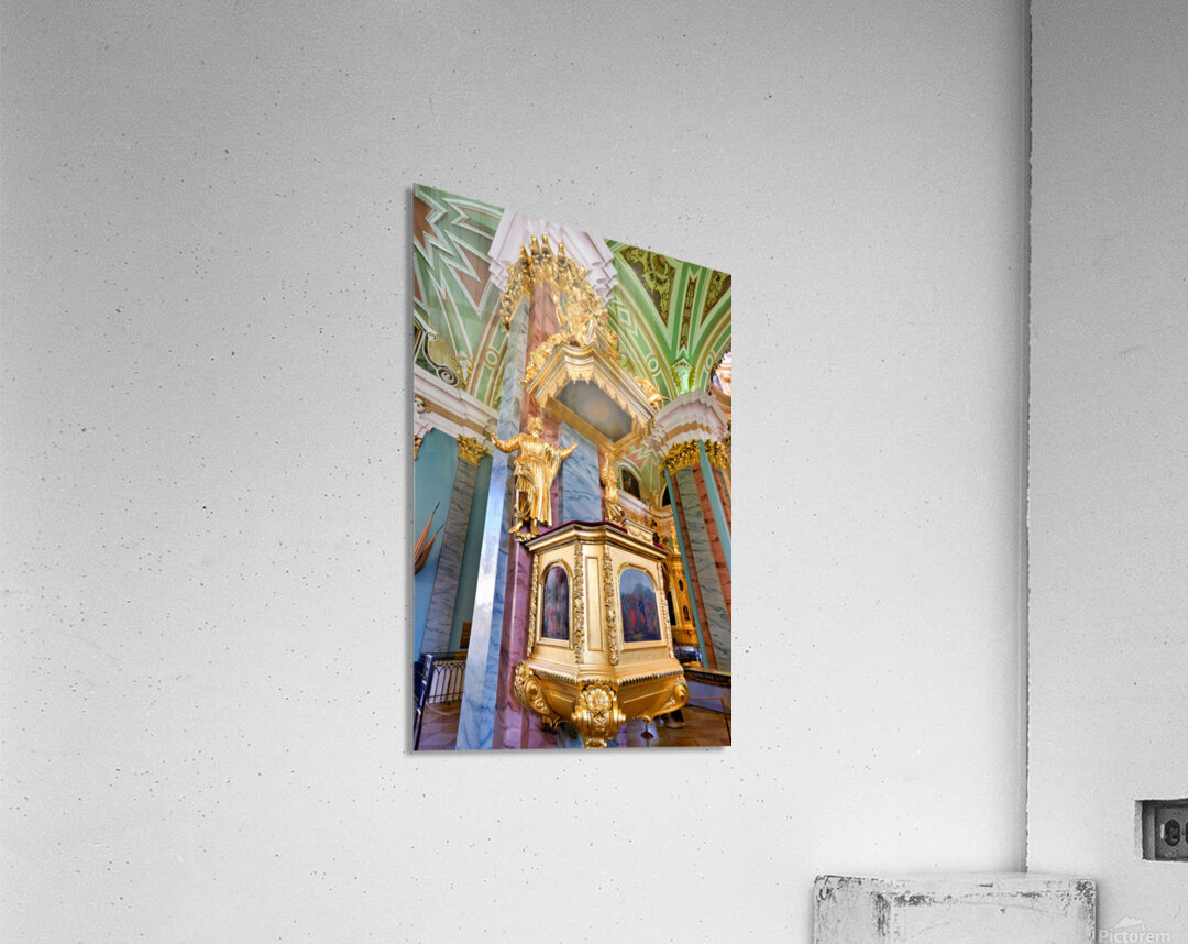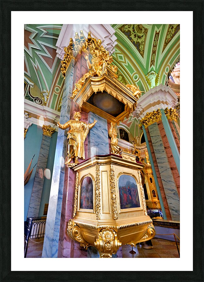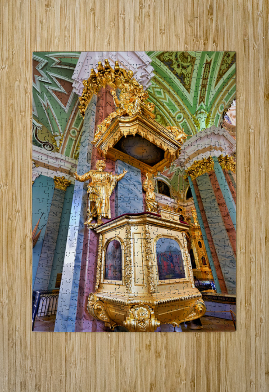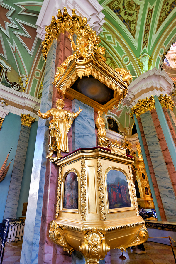 Visitors admire the intricate design of Peter and Paul Cathedral inside Peter and Paul Fortress in St. Petersburg. The rich details capture attention.