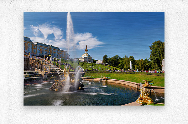 Get this artwork "Visitors admire the fountains at Peterhof Palace" in a framed print.