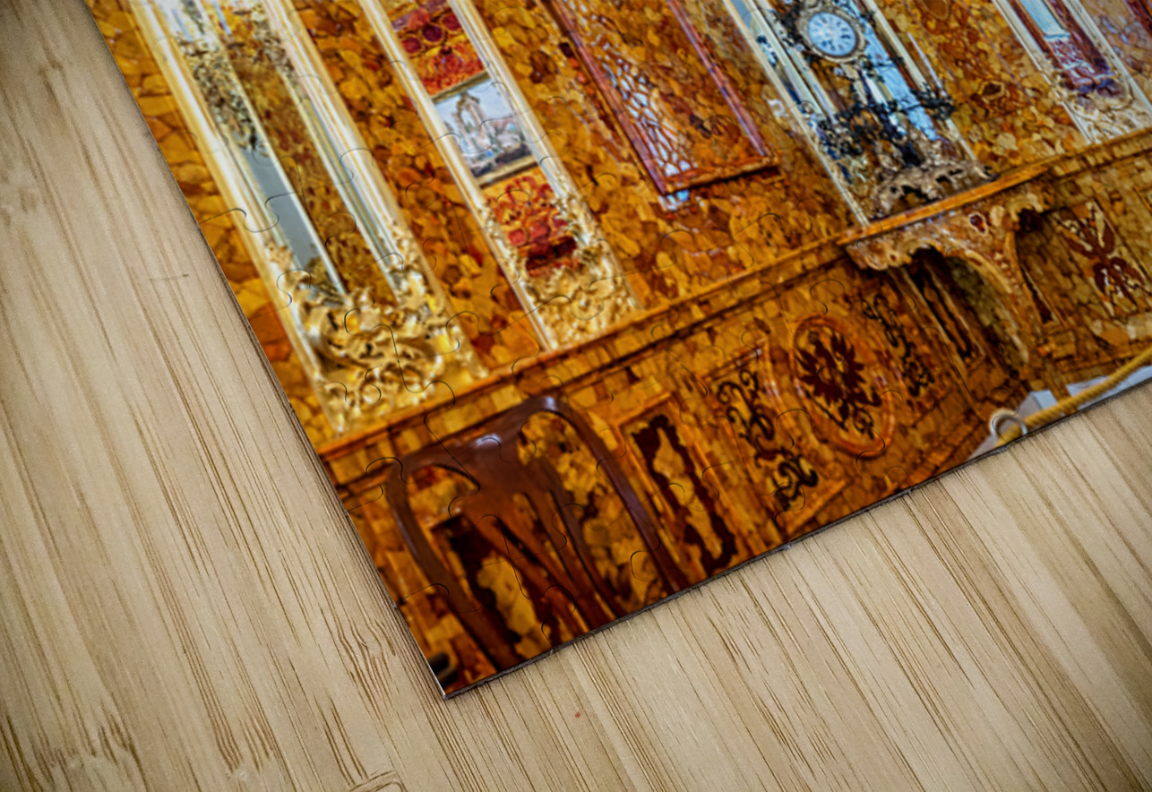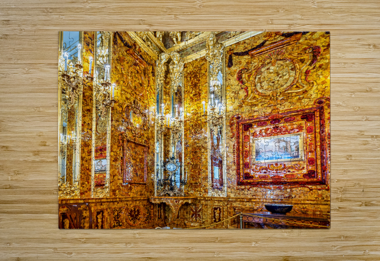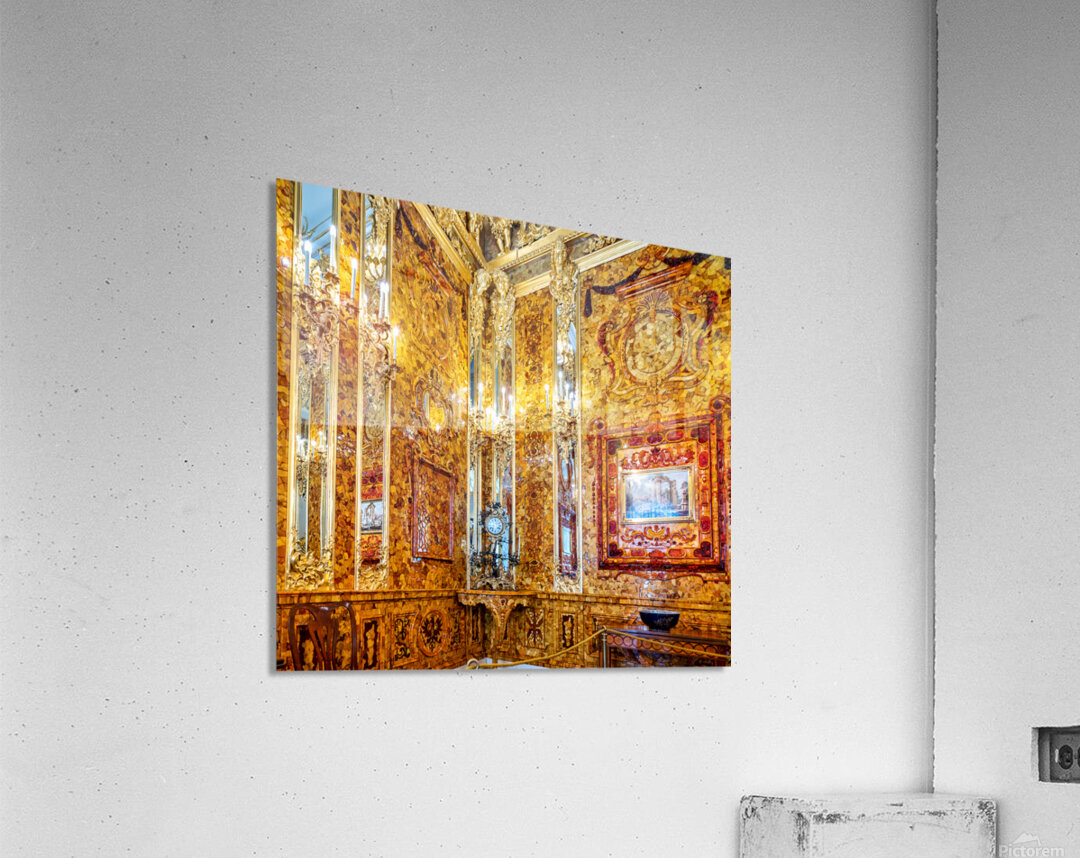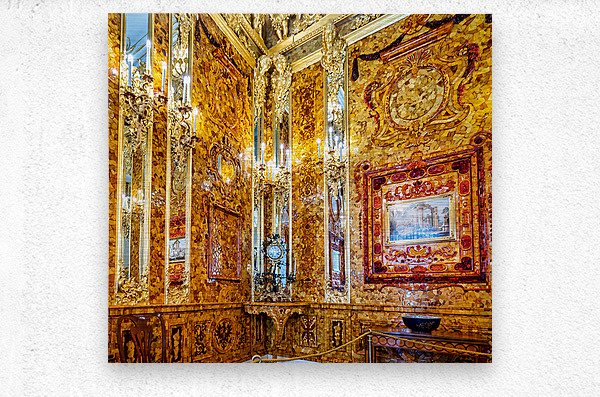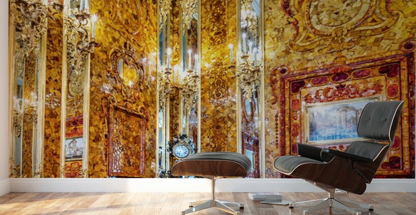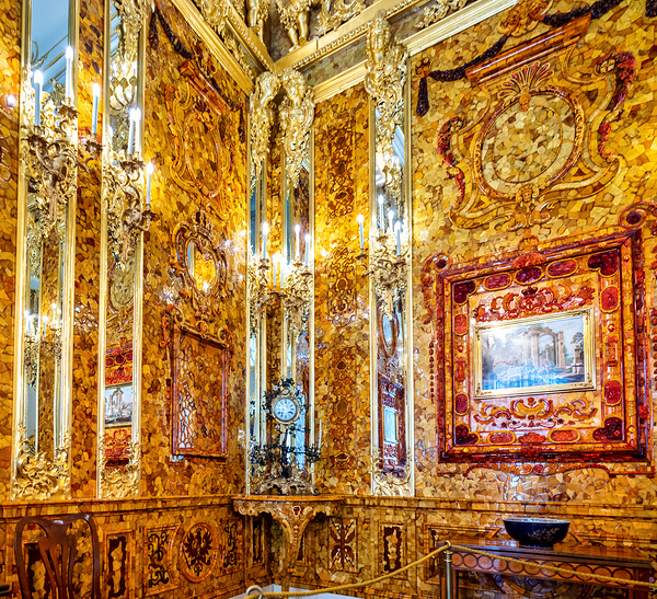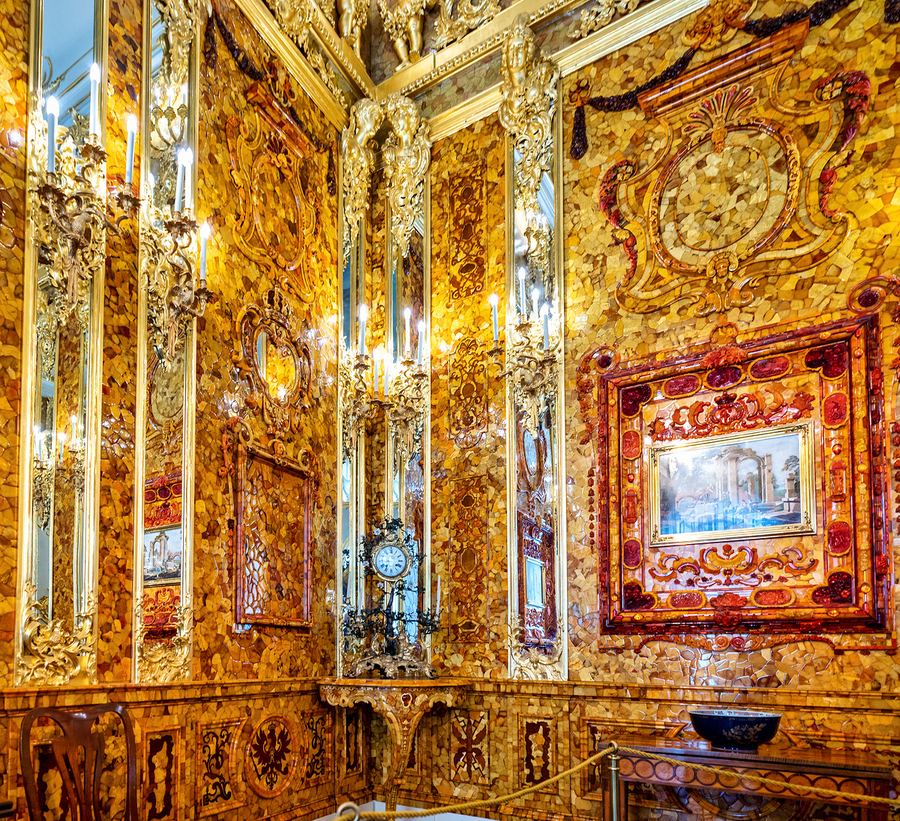 Visitors explore the amber room in Catherine Palace admiring its bright designs and rich history in St. Petersburg Russia.