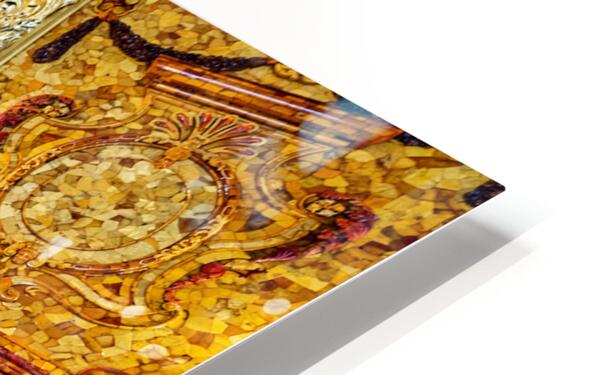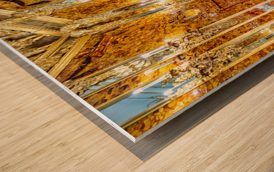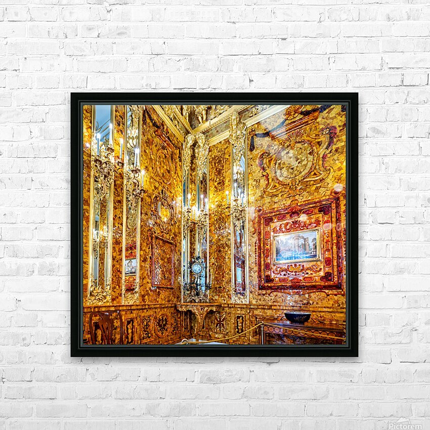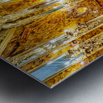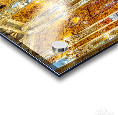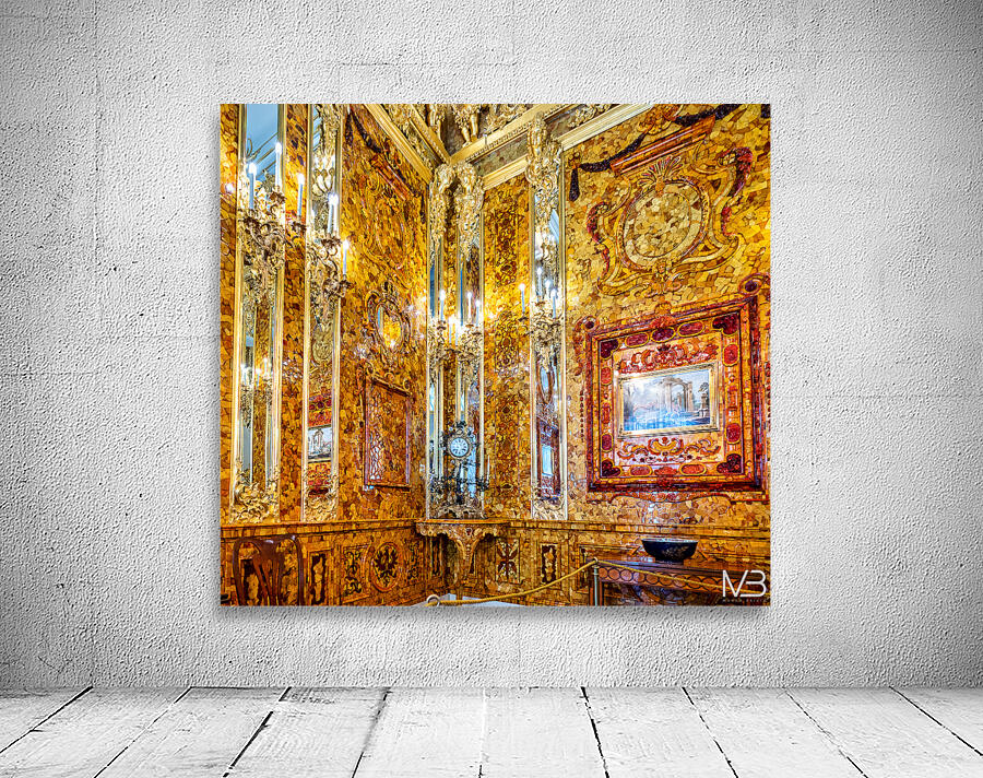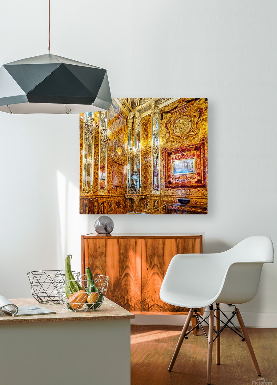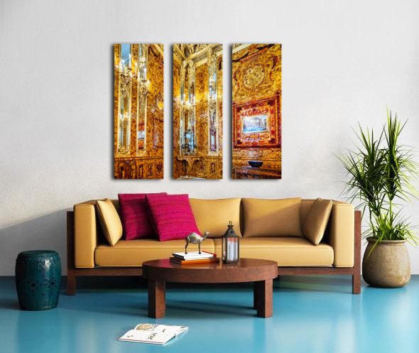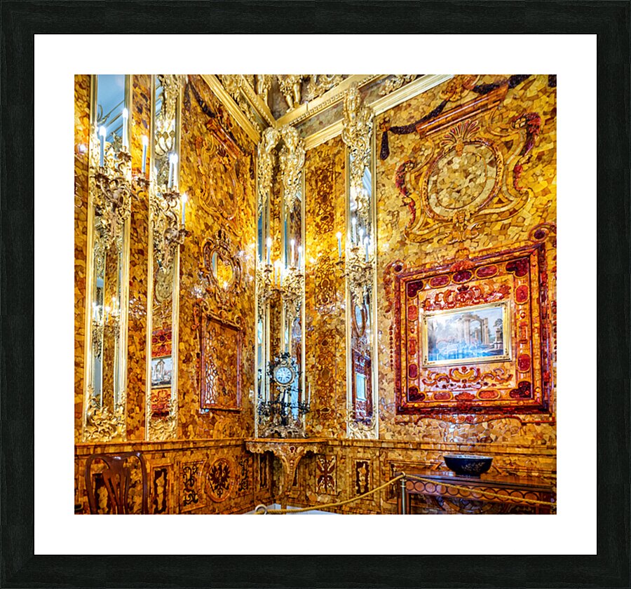 Visitors explore the amber room in Catherine Palace admiring its bright designs and rich history in St. Petersburg Russia.