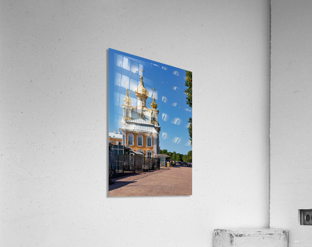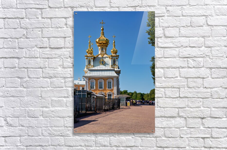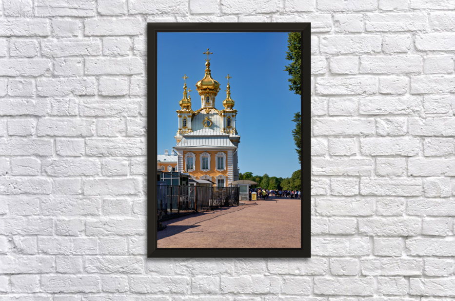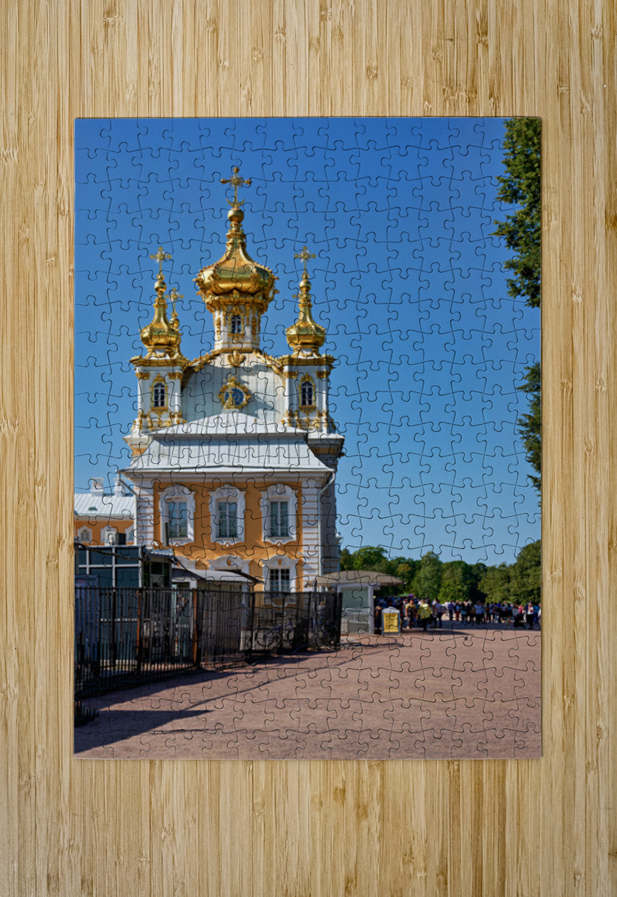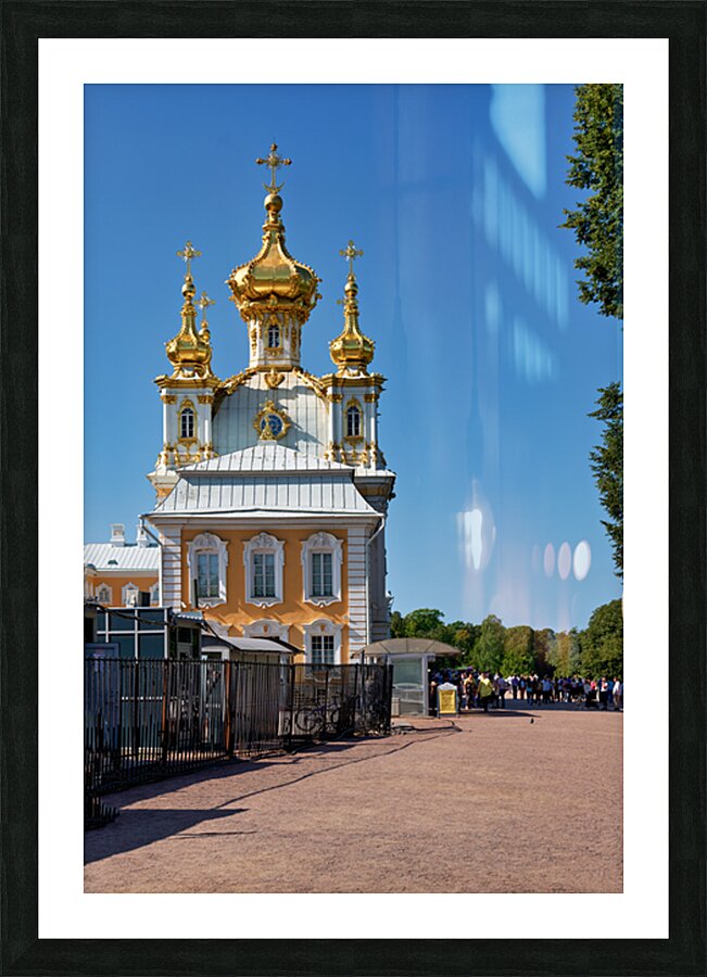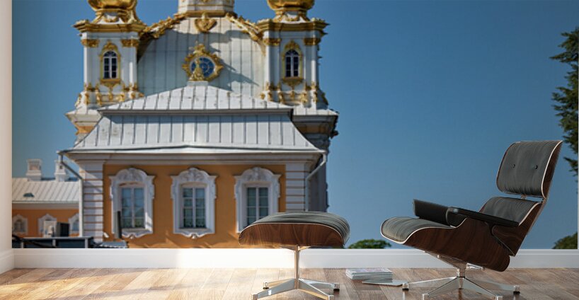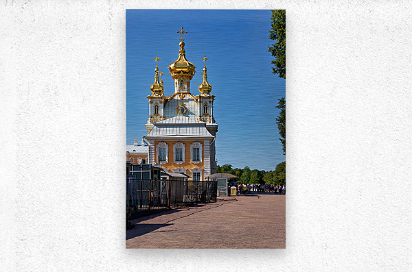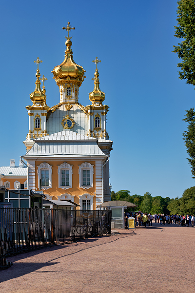 People gather outside Peterhof Palace in Saint Petersburg Russia under a clear blue sky. The palace stands with its golden domes shining brightly.
