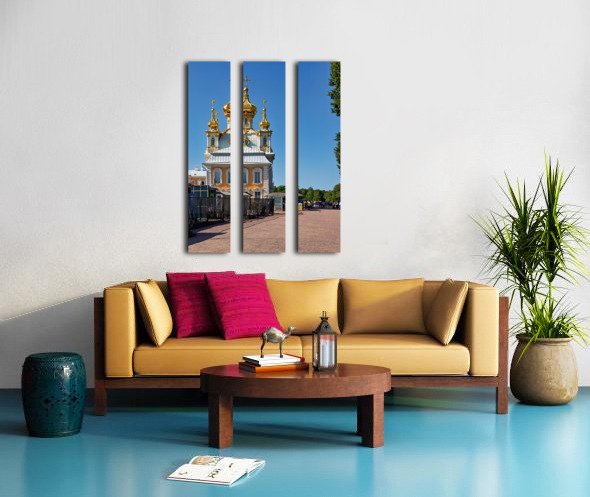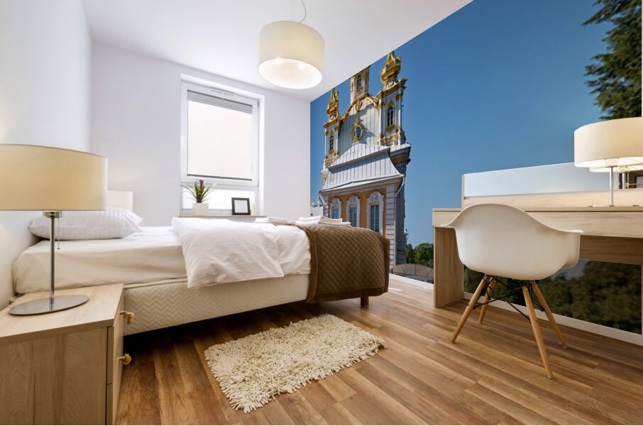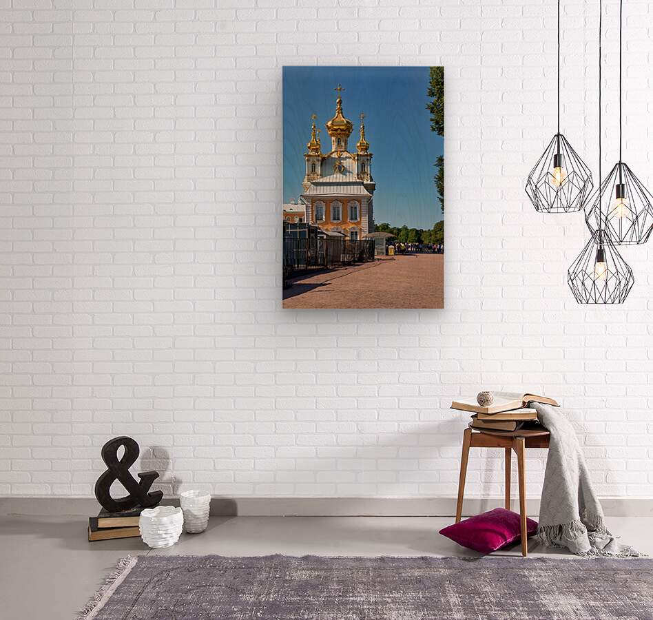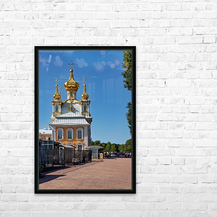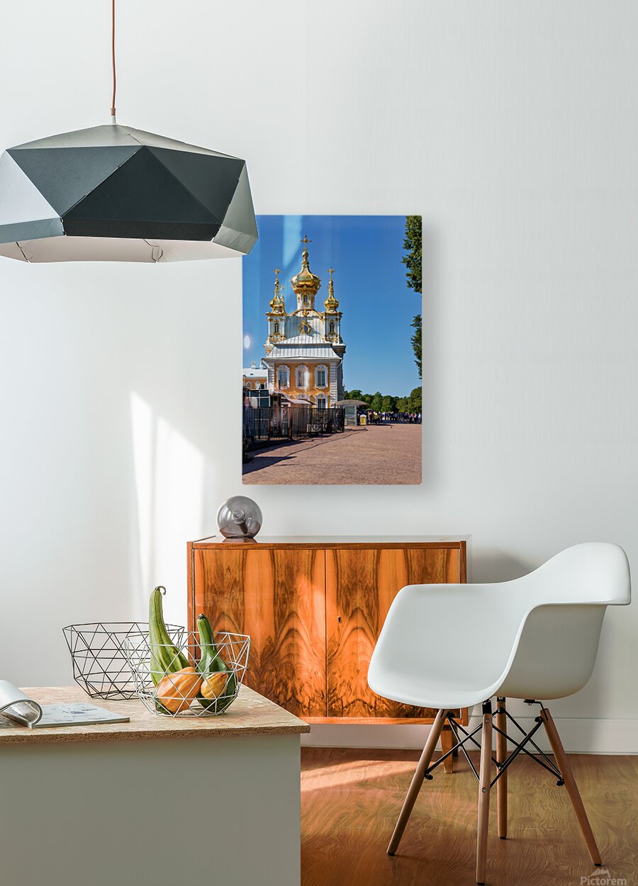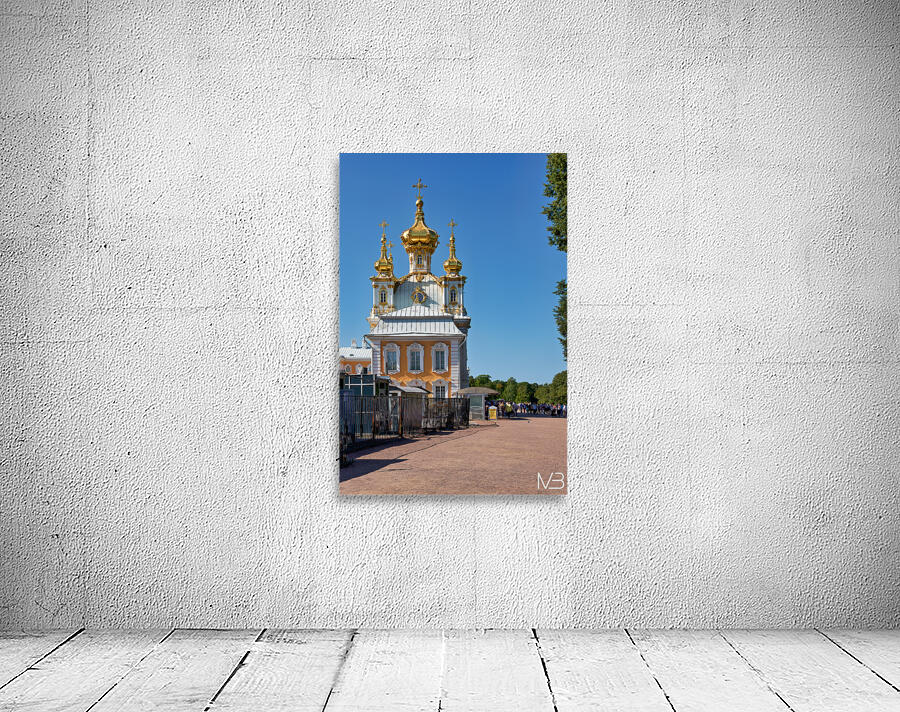 People gather outside Peterhof Palace in Saint Petersburg Russia under a clear blue sky. The palace stands with its golden domes shining brightly.