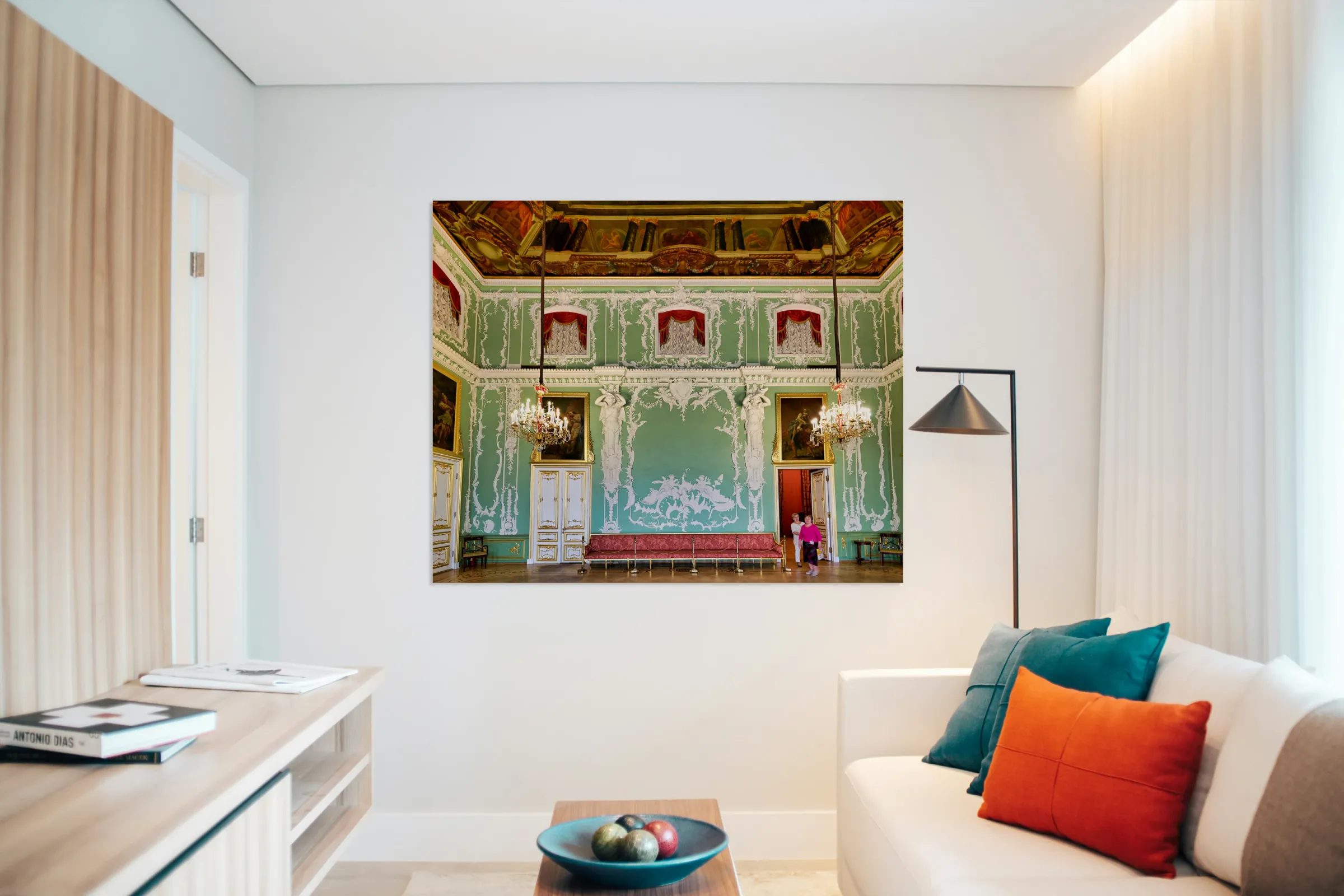 Two people walk through the Stroganov Palace observing the art and decor within the room. The space shows beautiful design elements.