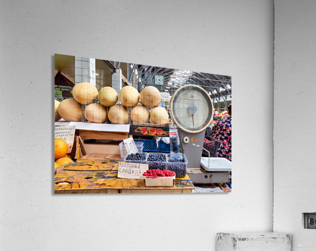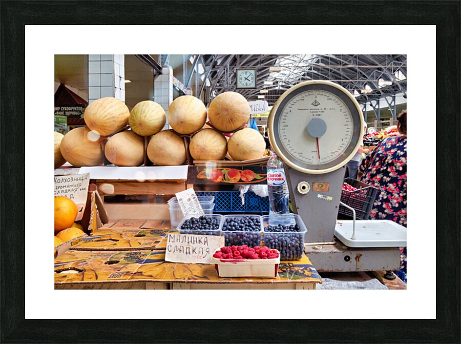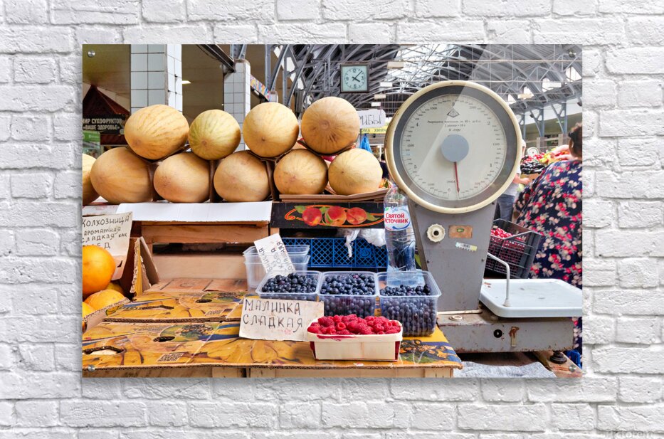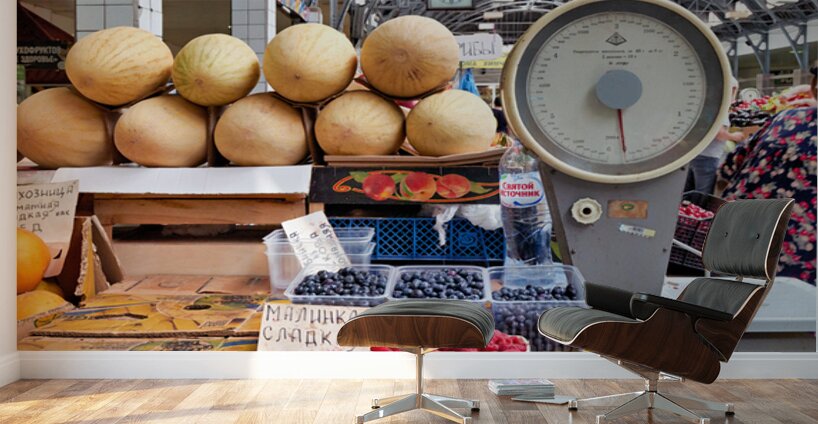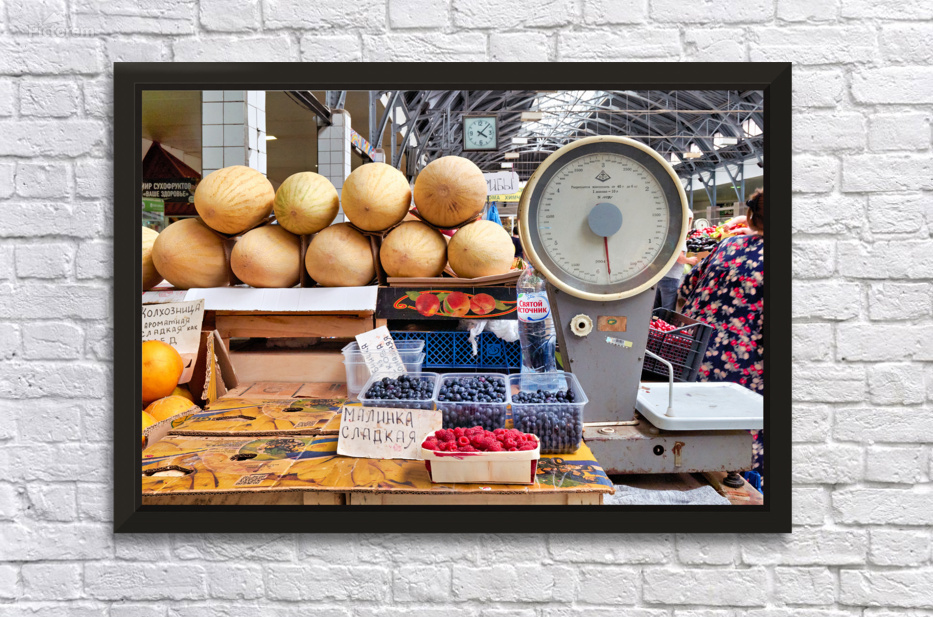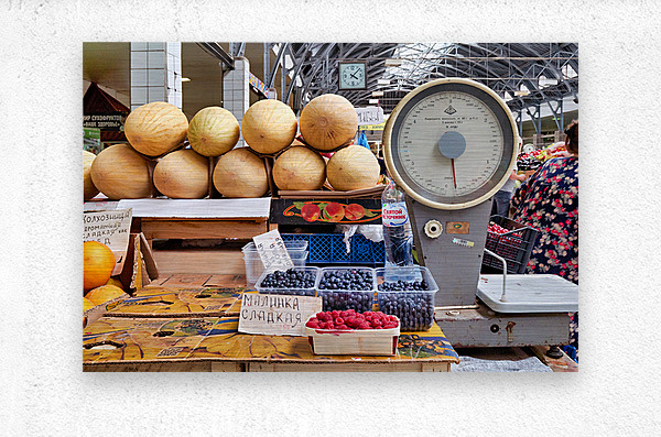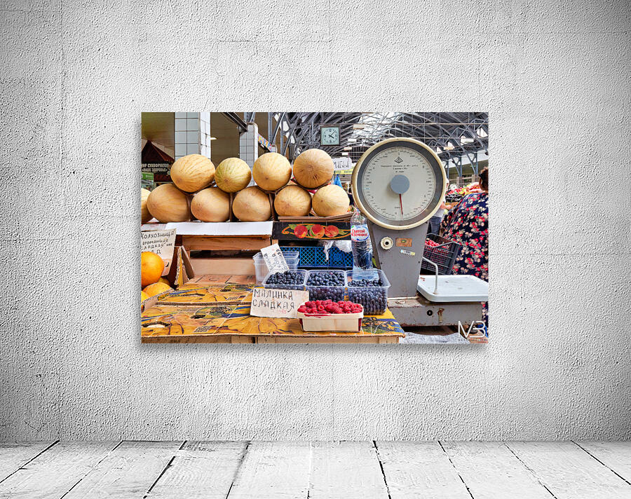 Visitors browse stands of fresh fruits and vegetables at Kuznechnyy Rynok Market in Saint Petersburg Russia during a busy day.