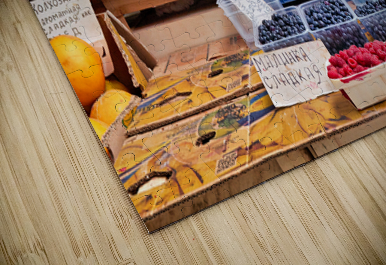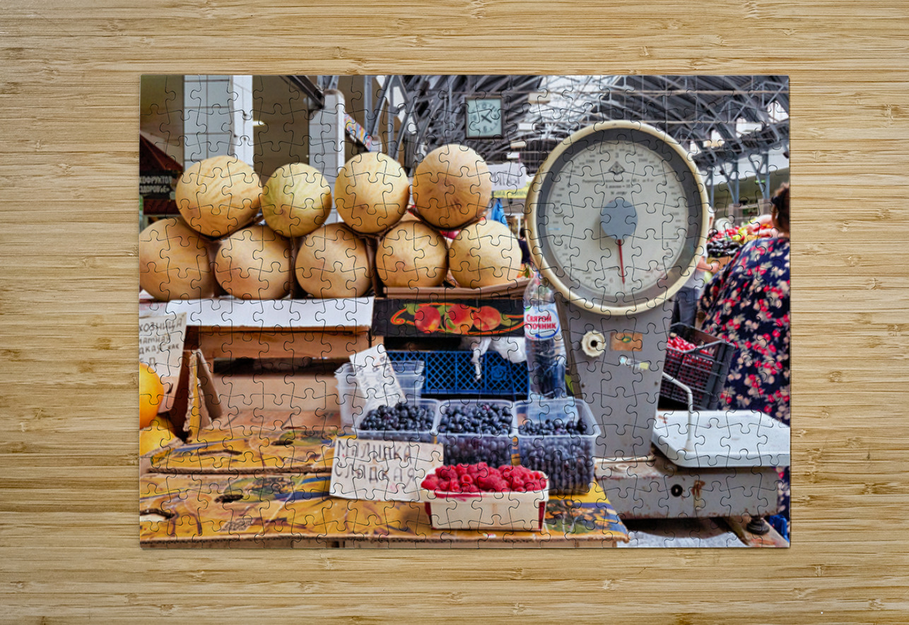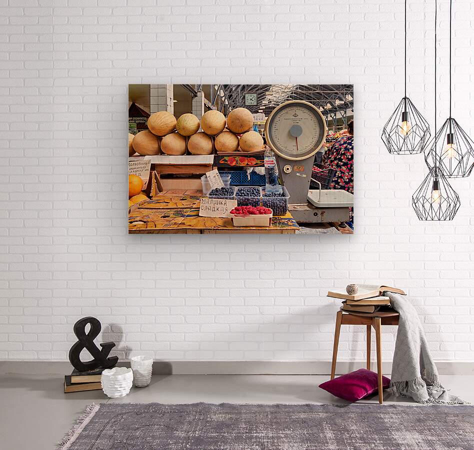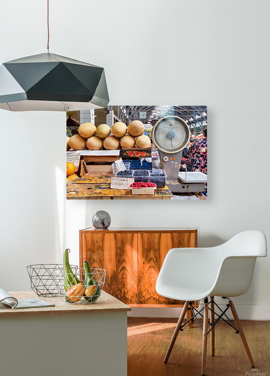 Visitors browse stands of fresh fruits and vegetables at Kuznechnyy Rynok Market in Saint Petersburg Russia during a busy day.