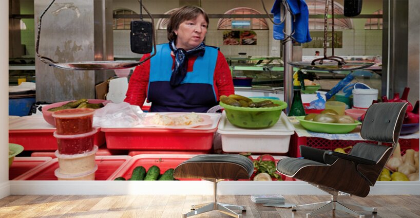A vendor stands at her stall in Kuznechnyy Rynok Market selling fresh vegetables and sauces to customers in Saint Petersburg.