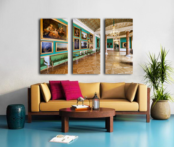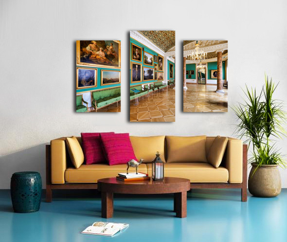 Visitors walk through Stroganov Palace in St. Petersburg viewing art in a well-designed room with colorful walls and beautiful furniture.
