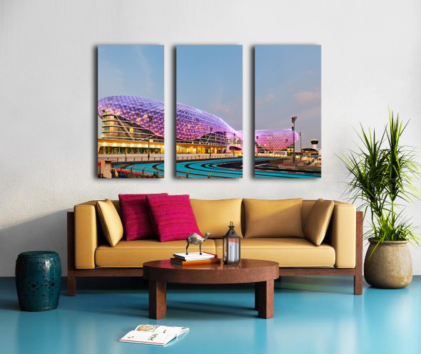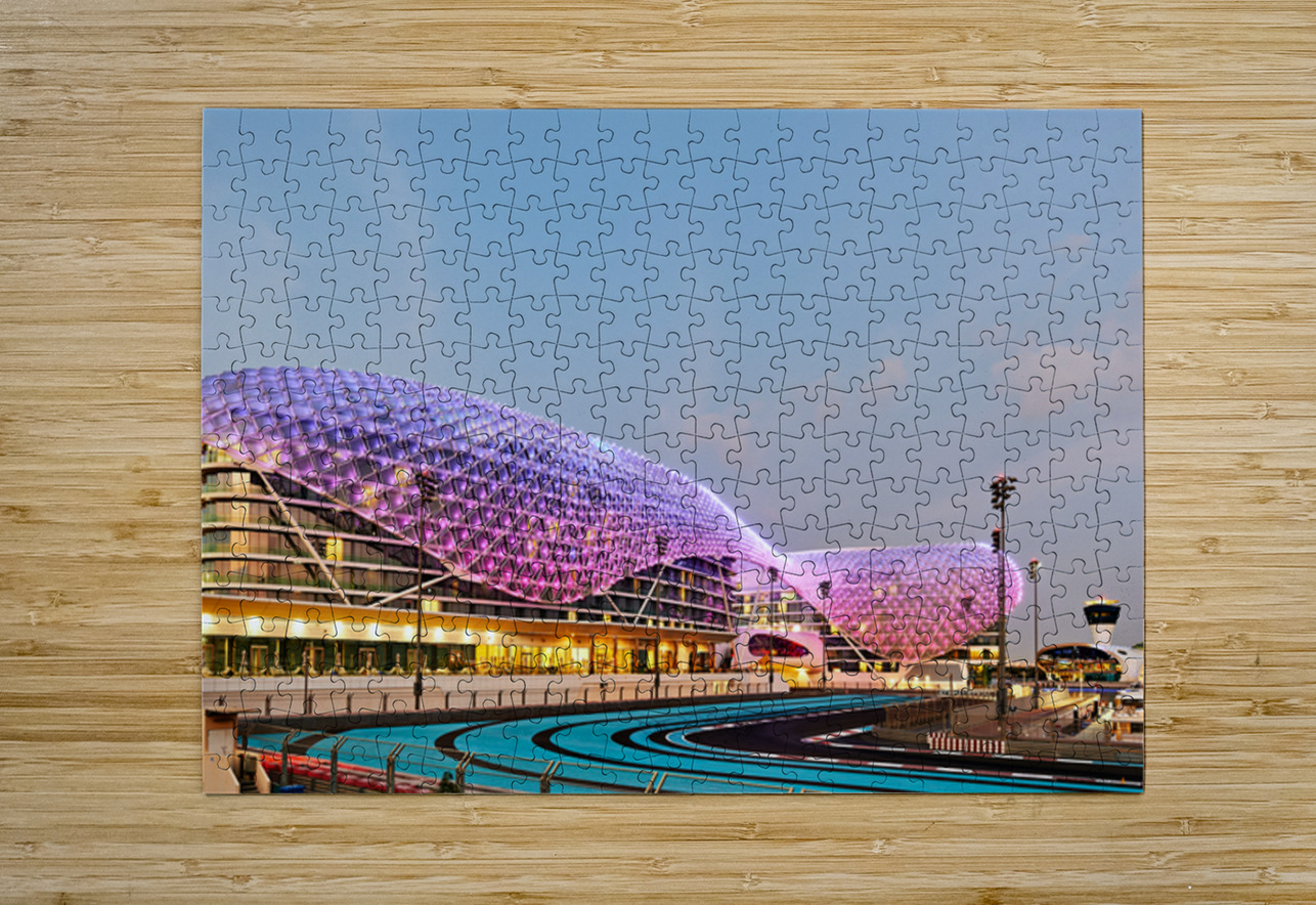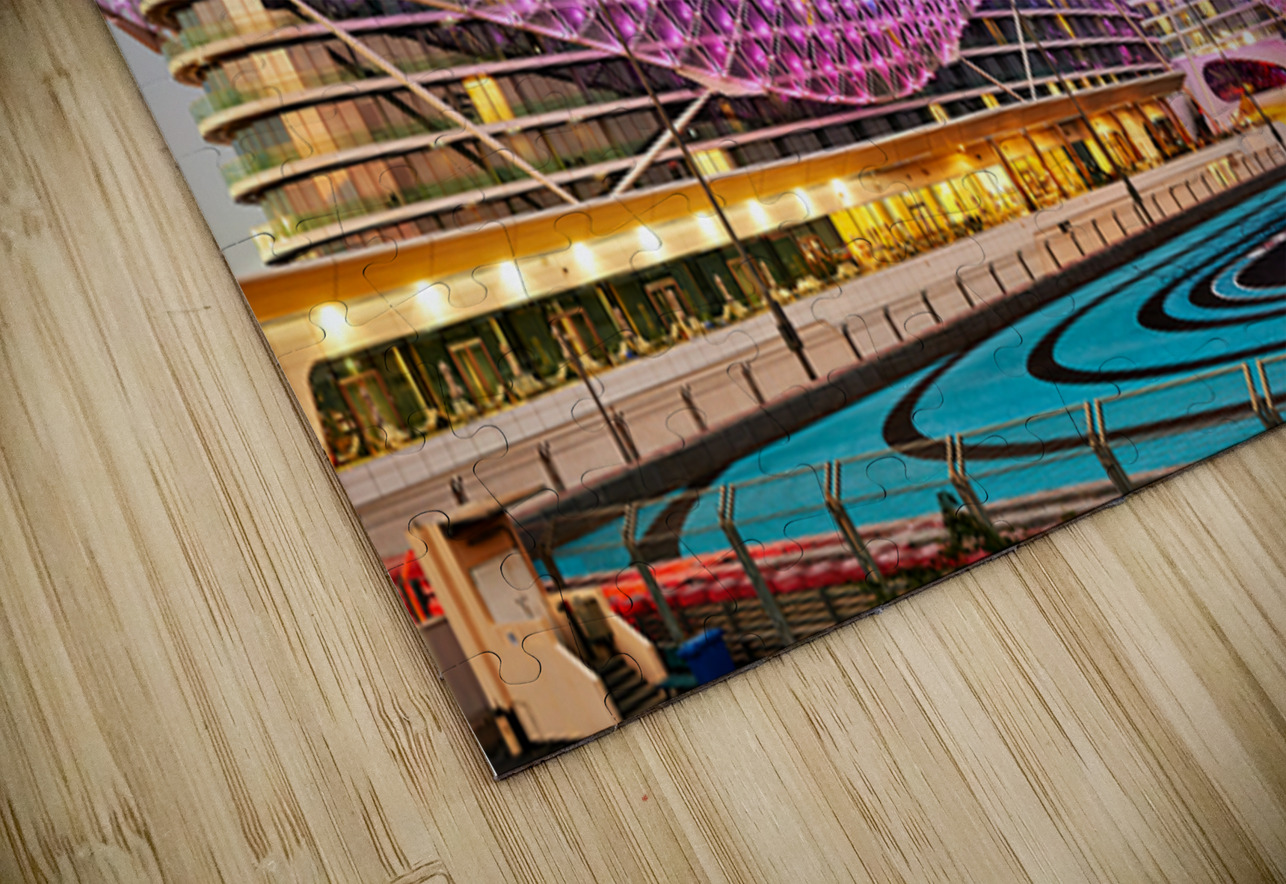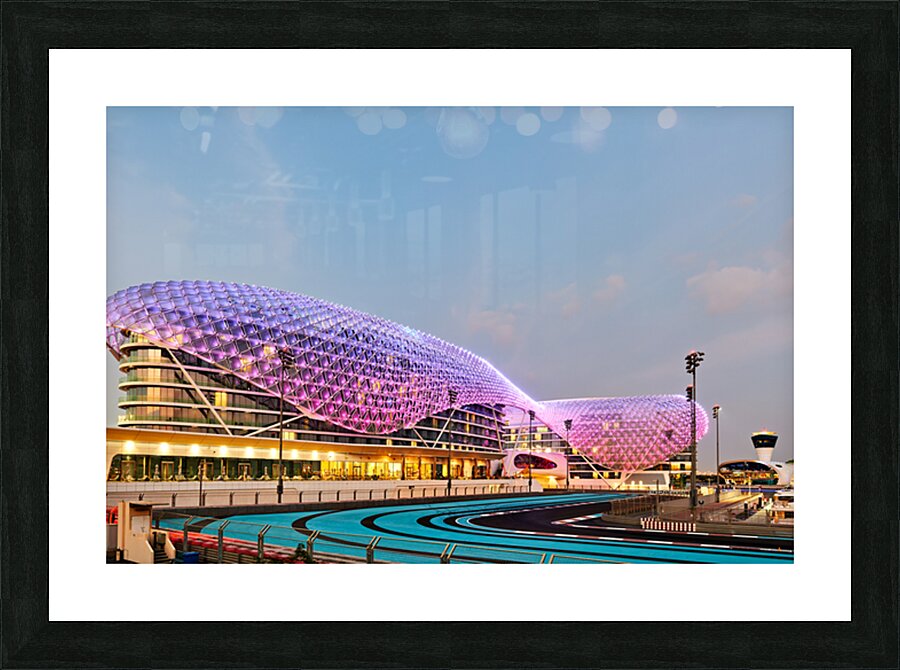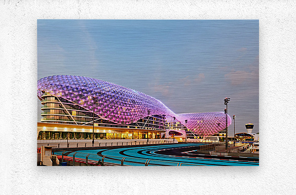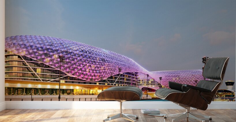 W Abu Dhabi hotel glows at night on Yas Island. The iconic structure is near the race track. Many lights create a vibrant scene in the area.