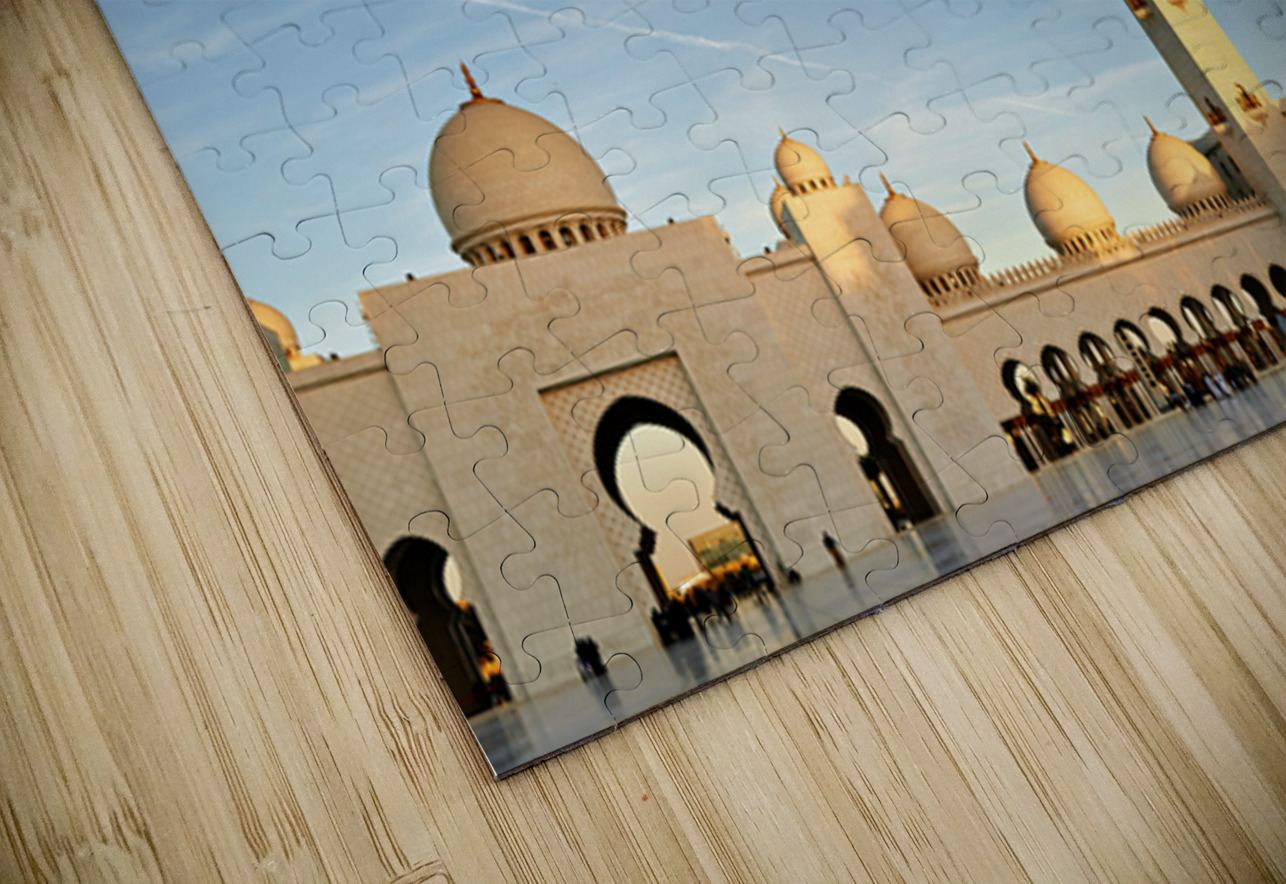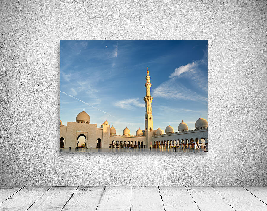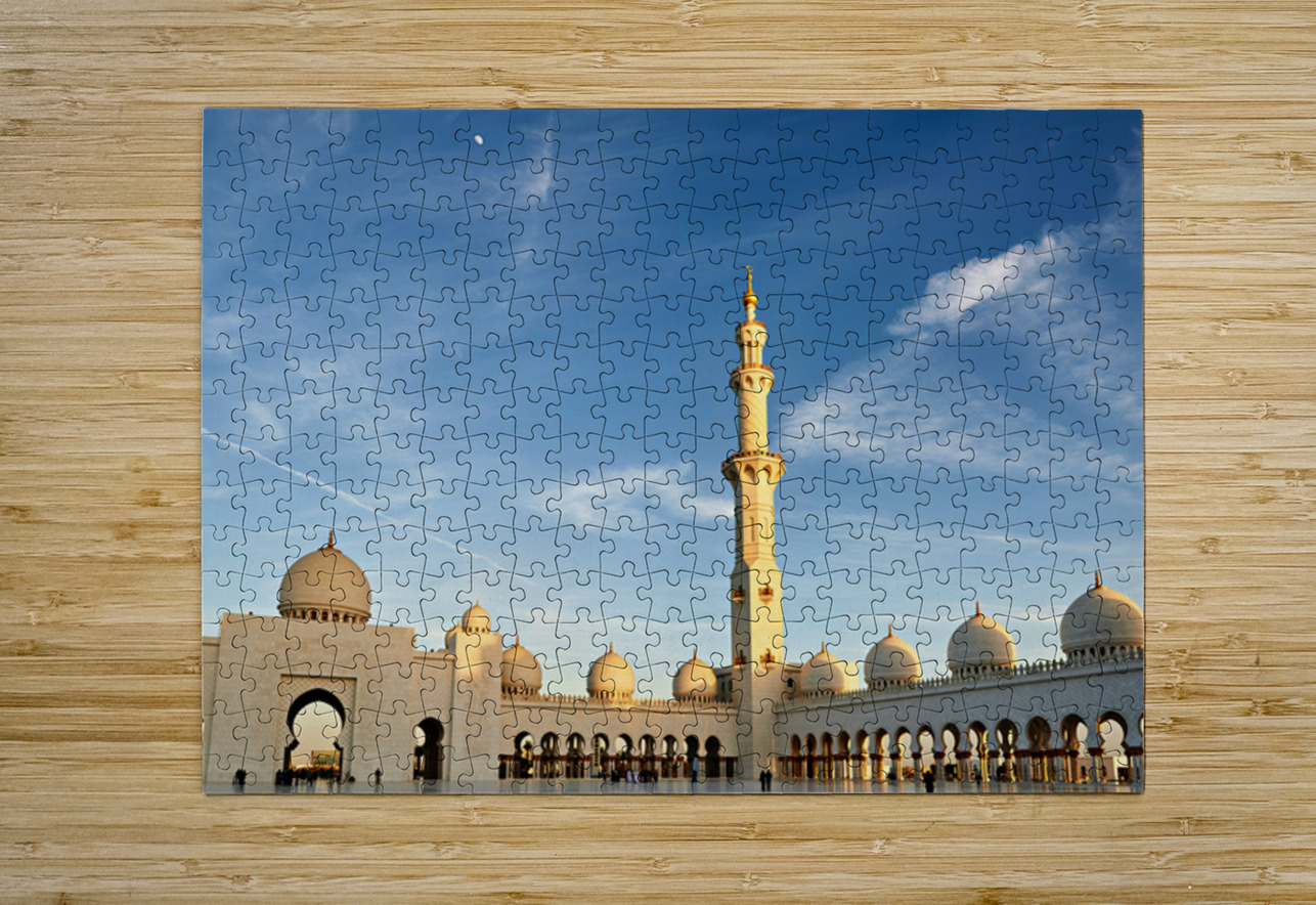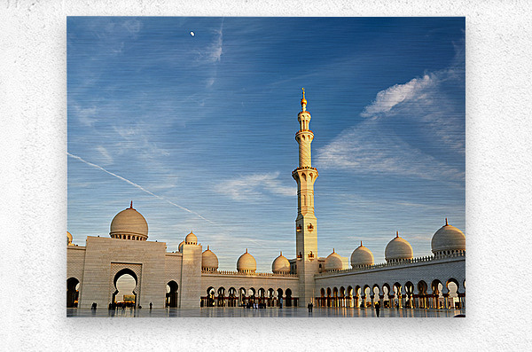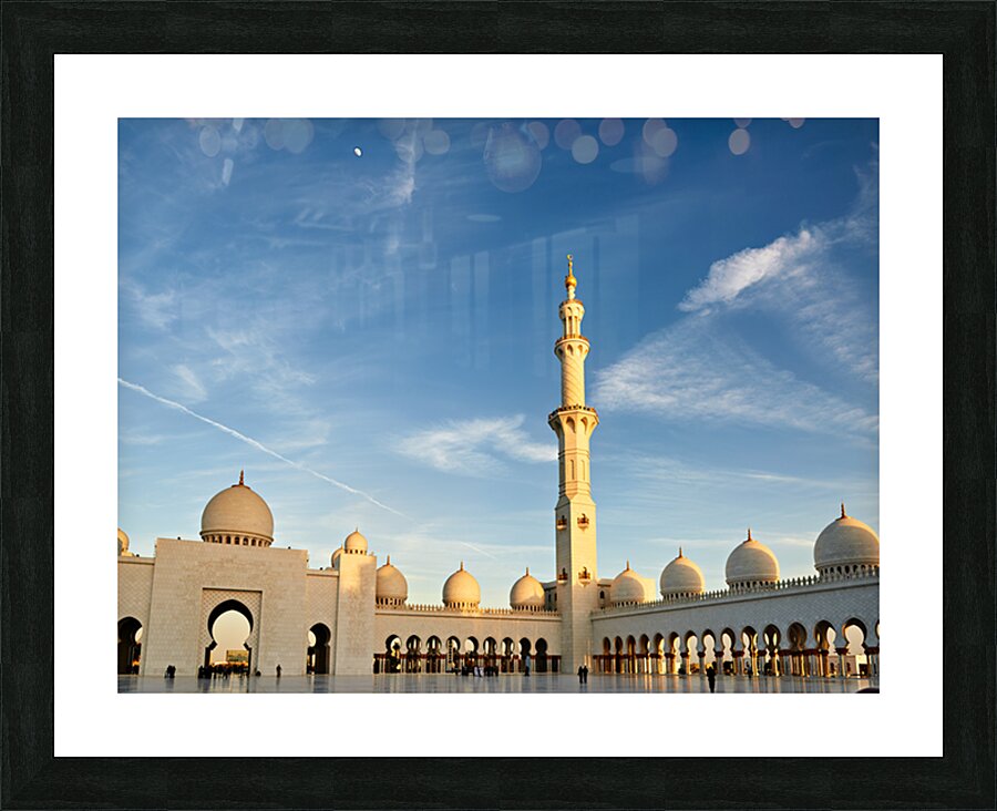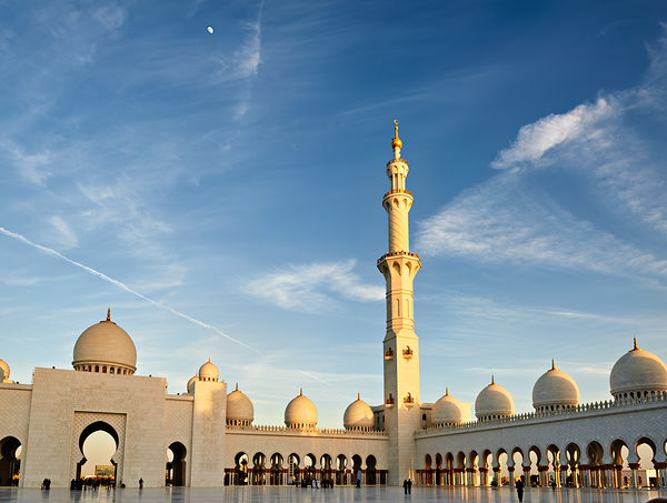 People gather and explore the Sheikh Zayed Grand Mosque in Abu Dhabi during sunset. The tall minaret and architecture attract visitors.