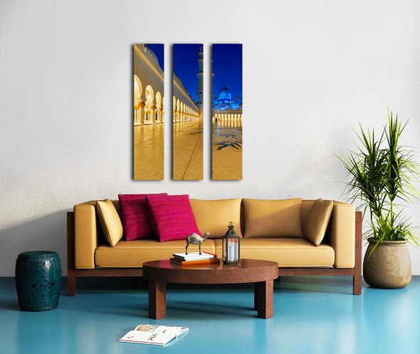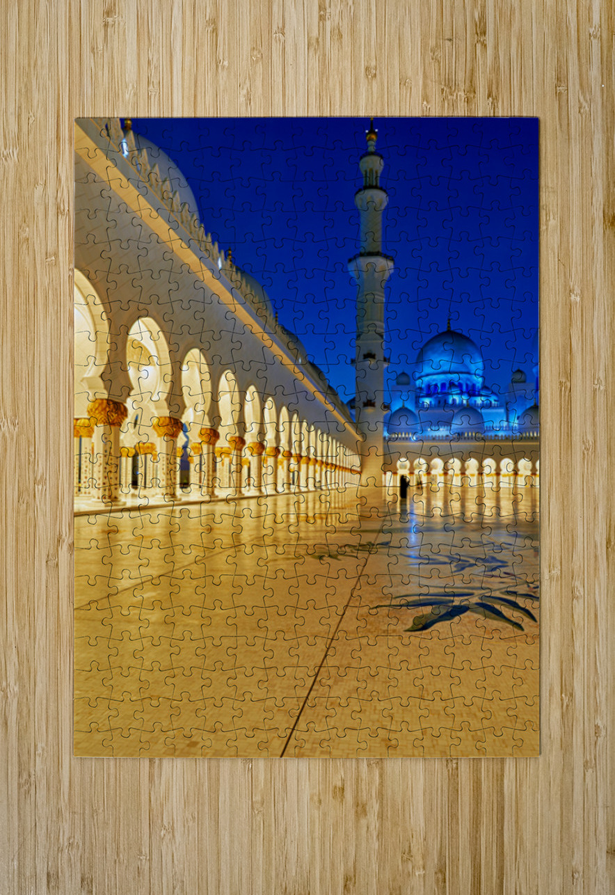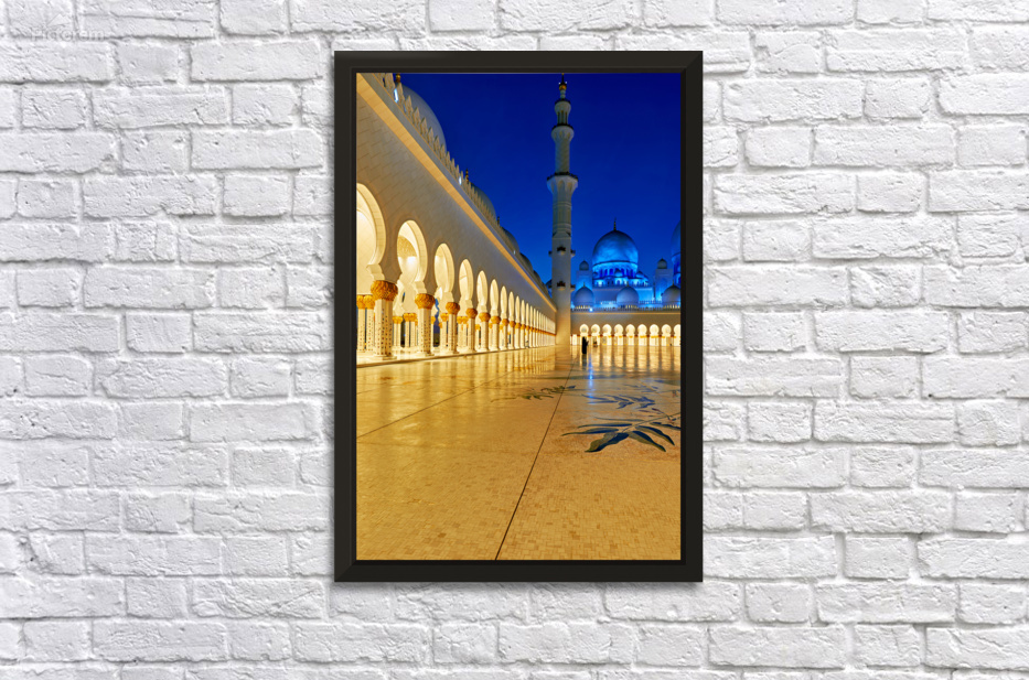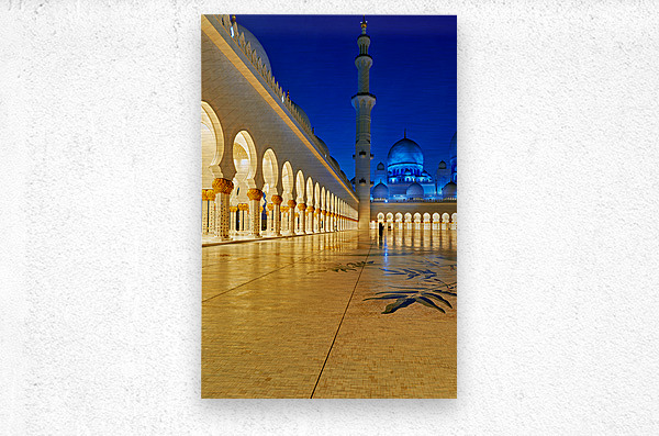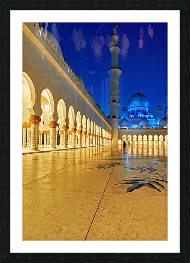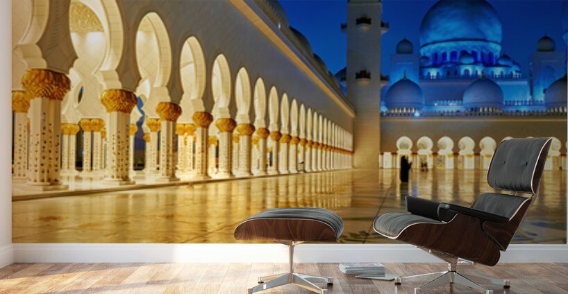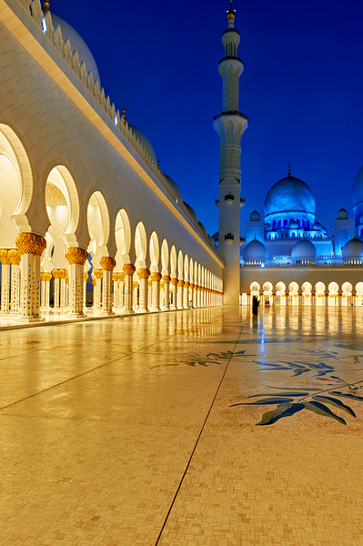 People walk through the arches of Sheikh Zayed Grand Mosque in Abu Dhabi. The mosque is lit at night creating an inviting atmosphere.