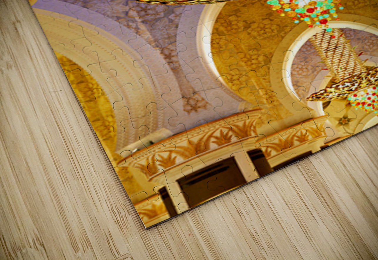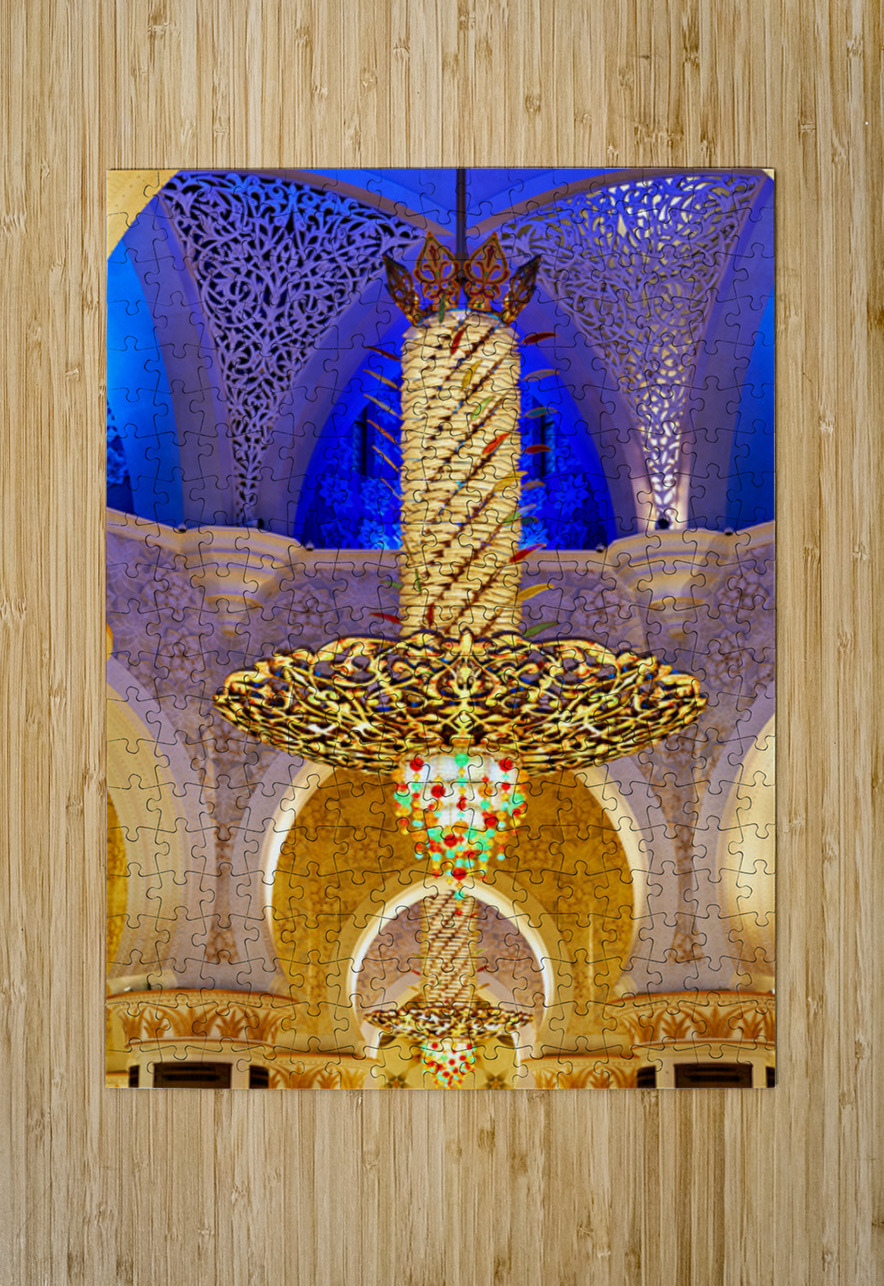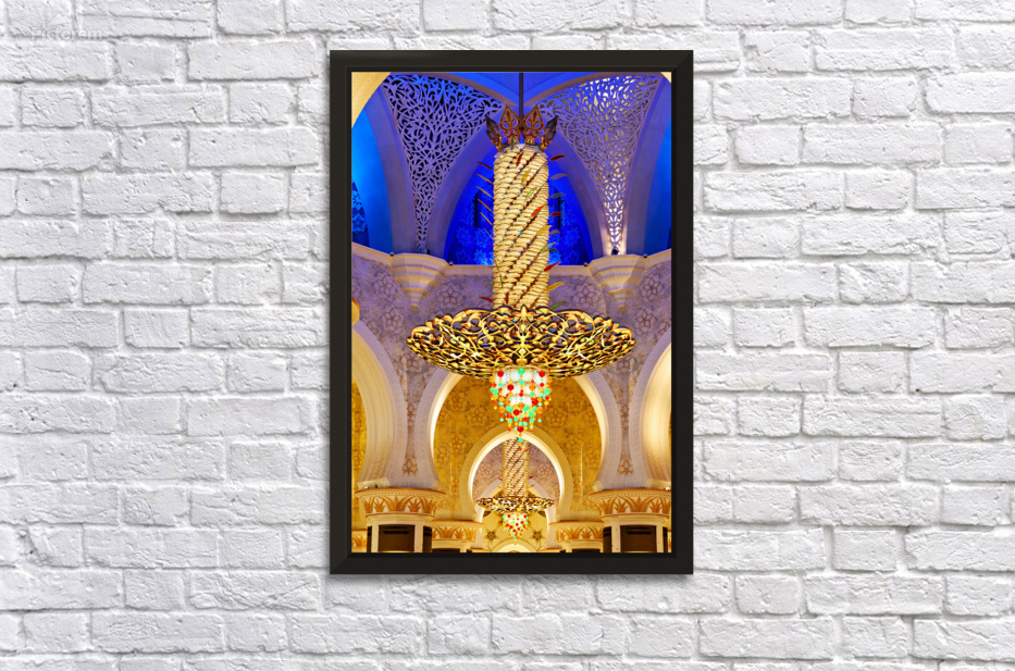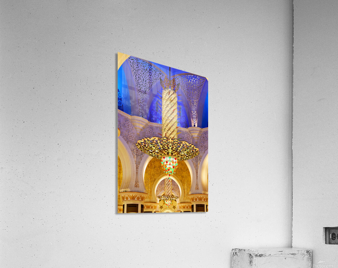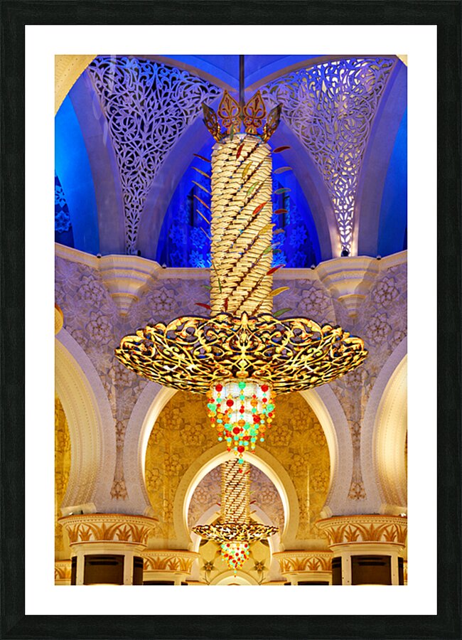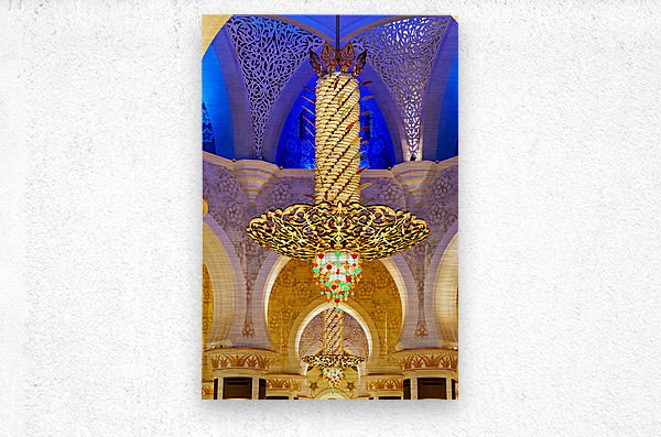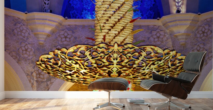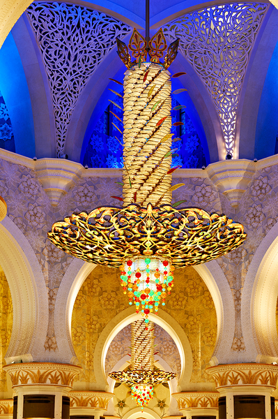 Visitors look at the light fixture in Sheikh Zayed Grand Mosque. This structure showcases detailed design and bright colors.