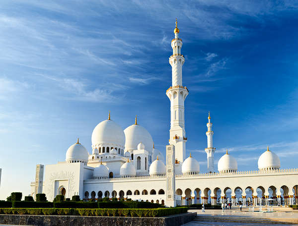 People explore the Sheikh Zayed Grand Mosque in Abu Dhabi. The sky is blue and the mosque features large domes and tall minarets.