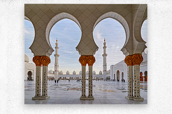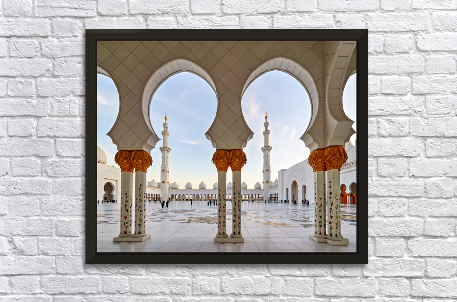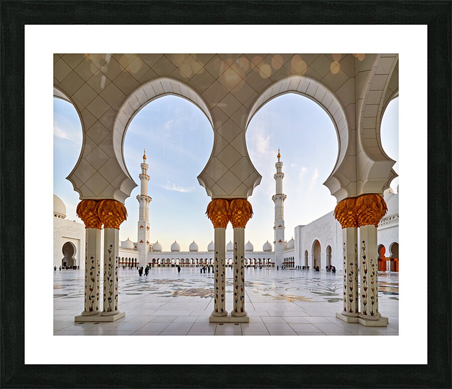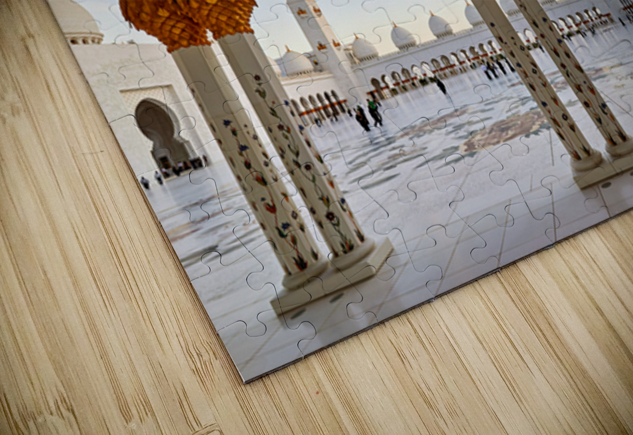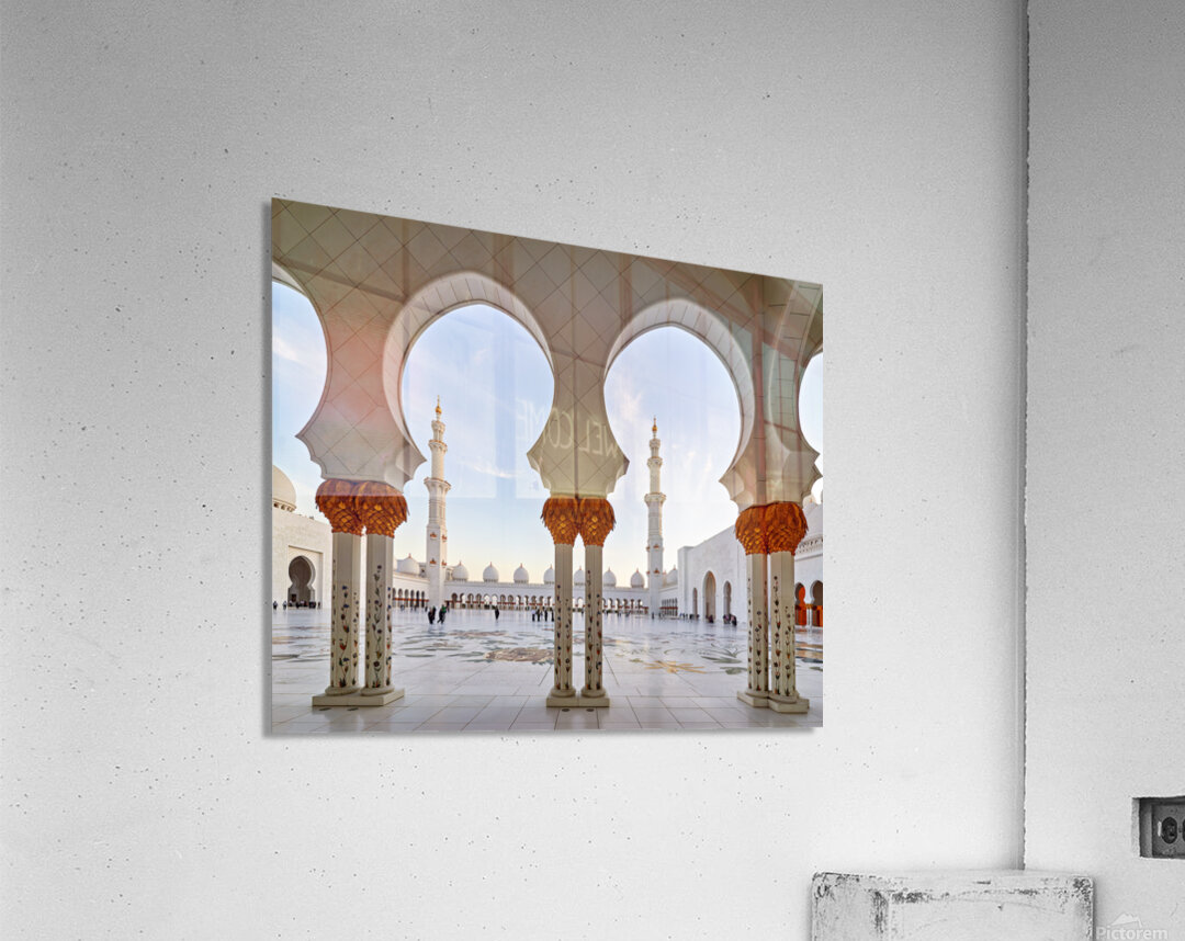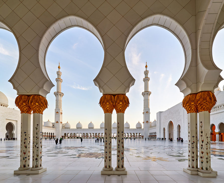 People walk through the courtyard of Sheikh Zayed Grand Mosque in Abu Dhabi during sunset. The unique architecture stands tall around them.
